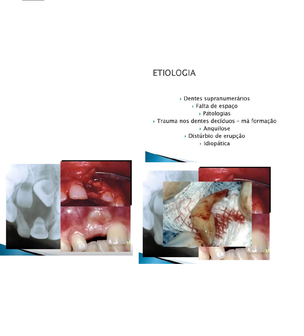 <p>CIRURGIA EM PEDIATRIA II | Thaís de Freitas Sena</p><p>Cirurgia em Odontopediatria II</p><p>-Incluso</p><p>-Impactado</p><p>Existem anomalias que envolvem a erupção dos ICS, e a erupção desses dentes ocorre na fase</p><p>da infância, na média de idade de 7 a 9 anos, em umas mais recentes e outras mais tardias. Não</p><p>é incomum encontrar essa condição, da erupção do dente 11, e a falta de erupção do dente 21</p><p>Causas disso:</p><p>Etiologia</p><p>• Dentes supranumerários</p><p>• Falta de espaço – mais incomum</p><p>• Patologias - cisto dentígero</p><p>• Trauma nos dentes decíduos – levam a má formação no germe do dente permanente</p><p>• Anquilose</p><p>• Distúrbio da erupção</p><p>• Idiopática</p><p>Essa criança tinha sofrido um trauma no dente</p><p>51, levou a formação de um cisto dentígero,</p><p>deslocando o germe do dente 21, e se nada for</p><p>feito, esse dente vai ficar impactado, gerando</p><p>uma perturbação no desenvolvimento da</p><p>oclusão. Aqui um odontoma, e uma</p><p>dilaceração (observem nessa parte mais</p><p>isquêmica, a incisal do dente 11 aqui)</p><p>Um simples trauma na dentição decídua, podendo gerar um grau de perturbação gigantesco no</p><p>desenvolvimento do germe do dente permanente</p><p>Planejamento</p><p>-Diagnóstico precoce</p><p>CIRURGIA EM PEDIATRIA II | Thaís de Freitas Sena</p><p>• Rx panorâmico</p><p>• Controle dos pacientes após trauma</p><p>-Planejamento multidisciplinar</p><p>• Odontopediatra</p><p>• Cirurgião</p><p>• Ortodontista</p><p>Temos como protocolo fazer radiografia</p><p>panorâmica de todos os pacientes, quando eles</p><p>entram na fase de período inter-transicional (fase</p><p>em que irrompeu os permanentes centrais).</p><p>Qualquer distúrbio que você note na sequência de</p><p>erupção desses dentes, indica a necessidade de</p><p>uma radiografia. Daí a importância de vocês terem em mente, a sequência de erupção dos</p><p>dentes, para que qualquer alteração nessa sequência, vocês possam intervir. Ex: um paciente</p><p>que irrompeu todos os IC inferiores, irrompeu o 21, 22 e o 12, e o 11 não irrompeu, tem uma</p><p>sequência errada. Normalmente, irrompe o IC e depois o IL, daí a importância de sabermos o</p><p>processo de erupção dos dentes</p><p>Em alguma situação vamos precisar do planejamento multidisciplinar (odontopediatra, cirurgião</p><p>e ortodontista).</p><p>Quando intervir</p><p>• Idade-cooperação - para a realização de</p><p>procedimento mais complexos, deve-se levar</p><p>em consideração a idade e cooperação do</p><p>paciente. Para a realização de procedimentos</p><p>mais complexos, como anestesia e</p><p>procedimentos cirúrgicos, o paciente deve</p><p>estar bem envolvido, aceitando o ambiente</p><p>odontológico. Claro que se leva em</p><p>consideração a idade, mas, muito mais a</p><p>cooperação</p><p>• Desenvolvimento radicular dos dentes vizinhos – se existe risco de por alguma razão,</p><p>proximidade anatômica, e eu vir a lesar esses dentes que ainda estão em</p><p>desenvolvimento, essa cirurgia deveria ser adiada</p><p>• Condição da dentição – ideal é que ela seja feita quando a boca da criança já está</p><p>adequada, e diminuir o risco de infecção</p><p>• Condição sistêmica – a grande maioria dos pacientes que atendemos tem uma condição</p><p>sistêmica normal, e os procedimentos cirúrgicos que fazemos são de pequeno, no</p><p>máximo, médio porte</p><p>CIRURGIA EM PEDIATRIA II | Thaís de Freitas Sena</p><p>Para a inclusão de Incisivos permanentes,</p><p>devemos:</p><p>-Estabelecer a etiologia da inclusão/impacção</p><p>-O dente pode ser mantido ou deve ser removido</p><p>-Existe espaço para a desinclusão – antes de</p><p>tracionar o dente incluso, eu preciso ganhar</p><p>espaço, daí a importância de associar com o</p><p>ortodontista</p><p>-Existe condição para a realização da cirurgia:</p><p>• Remoção da etiologia (colagem do acessório opcional)</p><p>• Criar espaço necessário</p><p>• Colagem do acessório – tracionamento ortodôntico</p><p>Qual a conduta</p><p>-Controle e observação – em algumas situações</p><p>vamos apenas acompanhar o caso. Ex: uma</p><p>criança de 2/3 anos de idade sofreu um trauma</p><p>do dente decíduo, aí na radiografia, eu identifico</p><p>um mesiodens entre os dentes permanentes.</p><p>Nesse momento, vamos comunicar os pais,</p><p>vamos fazer controle semestral desse caso, para</p><p>que exista uma condição de remoção desse</p><p>mesiodens</p><p>-Resolução da etiologia (dente extra-numerário</p><p>– odontoma – patologia) mais desinclusão - a</p><p>remoção daquela causa, associado ou não a colagem de um acessório ortodôntico (botão ou</p><p>braquete) do dente permanente para que possamos puxá-lo, se ele não tiver força de erupção</p><p>Desinclusão</p><p>-Ulectomia – remoção de uma pequena parte do tecido gengival</p><p>-Colagem do acessório para tracionamento – colagem ou não de acessório ortodôntico</p><p>Definição dos procedimentos cirúrgico e ortodônticos</p><p>-Tipos de retalho</p><p>-Tecido ósseo</p><p>-Ancoragem do dente incluso</p><p>CIRURGIA EM PEDIATRIA II | Thaís de Freitas Sena</p><p>Tipo de retalho</p><p>• Reposicionamento apical</p><p>• Retorno em sua posição original</p><p>Conduta em relação ao tecido ósseo</p><p>• Remoção conservadora</p><p>• Criação de um túnel – de forma a</p><p>facilitar o processo de erupção</p><p>• Remoção radical – cuidado nessa</p><p>remoção radical, para não prejudicar</p><p>a estrutura óssea de dentes vizinhos</p><p>Ancoragem do dente incluso</p><p>• Perfuração da coroa e passagem de fio ortodôntico</p><p>• Colagem de acessório ortodôntico</p><p>Quando você vai fazer o procedimento de</p><p>desinclusão, o dente não deve sair em mucosa</p><p>alveolar! Se vocês lembrarem do tecido