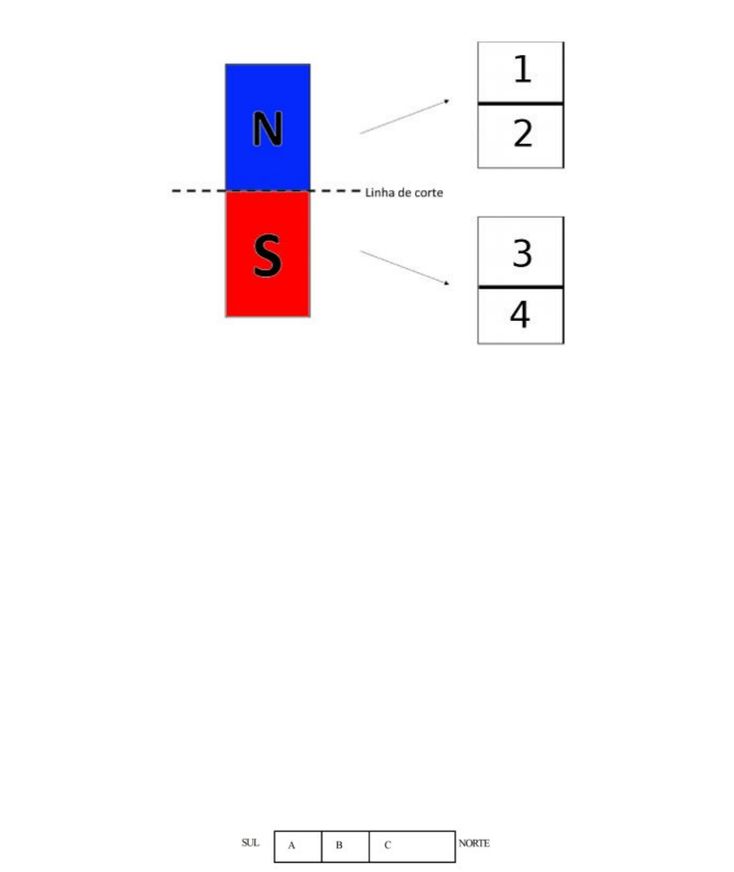 <p>3ª série Física</p><p>1.A imagem a seguir mostra um ímã permanente que foi quebrado ao meio.</p><p>Sabendo que N e S representam, respectivamente, os polos norte e sul do ímã permanente, determine a polaridade dos pontos 1, 2, 3 e 4.</p><p>a) 1-sul, 2-norte, 3-sul e 4-sul.</p><p>b) 1-norte, 2-sul, 3-sul e 4-norte.</p><p>c) 1-sul, 2-sul, 3-norte e 4-norte.</p><p>d) 1-norte, 2-sul, 3-norte e 4-norte.</p><p>e) 1-norte, 2-sul, 3-norte e 4 -sul.</p><p>2. Com relação aos estudos sobre as propriedades do ímã, podemos dizer que o polo sul de um ímã natural:</p><p>a) atrai o polo sul de outro ímã, desde que ele seja artificial</p><p>b) repele o polo norte de um ímã também natural</p><p>c) atrai o polo norte de todos os ímãs, sejam naturais ou artificiais</p><p>d) atrai o polo sul de outro ímã, sejam naturais ou artificiais</p><p>e) não interage com um eletroímã em nenhuma hipótese.</p><p>3. Na figura, representa-se um imã permanente em forma de barra, onde estão indicados seus pólos. Se o imã for dividido em três partes A, B e C, pode-se então afirmar que</p><p>a) a parte “A” terá dois pólos sul, pois sua extremidade direita está muito próxima do pólo sul original.</p><p>b) a parte “B” terá dois pólos Sul, pois as suas duas extremidades estão muito próximas do pólo sul do imã original.</p><p>c) a parte “C” terá somente o pólo Norte à direita, pois a sua extremidade esquerda está muito distante do pólo Norte do imã original.</p><p>d) a parte “B” não terá pólos, pois as suas extremidades estão distantes dos pólos do imã original.</p><p>e) cada uma das partes constituirá um imã independente com dois pólos opostos.</p><p>4.A Terra é considerada um imã gigantesco, que tem as seguintes características:</p><p>a) O polo Norte geográfico está exatamente sobre o polo sul magnético, e o Sul geográfico está na mesma posição que o norte magnético.</p><p>b) O polo Norte geográfico está exatamente sobre o polo norte magnético, e o Sul geográfico está na mesma posição que o sul magnético.</p><p>c) O polo norte magnético está próximo do polo Sul geográfico, e o polo sul magnético está próximo do polo Norte geográfico.</p><p>d) O polo norte magnético está próximo do polo Norte geográfico, e o polo sul magnético está próximo do polo Sul geográfico.</p><p>e) O polo Norte geográfico está defasado de um ângulo de 45º do polo sul magnético, e o polo Sul geográfico está defasado de 45º do polo norte magnético.</p><p>5. O ímã em forma de barra mostrado abaixo é quebrado, com cuidado, em duas partes.</p><p>Os pólos das peças obtidas estão corretamente representados na alternativa</p><p>6. Em respeito às propriedades das linhas de campo magnético, assinale a alternativa verdadeira.</p><p>a) As linhas de campo magnético são sempre abertas.</p><p>b) As linhas de campo magnético podem ser tanto abertas quanto fechadas.</p><p>c) As linhas de campo magnético são sempre fechadas.</p><p>d) As linhas de campo magnético saem do sul magnético.</p><p>e) As linhas de indução magnética nascem no polo sul e morrem no polo norte do ímã.</p><p>7. Pares de imãs em forma de barra são dispostos conforme indicam as figuras a seguir:</p><p>A letra N indica o polo Norte e o S o polo Sul de cada uma das barras. Entre os imãs de cada um dos pares anteriores (a), (b) e (c) ocorrerão, respectivamente, forças de:</p><p>a) atração, repulsão, repulsão;</p><p>b) atração, atração, repulsão;</p><p>c) atração, repulsão, atração;</p><p>d) repulsão, repulsão, atração;</p><p>e) repulsão, atração, atração.</p><p>8. A figura mostra um pedaço de ferro nas proximidades de um dos pólos de um imã permanente.</p><p>Selecione a alternativa que completa corretamente as lacunas nas seguintes afirmações sobre essa situação.</p><p>A extremidade L do pedaço de ferro é ……… pelo polo K do imã.</p><p>Chamando o polo sul do imã de S e o norte de N, uma possível distribuição dos polos nas extremidades K, L e M é, respectivamente, ……….</p><p>a) atraída – N, N e S</p><p>b) atraída – N, S e N</p><p>c) repelida – N, S e N</p><p>d) repelida – S, S e N</p><p>e) repelida – S, N e S</p><p>9. Considere as afirmações a seguir, a respeito de imãs:</p><p>I – Não podemos construir imãs com mais de dois polos.</p><p>II – Polos magnéticos de mesmo nome se repelem e polos magnéticos de nomes diferentes se atraem.</p><p>III – Quando se quebra, ao meio, um imã em forma de barra, obtém-se dois novos imãs, cada um com apenas um polo magnético:</p><p>Está(ão) correta(s):</p><p>a) apenas I.</p><p>b) apenas II.</p><p>c) apenas III.</p><p>d) apenas I e II.</p><p>e) apenas II e III.</p><p>10. As linhas de um campo magnético de um imã em forma de barra estão representadas corretamente em:</p><p>a)</p><p>b)</p><p>c)</p><p>d)</p><p>e)</p><p>11. Se um ímã é quebrado ao meio, devemos esperar que:</p><p>a) as suas partes desmagnetizem-se.</p><p>b) uma de suas partes torne-se um polo norte, e a outra, um polo sul.</p><p>c) cada uma de suas partes torne-se um ímã menor.</p><p>d) temporariamente, percam sua magnetização.</p><p>e) nenhuma das alternativas.</p><p>12. A imagem a seguir mostra um ímã e suas linhas de campo magnético.</p><p>A partir dessa imagem, constata-se que as linhas de campo são orientadas</p><p>a. da carga positiva (I) para a carga negativa (II).</p><p>b. da carga positiva (II) para a carga negativa (I).</p><p>c. do pólo norte (I) para o pólo sul (II).</p><p>d. do pólo sul (II) para o pólo norte (I).</p><p>e) nenhuma das alternativas.</p><p>13.A Bússola é um importante instrumento utilizado na orientação no espaço geográfico. Com a bússola podemos encontrar as direções para nos deslocarmos pela superfície terrestre e também conhecer a posição relativa de um referencial. Ela é formada por uma agulha magnética, que fica apoiada sobre um 