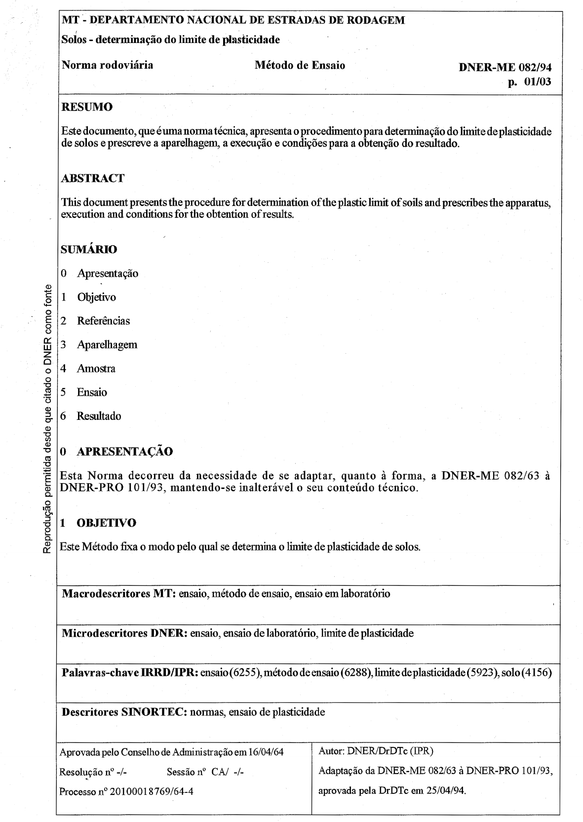 <p>R</p><p>e</p><p>p</p><p>r</p><p>o</p><p>d</p><p>u</p><p>ç</p><p>ã</p><p>o</p><p>pe</p><p>rm</p><p>it</p><p>id</p><p>a</p><p>de</p><p>sd</p><p>e</p><p>qu</p><p>e</p><p>ci</p><p>ta</p><p>do</p><p>o</p><p>D</p><p>N</p><p>E</p><p>R</p><p>c</p><p>o</p><p>m</p><p>o</p><p>fo</p><p>nt</p><p>e</p><p>MT - DEPARTAMENTO NACIONAL DE ESTRADAS DE RODAGEM</p><p>Solos - determinação do limite de plasticidade</p><p>Norma rodoviária Método de Ensaio DNER-ME 082/94</p><p>p. 01/03</p><p>RESUMO</p><p>Este documento, que éuma normatécnica, apresenta o procedimento para determinação do limite de plasticidade</p><p>de solos e prescreve a aparelhagem, a execução e condições para a obtenção do resultado.</p><p>ABSTRACT</p><p>This document presents the procedure for determination of the plastic limit of soils and prescribes the apparatus,</p><p>execution and conditions for the obtention of results.</p><p>SUMÁRIO</p><p>O Apresentação</p><p>1 Objetivo</p><p>2 Referências</p><p>3 Aparelhagem</p><p>4 Amostra</p><p>5 Ensaio</p><p>6 Resultado</p><p>0 APRESENTAÇÃO</p><p>Esta Norma decorreu da necessidade de se adaptar, quanto à forma, a DNER-ME 082/63 à</p><p>DNER-PRO 101/93, mantendo-se inalterável o seu conteúdo técnico.</p><p>1 OBJETIVO</p><p>Este Método fixa o modo pelo qual se determina o limite de plasticidade de solos.</p><p>Macrodescritores MT: ensaio, método de ensaio, ensaio em laboratório</p><p>Microdescritores DNER: ensaio, ensaio de laboratório, limite de plasticidade</p><p>Palavras-chave IRRD/IPR: ensaio (6255), método de ensaio (6288), limite de plasticidade (5923), solo (4156)</p><p>Descritores SINORTEC: normas, ensaio de plasticidade</p><p>Aprovada pelo Conselho de Administração em 16/04/64 Autor: DNER/DrDTe (IPR)</p><p>Resolução nº -/- Sessão nº CA/ -/- Adaptação da DNER-ME 082/63 à DNER-PRO 101/93,</p><p>Processo nº 20100018769/64-4 aprovada pela DrDTc em 25/04/94.</p><p>Re</p><p>pr</p><p>od</p><p>uç</p><p>ão</p><p>pe</p><p>rm</p><p>it</p><p>id</p><p>a</p><p>de</p><p>sd</p><p>e</p><p>qu</p><p>e</p><p>ci</p><p>ta</p><p>do</p><p>o</p><p>D</p><p>N</p><p>E</p><p>R</p><p>co</p><p>mo</p><p>fo</p><p>nt</p><p>e</p><p>DNER-ME 082/94</p><p>“Pp. 02/03</p><p>2 REFERÊNCIAS</p><p>2.1 Norma complementar</p><p>Na aplicação desta Norma é necessário consultar:</p><p>DNER-ME 041/94, designada Solos - Preparação de amostras para ensaios de caracterização.</p><p>2.2 Referênciasbibliográficas</p><p>No preparo desta Norma foram consultados os seguintes documentos:</p><p>a) DNER-ME 082/63, designada Limite de plasticidade de solos;</p><p>b) ABNT MB-31, de 1984, registrada no SINMETRO como NBR-7180, designada Solo - determinação do</p><p>limite de plasticidade;</p><p>c) AASHTO T 90-86, designada Determining the plastic limit and plasticity index of soils.</p><p>3 APARELHAGEM</p><p>A aparelhagem necessária é a seguinte:</p><p>a) cápsula de porcelana com capacidade de 500 ml;</p><p>b) espátula com lâmina flexível de cerca de 8 em de comprimento e 2 cm de largura;</p><p>c) placa de vidro de superficie esmerilhada; |</p><p>d) cilindro de comparação de 3 mm de diâmetro e cerca de 10 cm de comprimento;</p><p>e) recipientes que permitam guardar amostras sem perda de umidade antes de sua pesagem;</p><p>£) balança com capacidade de 200 g, sensível a 0,01 g;</p><p>g) estufa capaz de manter a temperatura entre 105 “C e 110 ºC.</p><p>4 AMOSTRA</p><p>Da amostra obtida de acordo com o item 4 da DNER-ME 041/94 (ver 2.1), tomam-se cerca de 50 g.</p><p>5 ENSAIO</p><p>a) coloca-se a amostrana cápsula ejunta-se água destilada em quantidade suficiente para se obter massa plástica.</p><p>Deve-se adicionar a água aos poucos, misturando-se continuamente com a espátula até completa homogenização</p><p>da massa;</p><p>b) separam-se cerca de 20 g da massa obtida como descrito na alínea a, modelando-a na forma elipsoidal. Rola-</p><p>se esta massa entre os dedos e a face esmerilhada da placa de vidro, com pressão suficiente, a fim de moldá-</p><p>lana forma de um cilindro de diâmetro uniforme. O número de rolagens deverá estar compreendido entre 80</p><p>e 90 por minuto, considerando-se uma rolagem como o movimento da mão para a frente e para a trás,</p><p>retornando ao ponto de partida.</p><p>o</p><p>Re</p><p>pr</p><p>od</p><p>uç</p><p>ão</p><p>pe</p><p>rm</p><p>it</p><p>id</p><p>a</p><p>de</p><p>sd</p><p>e</p><p>qu</p><p>e</p><p>ci</p><p>ta</p><p>do</p><p>o</p><p>D</p><p>N</p><p>E</p><p>R</p><p>co</p><p>mo</p><p>fo</p><p>nt</p><p>e</p><p>DNER-ME 082/94</p><p>p. 03/03</p><p>Notas: 1) Quando o diâmetro do cilindro de solo atingir 3 mm, quebra-se-o em seis ou oito pedaços; amassa-se,</p><p>a seguir, com os dedos, os referidos pedaços, até se obter uma massa de forma elipsoidal. Procede-se</p><p>novamente à rolagem até formar um cilindro de 3 mm de diâmetro, juntando, amassando e rolando,</p><p>repetidamente, até que o cilindro de solo desagregue sob a pressão requerida para a rolagem enão seja</p><p>mais possível formar umnovo cilindro com o solo. A desagregação pode ocorrer quando o cilindro de</p><p>solo apresentar um diâmetro maior do que 3 mm. Este deve ser considerado um estágio final satisfatório,</p><p>tendo em vista que o solo foi antes rolado até atingir a forma de um cilindro de 3 mm de diâmetro.</p><p>2) A desagregação manifestar-se-a diferentemente, conforme o tipo de solo. Algunssolos se desagregarão</p><p>em numerosos pequenos aglomerados de partículas. Outros, poderão formar uma camada externa,</p><p>tubular, que começa a desagregar em ambas aspontas, progredindo em direção ao meio e, finalmente,</p><p>o cilindro rompe em vários pedaços pequenos. Solos muito argilosos requerem mais pressão da mão</p><p>para a deformação do cilindro, particularmente quando se aproxima do limite de plasticidade, quando,</p><p>então, o cilindro parte-se em uma série de segmentos, com a forma de tubo, cada um com cerca de 6</p><p>a 1