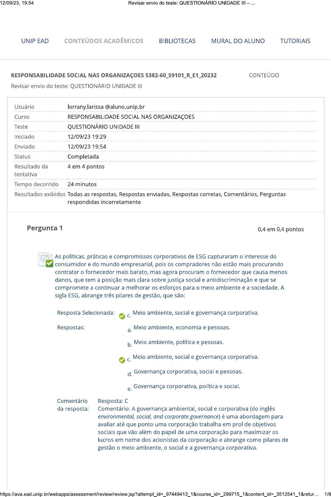 <p>12/09/23, 19:54 Revisar envio do teste: QUESTIONÁRIO UNIDADE III UNIP EAD CONTEÚDOS ACADÊMICOS BIBLIOTECAS MURAL DO ALUNO TUTORIAIS RESPONSABILIDADE SOCIAL NAS CONTEÚDO Revisar envio do teste: QUESTIONÁRIO UNIDADE III Usuário Curso RESPONSABILIDADE SOCIAL NAS Teste QUESTIONÁRIO UNIDADE III Iniciado 12/09/23 19:29 Enviado 12/09/23 19:54 Status Completada Resultado da 4 em 4 pontos tentativa Tempo decorrido 24 minutos Resultados exibidos Todas as respostas, Respostas enviadas, Respostas corretas, Comentários, Perguntas respondidas incorretamente Pergunta 1 0,4 em 0,4 pontos As políticas, práticas e compromissos corporativos de ESG capturaram o interesse do consumidor e do mundo empresarial, pois os compradores não estão mais procurando contratar o fornecedor mais barato, mas agora procuram o fornecedor que causa menos danos, que tem a posição mais clara sobre justiça social e antidiscriminação e que se compromete a continuar a melhorar os esforços para o meio ambiente e a sociedade. A sigla ESG, abrange três pilares de gestão, que são: Resposta Selecionada: C. Meio ambiente, social e governança corporativa. Respostas: Meio ambiente, economia e pessoas. a. b. Meio ambiente, política e pessoas. C. Meio ambiente, social e governança corporativa. d. Governança corporativa, social e pessoas. e. Governança corporativa, política e social. Comentário Resposta: C da resposta: Comentário: A governança ambiental, social e corporativa (do inglês environmental, social, and corporate governance) é uma abordagem para avaliar até que ponto uma corporação trabalha em prol de objetivos sociais que vão além do papel de uma corporação para maximizar os lucros em nome dos acionistas da corporação e abrange como pilares de gestão o meio ambiente, o social e a governança corporativa. 1/8</p><p>12/09/23, 19:54 Revisar envio do teste: QUESTIONÁRIO UNIDADE III Pergunta 2 0,4 em 0,4 pontos O consumo consciente visa transformar o ato de consumir em um ato de cidadania. Em adição ao bem-estar pessoal, o consumidor consciente considera, em suas escolhas de consumo, as possibilidades ambientais e as necessidades sociais. Como está sendo a percepção dos consumidores sobre o papel das empresas na sociedade? Resposta b. Selecionada: As empresas, para realizar plenamente seu papel na sociedade, devem além do que é determinado pela lei, estabelecendo padrões éticos mais elevados. Respostas: As empresas não devem se envolver em questões sociais. a. b. As empresas, para realizar plenamente seu papel na sociedade, devem in além do que é determinado pela lei, estabelecendo padrões éticos mais elevados. As empresas devem cumprir somente as leis. C. d. As empresas não fazem parte da sociedade. e. Os consumidores não estão sensíveis às ações de responsabilidade social que as empresas desenvolvem. Comentário Resposta: B da resposta: Comentário: Ainda que vagarosamente o comportamento dos consumidores tenha mudado em relação às práticas socialmente responsáveis das organizações, eles estão exigindo mais comprometimento social e, por este motivo, os clientes têm percebido que as organizações devem ir além do que está exigido apenas na lei. Para eles, as organizações devem cumprir a lei e além, contribuindo para a preservação ambiental, o desenvolvimento econômico e crescimento social. Pergunta 3 0,4 em 0,4 pontos Critérios ambientais, sociais e de governança (ESG) são um conjunto de padrões para as operações de uma empresa que investidores socialmente conscientes usam para selecionar investimentos potenciais. As principais vantagens da adoção da gestão ESG são: I - Facilitar o crescimento sustentável da organização. PORQUE - Ao se adotar o ESG, aumenta-se a produtividade dos funcionários. Assinale a alternativa correta sobre as afirmações acima. 2/8</p><p>12/09/23, 19:54 Revisar envio do teste: QUESTIONÁRIO UNIDADE III Resposta d. Selecionada: As afirmações e são verdadeiras e não estabelecem relação entre si. Respostas: Ambas as afirmações são falsas. a. b. A afirmação é verdadeira e a afirmação II é falsa. C. A afirmação é falsa e a afirmação é verdadeira. d. As afirmações e II são verdadeiras e não estabelecem relação entre si. e. As afirmações I e são verdadeiras e a afirmação justifica a I. Comentário Resposta: D da resposta: Comentário: Ambas as afirmações são verdadeiras, pois a adoção do ESG tanto facilita crescimento sustentável da organização quanto pode aumentar a produtividade da organização, mas as afirmações não se justificam, uma vez que o crescimento sustentável não depende de aumento de produtividade dos funcionários, mas sim, das práticas de gestão da organização. Pergunta 4 0,4 em 0,4 pontos Souza (2006) afirma que a interação entre agentes sociais molda a sociedade. Esses agentes sociais são as empresas, investidores, funcionários, clientes e governo, entre outros. Cada um, a seu modo e com seus objetivos, consegue contribuir para o desenvolvimento. Quando uma empresa pratica responsabilidade social com o governo, esta empresa: Resposta b. Selecionada: Estabelece parcerias que visam o desenvolvimento tecnológico voltado à energia limpa, mobilidade, controle de resíduos e outros temas correlatos. Respostas: a. Entende que para ser bem-sucedida nas estratégias de sustentabilidade precisa envolver seus funcionários. O trabalho com o público interno é fundamental na gestão socialmente responsável. Antes de realizar projetos externos, é necessário um trabalho interno. b. Estabelece parcerias que visam o desenvolvimento tecnológico voltado à energia limpa, mobilidade, controle de resíduos e outros temas correlatos. C. Pondera que não se trata de simplesmente deixar de fazer negócios com fornecedores sem SER, mas de incentivá-los e auxiliá-los a se adequarem e assumirem políticas alinhadas com os conceitos de sustentabilidade. Assim, a mudan