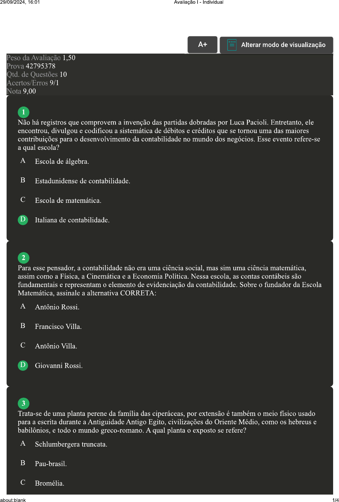 <p>29/09/2024, 16:01 Avaliação - Individual A+ Alterar modo de visualização Peso da Avaliação 1,50 Prova 42795378 Qtd. de Questões 10 Acertos/Erros 9/1 Nota 9,00 1 Não há registros que comprovem a invenção das partidas dobradas por Luca Pacioli. Entretanto, ele encontrou, divulgou e codificou a sistemática de débitos e créditos que se tornou uma das maiores contribuições para desenvolvimento da contabilidade no mundo dos negócios. Esse evento refere-se a qual escola? A Escola de álgebra. B Estadunidense de contabilidade. C Escola de matemática. D Italiana de contabilidade. 2 Para esse pensador, a contabilidade não era uma ciência social, mas sim uma ciência matemática, assim como a Física, a Cinemática e a Economia Política. Nessa escola, as contas contábeis são fundamentais e representam elemento de evidenciação da contabilidade. Sobre fundador da Escola Matemática, assinale a alternativa CORRETA: A Antônio Rossi B Francisco Villa. C Antônio Villa. D Giovanni Rossi. 3 Trata-se de uma planta perene da família das ciperáceas, por extensão é também meio físico usado para a escrita durante a Antiguidade Antigo Egito, civilizações do Oriente Médio, como os hebreus e babilônios, e todo mundo greco-romano. A qual planta exposto se refere? A Schlumbergera truncata. B Pau-brasil. C Bromélia. about:blank 1/4</p><p>29/09/2024, 16:01 Avaliação Individual D Papiro. 4 Quanto ao valor a ser ajustado em relação a ativos e passivos, temos um princípio a ser seguido sempre que provoca uma diminuição do Patrimônio Líquido, e será observado sempre que houver dúvidas. Sobre qual é esse princípio, assinale a alternativa CORRETA: A Prudência. B Entidade. C Competência. D Oportunidade. 5 Na Idade Média, desenvolve-se registro contábil, através das partidas dobradas, método que registrava os fatos em sua causa e efeito. Tal método ganhou força a partir do final do século XV, com a publicação de um livro. Qual era autor desse livro? A Abdullah Ibn Mohammed. B Luca Pacioli. C Benedetto Cotruli. D Gutemberg. 6 A Escola Matemática teve como principal estudioso Giovanni Rossi. Para ele, a contabilidade não era uma ciência social, mas sim outro tipo de ciência, assim como a Física, a Cinemática e a Economia Política. Sobre qual é esse tipo de ciência, assinale a alternativa CORRETA: A Matemática. B Aplicada. C Humana. D Contábil. about:blank 2/4</p><p>29/09/2024, 16:01 Avaliação Individual 7 Muitas foram as obras manuscritas no período conhecido pelos historiadores como marco da literatura contábil. Sobre século do período apresentado, assinale a alternativa CORRETA: A Século IX. B Século C Século XII. D Século XXI. 8 Durante período Pré-Científico alguns autores importantes sucederam Pietra. Sobre esses autores, associe os itens, utilizando código a seguir: I- Moschetti. Venturi. III- La ( ) Edita em 1712, portanto século XVIII, livro La Science des négocians et teneurs de livres, teorizando a classificação dos fatos patrimoniais, em contas. ( ) Tem sua importância nesse período por ter sido considerado primeiro a escrever sobre a Contabilidade Industrial, apesar de se ter conhecimento de um trabalho anônimo manuscrito no século XIV, sobre a arte da seda em Florença. ( ) O mérito de sua obra está no fato de se preocupar não só com ato de se fazer registros contábeis precisos e detalhados, mas principalmente de fazer uma ligação entre a contabilidade e a administração, ditando normas rigorosas com objetivo de se detectar desperdício e a fraude, e preconizando Diário-Razão, que seria mais tarde apresentado por escritores franceses. Assinale a alternativa que apresenta a sequência CORRETA: A B II - I - III. C D III - II - I. 9 Existe um critério que é considerado um dos mais importantes, senão mais importante entre todos, pois está vinculado à integridade das informações e à possibilidade de comparabilidade entre as mesmas informações de mais de um exercício. Diz respeito à singularidade da empresa e não ao segmento, ou a um grupo de empresas. Sobre qual é esse critério, assinale a alternativa CORRETA: A Objetividade. B Consistência. C Conservadorismo. about:blank 3/4</p><p>29/09/2024, 16:01 Avaliação Individual D Materialidade. Revisar Conteúdo do Livro 10 Roma foi uma civilização desenvolvida a partir da cidade-Estado de Roma, fundada na península Itálica. Durante os seus doze séculos de existência, a civilização romana transitou da monarquia para uma república oligárquica até se tornar um vasto império que dominou a Europa. Sobre em meados de qual século Roma foi fundada, assinale a alternativa CORRETA: A VI a.C. B IV a.C. C VIII a.C. D VII a.C. Imprimir about:blank 4/4</p>
