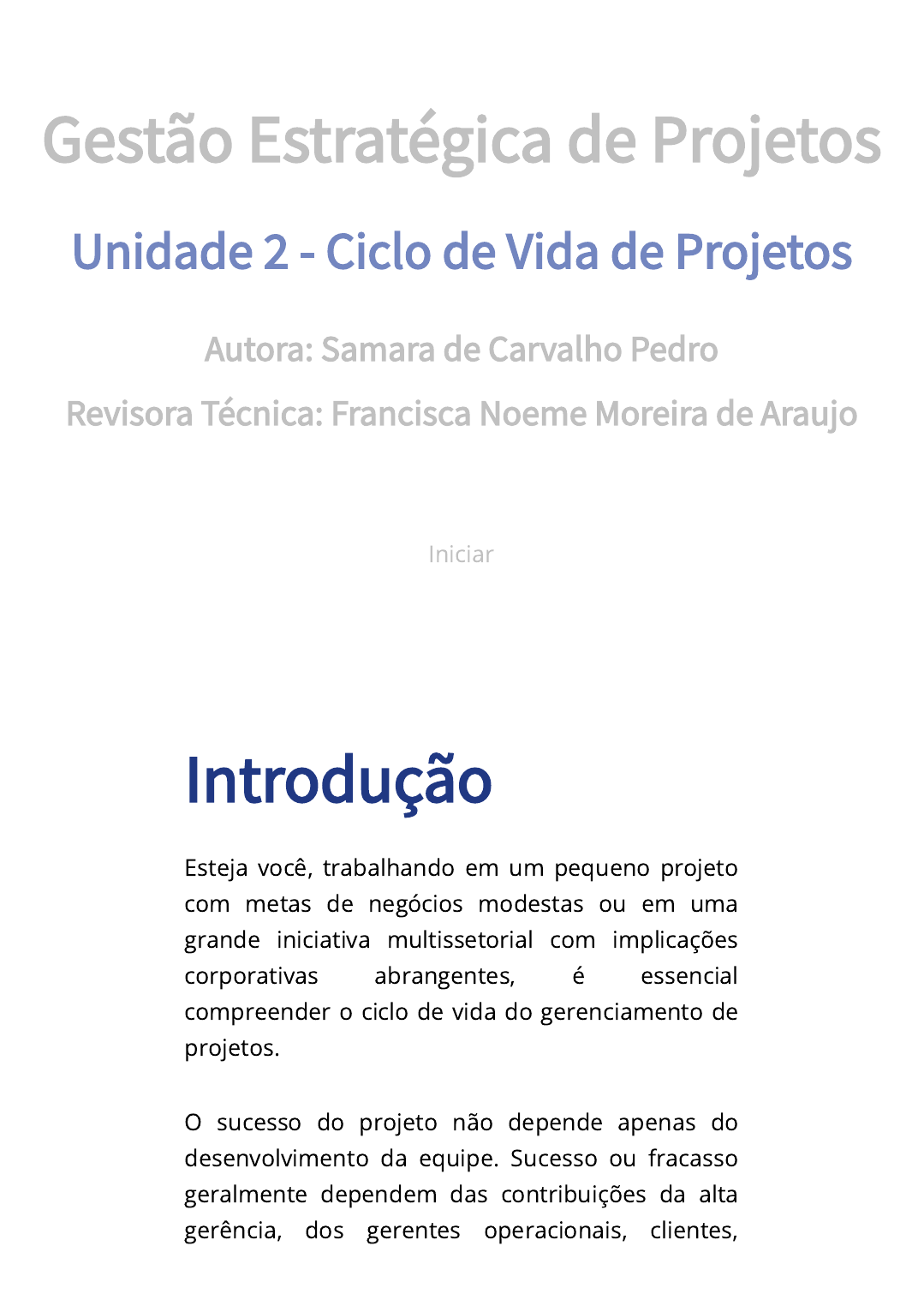 <p>Introdução</p><p>Esteja você, trabalhando em um pequeno projeto</p><p>com metas de negócios modestas ou em uma</p><p>grande iniciativa multissetorial com implicações</p><p>corporativas abrangentes, é essencial</p><p>compreender o ciclo de vida do gerenciamento de</p><p>projetos.</p><p>O sucesso do projeto não depende apenas do</p><p>desenvolvimento da equipe. Sucesso ou fracasso</p><p>geralmente dependem das contribuições da alta</p><p>gerência, dos gerentes operacionais, clientes,</p><p>Gestão Estratégica de Projetos</p><p>Unidade 2 - Ciclo de Vida de Projetos</p><p>Autora: Samara de Carvalho Pedro</p><p>Revisora Técnica: Francisca Noeme Moreira de Araujo</p><p>Iniciar</p><p>fornecedores, empreiteiros e também da maneira</p><p>em que os macroprocessos são de�nidos.</p><p>O ciclo de vida do gerenciamento de projetos</p><p>descreve processos de alto nível para a entrega de</p><p>um projeto bem-sucedido. O ciclo de vida do</p><p>gerenciamento de projetos geralmente é</p><p>apresentado em quatro fases: iniciação,</p><p>planejamento, execução e fechamento. Essas fases</p><p>constituem o caminho que leva seu projeto do</p><p>início ao �m.</p><p>É importante destacarmos que todo projeto</p><p>apresenta riscos e incertezas e que é possível</p><p>medir os riscos de forma quantitativa e qualitativa.</p><p>O impacto dos riscos na cadeia deve ser observado</p><p>para determinar as prioridades. Em alguns casos,</p><p>os riscos podem representar uma oportunidade</p><p>para a empresa superar os concorrentes. Essas</p><p>oportunidades são aproveitadas quando a</p><p>empresa gerencia os riscos externos.</p><p>1. Macroprocessos dos projetos</p><p>Desde a antiguidade se gerencia projetos. Inclusive podemos observar com exemplos</p><p>simples, como: a construção de templos, a construção de embarcações e até mesmo</p><p>cidades. Há diversas de�nições para explicar o que é um projeto, porém a mais</p><p>utilizada é a de�nição instituída pelo PMI (Project Management Institute), a maior e</p><p>mais conhecida instituição de gerenciamento de projetos.</p><p>Keeling (2017) utiliza justamente essa de�nição ao estabelecer que um projeto é um</p><p>esforço temporário empreendido para criar um produto, serviço ou resultado único.</p><p>Dessa maneira, é possível compreender que estamos lidando com um prazo, e que</p><p>esse por sua vez é limitado. Também é possível notar que um projeto implica em um</p><p>resultado diverso daquele que é produzido de maneira habitual, na rotina do dia a</p><p>dia.</p><p>Sabendo que o projeto é um empreendimento temporário, que tem um início e um</p><p>encerramento com tempos preestabelecidos, podemos falar sobre a existência do</p><p>ciclo de vida do projeto. O ciclo de um projeto é composto por fases que muitas vezes</p><p>estão acontecendo ao mesmo tempo, ou seja, não existe a necessidade de terminar</p><p>uma fase para começar outra, pois, os projetos são dinâmicos e podem sofrer</p><p>alterações no decorrer do tempo.</p><p>O ciclo de vida de projeto existe justamente para facilitar o gerenciamento das</p><p>atividades de um projeto, já que todas as fases precisarão cumprir um cronograma a</p><p>�m de não atrasar o projeto como um todo, portanto, do início até o término, haverá</p><p>uma série de fases pelos quais deverá passar: iniciação, planejamento, execução e</p><p>controle, e por �m, o encerramento.</p><p>Cabe destacar quais são estas fases e de�nir as atividades típicas de cada uma delas:</p><p>Fase I – Concepção ou iniciação</p><p>Fase II – Planejamento</p><p>Fase III – Execução e Controle</p><p>Fase IV – Encerramento</p><p>Entender o ciclo de vida permitirá montar uma estrutura básica que o auxiliará no</p><p>gerenciamento do projeto, independente do trabalho envolvido nele.</p><p>Observe a Figura 1:</p><p>Figura 1. Fases do Ciclo de Vida do Projeto</p><p>Fonte: Adaptado de PMBOK (2013, p.23).</p><p>A Figura 1 mostra que ao iniciar o projeto, os custos e o esforço de pessoal ainda são</p><p>baixos. Estamos falando da fase de início do projeto, em que se dará a formalização</p><p>o�cial que acontece por meio de um documento (o Project Charter ou, em português,</p><p>o Termo de Abertura do Projeto), mas à medida que o tempo passa, e o projeto</p><p>começa a ser organizado e executado, os custos e esforço de pessoal vão</p><p>aumentado. Nesta fase (de planejamento e execução) existe todo um conjunto de</p><p>planos e gerenciamento.</p><p>Quando as entregas do produto são realizadas (como chamamos em projeto: o</p><p>produto), ou seja, o projeto está entregue, ainda existe a necessidade de fazer o</p><p>encerramento formal, pois quando ocorre o arquivamento dos documentos é que</p><p>poderemos então dar como encerrado. Claro que a curva de custos e pessoal pode</p><p>variar de projeto para projeto, mas como podemos observar, à medida que um</p><p>projeto evolui, haverá mais dispêndio de energia e custos.</p><p>2. Partes Interessadas</p><p>Dependendo da natureza do projeto, existe uma variedade de grupos diferentes de</p><p>dentro e de fora da empresa que in�uenciam o sucesso do projeto. Vale destacar</p><p>que, o cliente para o qual o projeto foi concebido, é o mais importante</p><p>Cada um desses grupos de partes interessadas traz diferentes expertises, padrões,</p><p>prioridades e pautas para o projeto. Partes interessadas são pessoas e empresas</p><p>ativamente envolvidas no projeto ou cujos interesses podem ser afetados positiva ou</p><p>negativamente por ele.</p><p>A imensa amplitude e complexidade das relações com partes interessadas (Figura 2)</p><p>distingue o gerenciamento de projetos do gerenciamento comum. Para ser e�caz, o</p><p>gerente de projetos precisa compreender como as partes interessadas (stakeholders)</p><p>podem afetar o projeto e desenvolver métodos para administrar a dependência.</p><p>Figura 2. Parte