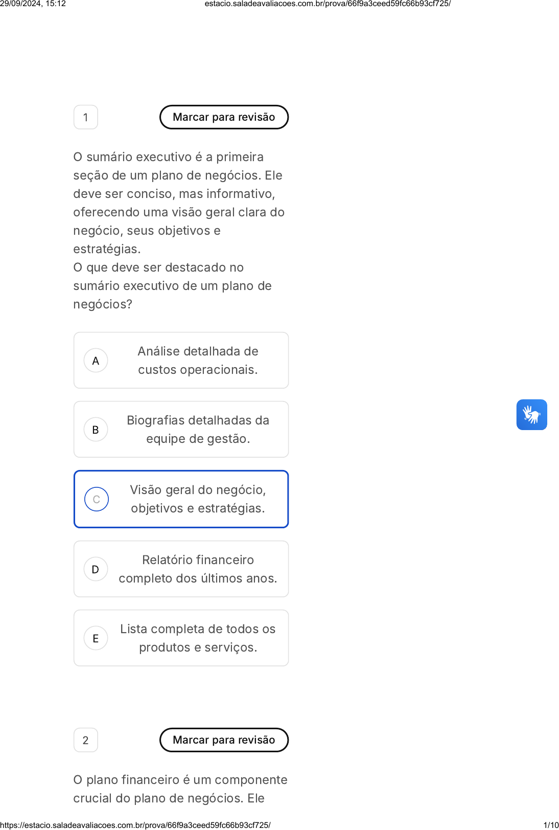 <p>A</p><p>B</p><p>C</p><p>D</p><p>E</p><p>1 Marcar para revisão</p><p>O sumário executivo é a primeira</p><p>seção de um plano de negócios. Ele</p><p>deve ser conciso, mas informativo,</p><p>oferecendo uma visão geral clara do</p><p>negócio, seus objetivos e</p><p>estratégias.</p><p>O que deve ser destacado no</p><p>sumário executivo de um plano de</p><p>negócios?</p><p>Análise detalhada de</p><p>custos operacionais.</p><p>Biografias detalhadas da</p><p>equipe de gestão.</p><p>Visão geral do negócio,</p><p>objetivos e estratégias.</p><p>Relatório financeiro</p><p>completo dos últimos anos.</p><p>Lista completa de todos os</p><p>produtos e serviços.</p><p>2 Marcar para revisão</p><p>O plano financeiro é um componente</p><p>crucial do plano de negócios. Ele</p><p>29/09/2024, 15:12 estacio.saladeavaliacoes.com.br/prova/66f9a3ceed59fc66b93cf725/</p><p>https://estacio.saladeavaliacoes.com.br/prova/66f9a3ceed59fc66b93cf725/ 1/10</p><p>A</p><p>B</p><p>C</p><p>D</p><p>E</p><p>inclui projeções de receita,</p><p>estimativas de custos, análise de</p><p>fluxo de caixa e estratégias de</p><p>financiamento, oferecendo uma</p><p>visão clara da saúde financeira</p><p>esperada.</p><p>Qual é o objetivo principal do plano</p><p>financeiro em um plano de</p><p>negócios?</p><p>Identificar potenciais</p><p>investidores e sócios.</p><p>Detalhar a política de</p><p>recursos humanos.</p><p>Fornecer uma visão clara</p><p>da saúde financeira do</p><p>negócio.</p><p>Estabelecer metas de</p><p>desenvolvimento de</p><p>produtos.</p><p>Descrever a estrutura</p><p>organizacional da empresa.</p><p>3 Marcar para revisão</p><p>A seção de estratégia de marketing</p><p>no plano de negócios detalha como</p><p>a empresa pretende atrair e manter</p><p>clientes. Isso inclui a escolha dos</p><p>canais de marketing, a mensagem</p><p>da marca e as táticas promocionais.</p><p>29/09/2024, 15:12 estacio.saladeavaliacoes.com.br/prova/66f9a3ceed59fc66b93cf725/</p><p>https://estacio.saladeavaliacoes.com.br/prova/66f9a3ceed59fc66b93cf725/ 2/10</p><p>A</p><p>B</p><p>C</p><p>D</p><p>E</p><p>Qual é o foco principal da estratégia</p><p>de marketing em um plano de</p><p>negócios?</p><p>Desenvolvimento de novos</p><p>produtos.</p><p>Redução de custos</p><p>operacionais.</p><p>Atrair e manter clientes.</p><p>Expansão internacional da</p><p>empresa.</p><p>Melhoria da eficiência</p><p>logística.</p><p>4 Marcar para revisão</p><p>Em um plano de negócios bem</p><p>estruturado, a análise de mercado é</p><p>fundamental. Ela permite identificar</p><p>o público-alvo, as tendências de</p><p>mercado e a concorrência. Esta</p><p>seção é crítica para entender como</p><p>posicionar o produto no mercado.</p><p>Qual é o principal objetivo da análise</p><p>de mercado em um plano de</p><p>negócios?</p><p>29/09/2024, 15:12 estacio.saladeavaliacoes.com.br/prova/66f9a3ceed59fc66b93cf725/</p><p>https://estacio.saladeavaliacoes.com.br/prova/66f9a3ceed59fc66b93cf725/ 3/10</p><p>A</p><p>B</p><p>C</p><p>D</p><p>E</p><p>A</p><p>B</p><p>Definir a estratégia de</p><p>preços do produto.</p><p>Identificar as melhores</p><p>práticas de gestão</p><p>empresarial.</p><p>Determinar o público-alvo</p><p>e a posição do produto no</p><p>mercado.</p><p>Estabelecer metas de</p><p>vendas a longo prazo.</p><p>Desenvolver uma estratégia</p><p>de marketing digital.</p><p>5 Marcar para revisão</p><p>O plano de negócios é</p><p>imprescindível para qualquer tipo de</p><p>empresa. Existem, porém,</p><p>particularidades do documento que</p><p>devem estar alinhadas com o tipo de</p><p>empreendimento. Nesse contexto,</p><p>assinale a alternativa que apresenta</p><p>um exemplo de empreendedorismo</p><p>de pequeno e médio porte.</p><p>Clínica de estética.</p><p>Aplicativo de celular de</p><p>corrida.</p><p>29/09/2024, 15:12 estacio.saladeavaliacoes.com.br/prova/66f9a3ceed59fc66b93cf725/</p><p>https://estacio.saladeavaliacoes.com.br/prova/66f9a3ceed59fc66b93cf725/ 4/10</p><p>C</p><p>D</p><p>E</p><p>A</p><p>B</p><p>C</p><p>Comercialização online de</p><p>criptomoedas.</p><p>Programa de computador.</p><p>Serviço de streaming de</p><p>música.</p><p>6 Marcar para revisão</p><p>Qual a principal função das</p><p>patentes?</p><p>Proteger os direitos de</p><p>criação de trabalhos</p><p>científicos, industriais,</p><p>artísticos e literários.</p><p>Proteger o direito de</p><p>expropriação de segredos</p><p>industriais.</p><p>Captar recursos para o</p><p>governo através de</p><p>impostos.</p><p>00</p><p>hora</p><p>: 38</p><p>min</p><p>: 09</p><p>seg</p><p>Ocultar</p><p>Questão 8 de 10</p><p>Respondidas �10� Em branco �0�</p><p>Finalizar prova</p><p>1 2 3 4 5</p><p>6 7 8 9 10</p><p>SM1 Inovação e Empreendedorismo</p><p>29/09/2024, 15:12 estacio.saladeavaliacoes.com.br/prova/66f9a3ceed59fc66b93cf725/</p><p>https://estacio.saladeavaliacoes.com.br/prova/66f9a3ceed59fc66b93cf725/ 5/10</p><p>D</p><p>E</p><p>A</p><p>B</p><p>Dar titulação aos</p><p>conhecimentos dos</p><p>profissionais de uma</p><p>empresa.</p><p>Impedir o acesso a</p><p>inovações científicas.</p><p>7 Marcar para revisão</p><p>As empresas adotam estratégias</p><p>competitivas para enfrentar os</p><p>desafios que são impostos pelo</p><p>mercado:</p><p>Quando adota uma</p><p>estratégia de preço, a</p><p>empresa leva em</p><p>consideração que os</p><p>consumidores fazem suas</p><p>escolhas levando em</p><p>consideração o valor</p><p>subjetivo de um produto ou</p><p>serviço.</p><p>Quando adota uma</p><p>estratégia de</p><p>diferenciação, a empresa</p><p>busca oferecer ao mercado</p><p>produtos ou serviços que</p><p>se destaquem de seus</p><p>concorrentes.</p><p>29/09/2024, 15:12 estacio.saladeavaliacoes.com.br/prova/66f9a3ceed59fc66b93cf725/</p><p>https://estacio.saladeavaliacoes.com.br/prova/66f9a3ceed59fc66b93cf725/ 6/10</p><p>C</p><p>D</p><p>E</p><p>A</p><p>B</p><p>Quando adota uma</p><p>estratégia de excelência</p><p>operac