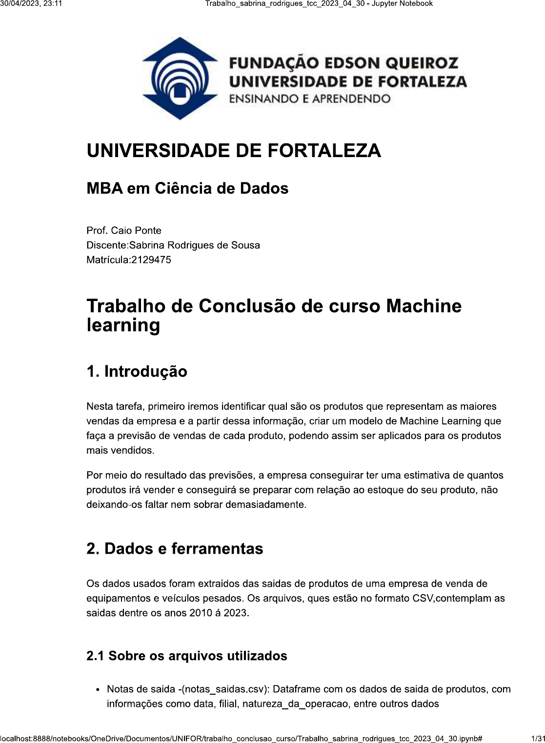 <p>30/04/2023, 23:11 Jupyter Notebook FUNDAÇÃO EDSON QUEIROZ UNIVERSIDADE DE FORTALEZA ENSINANDO E APRENDENDO UNIVERSIDADE DE FORTALEZA MBA em Ciência de Dados Prof. Caio Ponte Discente: Sabrina Rodrigues de Sousa Matrícula:2129475 Trabalho de Conclusão de curso Machine learning 1. Introdução Nesta tarefa, primeiro iremos identificar qual são os produtos que representam as maiores vendas da empresa e a partir dessa informação, criar um modelo de Machine Learning que faça a previsão de vendas de cada produto, podendo assim ser aplicados para os produtos mais vendidos. Por meio do resultado das previsões, a empresa conseguirar ter uma estimativa de quantos produtos irá vender e conseguirá se preparar com relação ao estoque do seu produto, não deixando-os faltar nem sobrar demasiadamente. 2. Dados e ferramentas Os dados usados foram extraidos das saidas de produtos de uma empresa de venda de equipamentos e veículos pesados. Os arquivos, ques estão no formato CSV,contemplam as saidas dentre os anos 2010 2023. 2.1 Sobre os arquivos utilizados Notas de saida -(notas_saidas.csv): Dataframe com os dados de saida de produtos, com informações como data, filial, natureza_da_operacao, entre outros dados 1/31</p><p>30/04/2023, 23:11 Trabalho_sabrina_rodrigues_tcc_2023_04_30- Jupyter Notebook Os dois arquivos foram disponibilizados pela empresa. 3 Carga e Análise exploratória 3.1.1 Importando Módulos In [51]: !pip install plotly Requirement already satisfied: plotly in ckages (5.13.1) Requirement already satisfied: tenacity>=6.2.0 in c:\users\sabri\anaconda3\li b\site-packages (from plotly) (8.2.2) 2/31</p><p>30/04/2023, 23:11 Jupyter Notebook In [52]: #Importação das Bibliotecas necessárias para trabalho import pandas as pd import numpy as np import re import matplotlib.pyplot as plt import matplotlib.dates as mdates import seaborn as sns #from import LinearRegression #from sklearn.metrics import mean_square_error #from import LinearRegression from sklearn.preprocessing import StandardScaler from sklearn.linear_model import LinearRegression from sklearn.tree import cisionTreeRegressor, plot_tree from sklearn.metrics import mean_absolute_error, from sklearn.ensemble import AdaBoostRegressor, from math import ceil from statsmodels.tsa.seasonal import seasonal_decompose from statsmodels.tsa.stattools import adfuller from statsmodels.graphics.tsaplots import plot_acf,plot_pacf from statsmodels.tsa.statespace.sarimax import SARIMAX from statsmodels.tsa.arima.model import ARIMA from statsmodels.tsa.arima_model import ARMA ! pip install pmdarima from pmdarima import auto_arima pd.options.plotting.backend "plotly" %matplotlib inline 3/31</p><p>30/04/2023, 23:11 - Notebook Requirement already satisfied: pmdarima in c:\users\sabri\anaconda3\lib\site- packages (2.0.3) Requirement already satisfied: numpy>=1.21.2 in \site-packages (from pmdarima) (1.23.5) Requirement already satisfied: scikit-learn>=0.22 in \lib\site-packages (from pmdarima) (1.1.2) Requirement already satisfied: pandas>=0.19 in ite-packages - (from pmdarima) (1.2.4) Requirement already satisfied: statsmodels>=0.13.2 in c:\users\sabri\anaconda 3\lib\site-packages (from pmdarima) (0.13.5) Requirement already satisfied: in c:\users\sabri \anaconda3\lib\site-packages (from pmdarima) (52.0.0.post20210125) Requirement already satisfied: scipy>=1.3.2 in c:\users\sabri\anaconda3\lib\s ite-packages (from pmdarima) (1.9.3) Requirement already satisfied: joblib>=0.11 in ite-packages (from pmdarima) (1.0.1) Requirement already satisfied: urllib3 in ackages (from pmdarima) (1.26.4) Requirement already satisfied: c:\users\s abri\anaconda3\lib\site-packages (from pmdarima) (0.29.23) Requirement already satisfied: python-dateutil>=2.7.3 in (from pandas>=0.19->pmdarima) (2.8.1) Requirement already satisfied: pytz>=2017.3 in ite-packages (from pandas>=0.19->pmdarima) (2021.1) Requirement already satisfied: six>=1.5 in :\users\sabri\anaconda3\lib\site- packages (from (1.15.0) Requirement already satisfied: threadpoolctl>=2.0.0 in c:\users\sabri\anacond a3\lib\site-packages (from scikit-learn>=0.22->pmdarima) (2.1.0) Requirement already satisfied: packaging>=21.3 in c:\users\sabri\anaconda3\li b\site-packages (from statsmodels>=0.13.2->pmdarima) (23.0) Requirement already satisfied: patsy>=0.5.2 in :\users\sabri\anaconda3\lib\s ite-packages (from statsmodels>=0.13.2->pmdarima) (0.5.3) 3.1.2 Arquitetura dos dados 4/31</p><p>30/04/2023, 23:11 Notebook In [53]: from PIL import Image %matplotlib inline im = Image.oper im. show() im estado Código UF da loja filial Descrição do tipo de destinação do produto Código da forma de pagamento do produto dt emissao Data da emissão de saída do produto - Peso bruto Peso líquido Valor final total de venda, incluindo outros produtos e descontos vr mercadoria Valor bruto da venda, sem desconto para cliente. Valor de tributação da venda Valor restante após a tributação Código do produto produto_qtd Quantidade de saídas de produto Valor unitário do produto Valor do desconto unitário produto Valor de acréscimo unitário do produto produtovrtotal Valor total vendido do produto Descrição do tipo unitário do produto Peso líquido do produto Peso bruto do produto produto custo Valor de compra do produto (total) 3.1.3 Importando os dados Os dados em formato de CSV são importados em data frames In [54]: df_notas_saidas = In [55]: 3.1.4 Avaliando os dados 5/31</p><p>30/04/2023, 23:11 - Jupyter Notebook In [56] : df_notas_saidas.head() Out [56]: filial estado natureza_da_operacao cod_condicao_pagamento dt_emissao peso_bruto peso VENDA MERC. SUBST. 0 1 CE 99 2018-05-18 0.0 TRIBUTARIA OPERACAO EM 1 1 CE 3 2016-07-27 0.0 GARANTIA VENDA MERC. SUBST. 2 1 CE 10 2016-07-27 0.0 TRIBUTARIA VENDA MERC. SUBST. 3 1 CE 5 2014-01-24 0.0 TRIBUTARIA VENDA MERC. SUBST. 4 1 CE 10 2016-07-27 0.0 TRIBUTARIA Agora que tivemos o primeiro contato com os dados, devemos levar em consideração um fato relevantes sobre