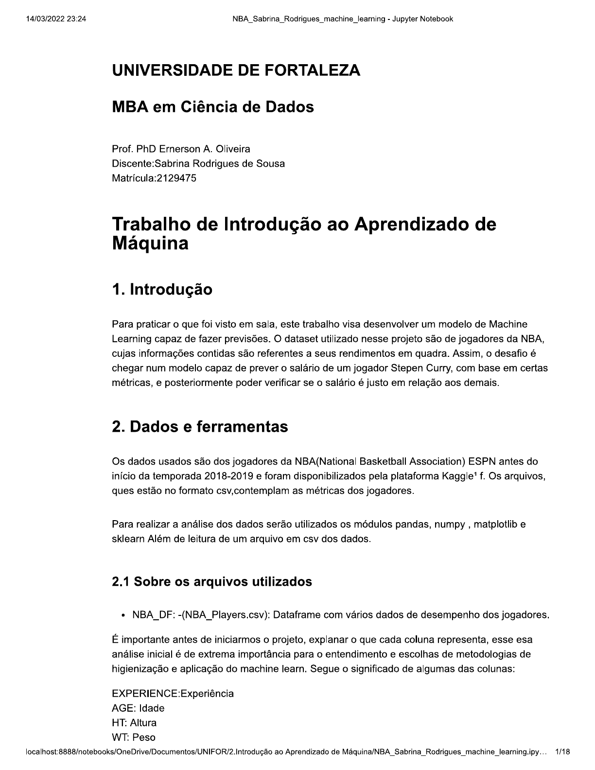 <p>14/03/2022 23:24 Jupyter Notebook UNIVERSIDADE DE FORTALEZA MBA em Ciência de Dados Prof. PhD Ernerson A. Oliveira Discente: Sabrina Rodrigues de Sousa Matrícula:212 Trabalho de Introdução ao Aprendizado de Máquina 1. Introdução Para praticar o que foi visto em sala, este trabalho visa desenvolver um modelo de Machine Learning capaz de fazer previsões. dataset utilizado nesse projeto são de jogadores da NBA, cujas informações contidas são referentes a seus rendimentos em quadra. Assim, o desafio é chegar num modelo capaz de prever o salário de um jogador Stepen Curry, com base em certas métricas, e posteriormente poder verificar se o salário é justo em relação aos demais. 2. Dados e ferramentas Os dados usados são dos jogadores da NBA(National Basketball Association) ESPN antes do início da temporada 2018-2019 e foram disponibilizados pela plataforma f. Os arquivos, ques estão no formato csv,contemplam as métricas dos jogadores. Para realizar a análise dos dados serão utilizados os módulos pandas, numpy , matplotlib e sklearn Além de leitura de um arquivo em CSV dos dados. 2.1 Sobre os arquivos utilizados NBA_DF: -(NBA_Players.csv): Dataframe com vários dados de desempenho dos jogadores. É importante antes de iniciarmos o projeto, explanar o que cada coluna representa, esse esa análise inicial é de extrema importância para o entendimento e escolhas de metodologias de higienização e aplicação do machine learn. Segue o significado de algumas das colunas: EXPERIENCE: Experiência AGE: Idade HT: Altura WT: Peso ao Aprendizado de 1/18</p><p>14/03/2022 23:24 Jupyter Notebook SALARY: Salário Pontos por jogo (última temporada) APG_LAST_SEASON: Assistências por jogo (última temporada) RPG_LAST SEASON: Rebotes por jogo (última temporada) Classificação de eficiência do jogador PPG_CAREER: Pontos por jogo na carreira APG_CAREER: Rebotes por jogo na carreira RGP CAREER: Classificação de eficiência do jogador na carreira GP: Jogos jogados MPG: Minutos jogados por jogo FGP: Arremessos convertidos FTP: Porcentagem de lances livres STLPG = Roubadas de bola por jogo TOPG = Bola desperdiçada por jogo 3 Metodologia de análise Os primeiros passos, após a importação dos módulos e carga dos dados, será analisar todo o DataFrame e fazer uma higienização nos valores que não têm significância para as análises. Será verificado, os dados nulos, valores em branco e/ou zerados, os tipos de dados e se há informações repetidas. Em seguida, será analisada as correlações existentes do "SALARIO" (variável alvo) com os demais atributos através de gráficos e números aprasentados a partir do módulo SEABORN. Posteriormente as 5 melhores correlações vão ser selecionadas e seus dados serão divididos em conjuntos de treino e teste.Estes serão aplicados em dois modelos: o de regrasseão linear e o de árvore de decisão com regressão, a fim de verificar qual modelo que mais se adequa ao objetivo desejado no projeto. Os dois modelos foram selecionados por se carcterizarem pela necessidade de prever um único dado ou valor. A escolha do modelo será baseada através do melhor score entre as os dados de teste e treino de cada um deles. Por fim, com o modelo de previsão selecionado, irá aplicar as métricas do jogador Stepen Curry para verificar a previsão do seu salário e compara-lo ao real, podendo responder a nossa pergunta principal. Os processos serão detalhados durante a execução do notebook. 4 Resultados e Discussões 4.1 Importação de dados e módulos 4.1.1 Importando Módulos ao Aprendizado de 2/18</p><p>14/03/2022 23:24 NBA_Sabrina_Rodrigues_machine_learning - Jupyter Notebook In [1]: import pandas as pd import seaborn as sb from sklearn import linear_model from sklearn.model_selection import train_test_split from sklearn.metrics import r2_score import numpy as np import matplotlib.pyplot as plt # import the regressor from sklearn.tree import DecisionTreeRegresson from sklearn.model_selection import KFold from sklearn.model_selection import cross_val_score from sklearn.preprocessing import StandardScalen from sklearn.metrics import ConfusionMatrixDisplay from sklearn.metrics import classification_report from sklearn.model_selection import train_test_split from import KFold from sklearn.model_selection import cross_val_score from sklearn.model_selection import GridSearchCV from sklearn.metrics import confusion_matrix from sklearn.metrics import accuracy_score from sklearn.pipeline import Pipeline from sklearn.linear_model import LogisticRegression from sklearn.tree import DecisionTreeClassifier from sklearn.neighbors import KNeighborsClassifier from sklearn.naive_bayes import GaussianNB from sklearn.svm import SVC %matplotlib inline 4.1.2 Importando os dados Os dados em formato de CSV são importados em um data frame In [2]: 4.2 identificação dos dados Nesta etapa, analisou os dados extraidos da base, quantidade de linha, suas colunas e seu tipo, com o objetivo de definir quais dados seriam explorados no trabalho. 4.2.1 Analise do arquivo ao Aprendizado de 3/18</p><p>14/03/2022 23:24 - Jupyter Notebook In [3] None) NBA_df.head() Out [3]: TEAM NAME EXPERIENCE URL POSITION AGE HT Boston Aron 0 6 http://www.espn.com/nba/player/_/id/2968439 SF 31 208.28 Celtics Baynes Boston Justin 1 0 G 22 195.58 Celtics Bibbs Boston Jabari 2 1 http://www.espn.com/nba/player/_/id/3064308 SG 24 198.12 Celtics Bird 3 Boston Jaylen 2 F 21 200.66 Celtics Brown Boston PJ 4 1 http://www.espn.com/nba/player/_/id/3923250 PG 21 198.12 Celtics Dozier In [4]: NBA_df.info() # Column Non-Null Count Dtype 0 TEAM 550 non-null object 1 NAME 550 non-null object 2 EXPERIENCE 550 non-null int64 3 URL 550 non-null object 4 POSITION 550 non-null object 5 AGE 550 non-null object 6 HT 550 non-null float64 7 WT 550 non-null float64 8 COLLEGE 550 non-null object 9 SALARY 550 non-null object 10 PPG_LAST_SEASON 538 non-null float64 11 APG LAST SEASON 538 non-null float64 12 RPG LA