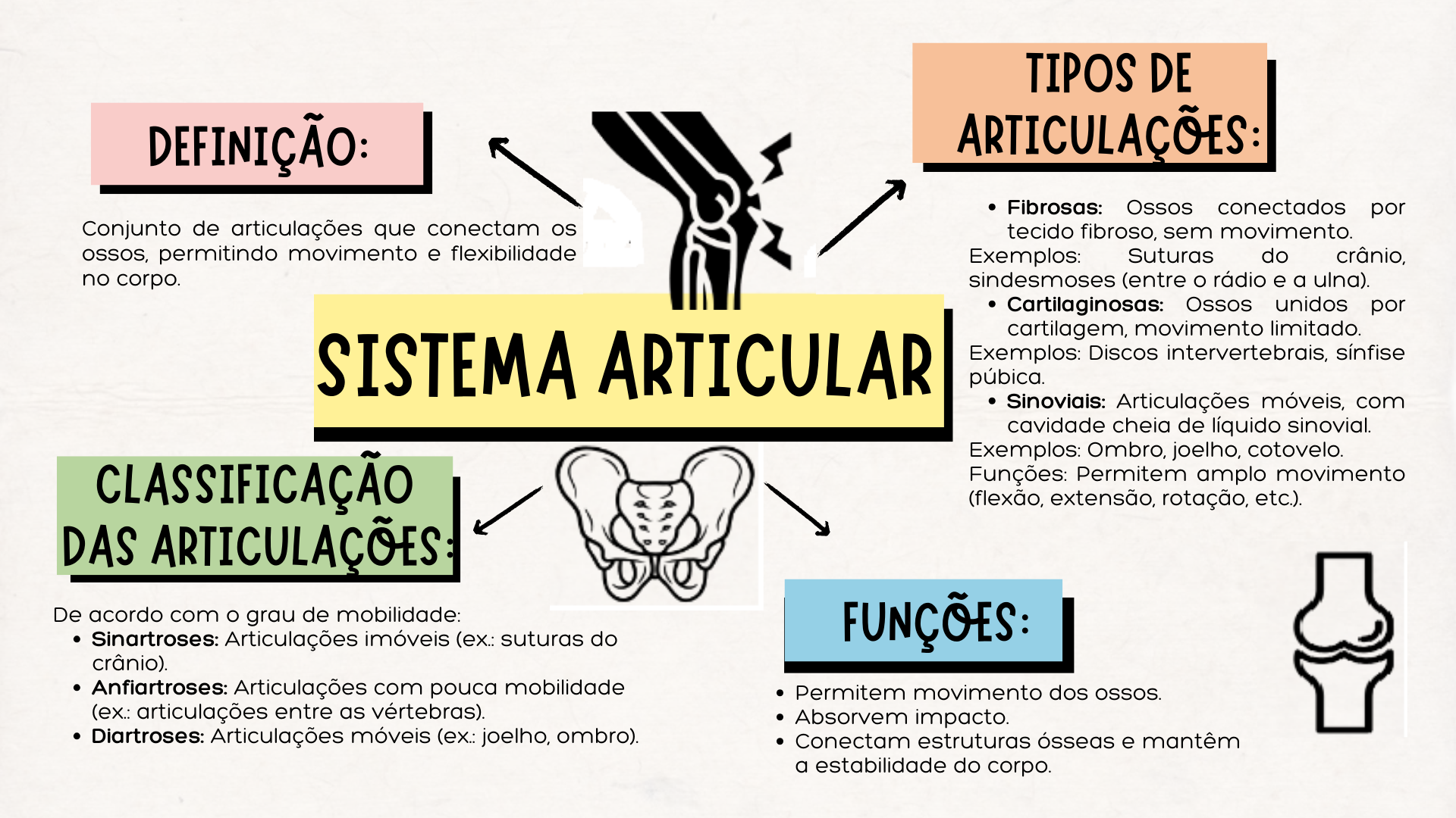 <p>TIPOS DE DEFINIÇÃO: ARTICULAÇÕES Fibrosas: Ossos conectados por Conjunto de articulações que conectam os tecido fibroso, sem movimento. permitindo movimento e flexibilidade Exemplos: Suturas do crânio, no corpo. sindesmoses (entre rádio e a ulna). Cartilaginosas: Ossos unidos por cartilagem, movimento limitado. SISTEMA ARTICULAR Exemplos: Discos intervertebrais, sínfise púbica. Sinoviais: Articulações móveis, com cavidade cheia de líquido sinovial. Exemplos: Ombro, joelho, cotovelo. CLASSIFICAÇÃO Funções: Permitem movimento (flexão, extensão, rotação, etc.). DAS ARTICULAÇÕES De acordo com grau de mobilidade: Sinartroses: Articulações imóveis suturas do FUNÇÕES: crânio). Anfiartroses: Articulações com pouca mobilidade Permitem movimento dos ossos. articulações entre as vértebras). Absorvem impacto. Diartroses: Articulações móveis joelho, ombro). Conectam estruturas ósseas e mantêm a estabilidade do corpo.</p>