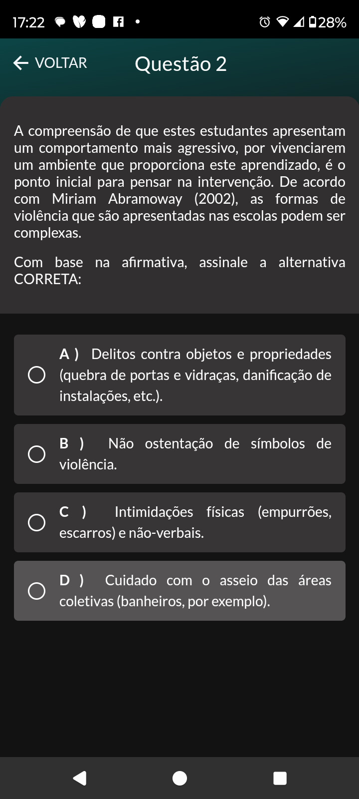 <p>17:22 28% VOLTAR Questão 2 A compreensão de que estes estudantes apresentam um comportamento mais agressivo, por vivenciarem um ambiente que proporciona este aprendizado, é ponto inicial para pensar na intervenção. De acordo com Miriam Abramoway (2002), as formas de violência que são apresentadas nas escolas podem ser complexas. Com base na afirmativa, assinale a alternativa CORRETA: A ) Delitos contra objetos e propriedades (quebra de portas e vidraças, danificação de instalações, etc.). B ) Não ostentação de símbolos de violência. ) Intimidações físicas (empurrões, escarros) e não-verbais. D ) Cuidado com asseio das áreas coletivas (banheiros, por exemplo).</p>