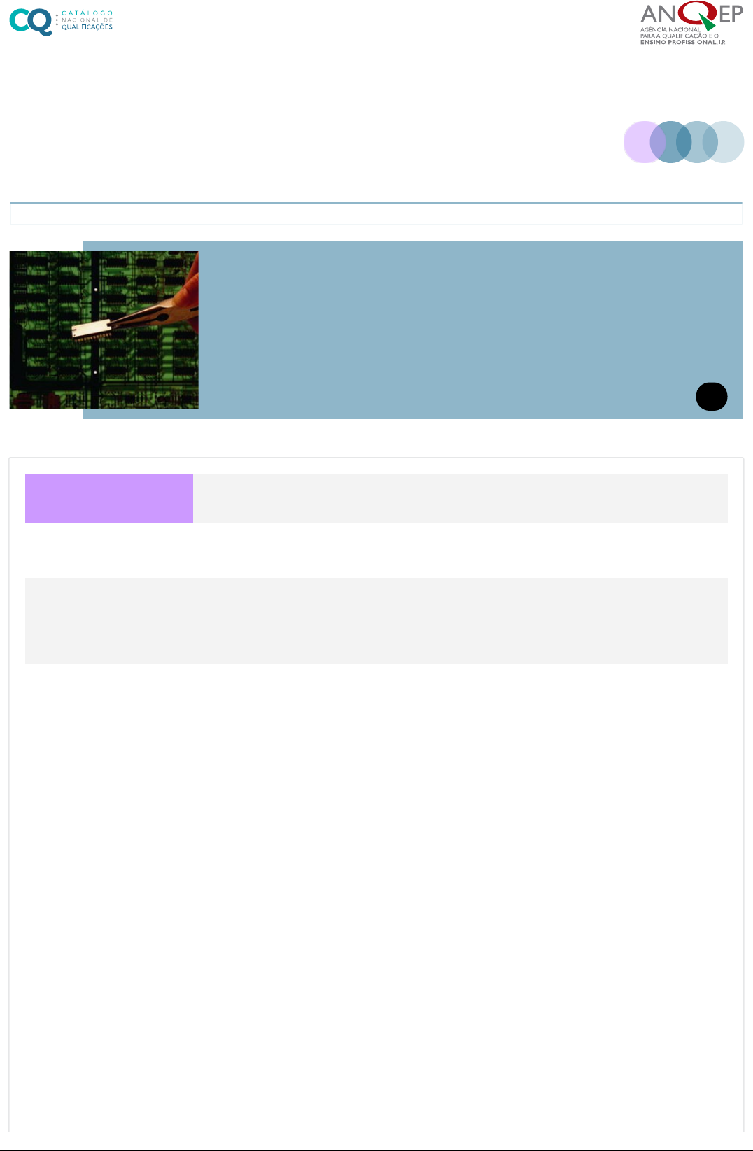 <p>REFERENCIAL DE FORMAÇÃO DE DUPLA</p><p>CERTIFICAÇÃO</p><p>EM VIGOR</p><p>Nível de Qualificação: 4</p><p>Área de Educação e</p><p>Formação 523 . Eletrónica e Automação</p><p>Código e Designação</p><p>da qualificação 523080 - Técnico/a de Eletrónica, Automação e Computadores</p><p>Modalidades de</p><p>Educação e Formação Cursos Profissionais</p><p>Total de pontos de</p><p>crédito</p><p>238,00</p><p>(inclui 20 pontos de crédito da Formação em Contexto de Trabalho)</p><p>1 / 76</p><p>| Técnico/a de Eletrónica, Automação e Computadores - Nível 4 | 24/09/2024</p><p>Publicação e</p><p>atualizações</p><p>Publicado no Despacho n.º13456/2008, de 14 de Maio, que aprova a versão inicia l</p><p>do Catálogo Nacional de Qualificações.</p><p>1ª Actualização publicada no Boletim e Trabalho do Emprego (BTE) N.º 48 de 29 de</p><p>dezembro de 2009 com entrada em vigor a 29 de março de 2010.</p><p>2ª Actualização publicada no Boletim e Trabalho do Emprego (BTE) N.º 48 de 29 de</p><p>dezembro de 2012 com entrada em vigor a 29 de março de 2013.</p><p>3ª Actualização publicada no Boletim e Trabalho do Emprego (BTE) N.º 5 de 08 de</p><p>fevereiro de 2014 com entrada em vigor a 08 de maio de 2014.</p><p>4ª Actualização publicada no Boletim e Trabalho do Emprego (BTE) N.º 19 de 22 de</p><p>maio de 2016 com entrada em vigor a 22 de agosto de 2016.</p><p>5ª Atualização em 01 de setembro de 2016.</p><p>6ª Actualização publicada no Boletim e Trabalho do Emprego (BTE) N.º 31 de 22 de</p><p>agosto de 2018 com entrada em vigor a 22 de agosto de 2018.</p><p>7ª Actualização publicada no Boletim e Trabalho do Emprego (BTE) N.º 41 de 08 de</p><p>novembro de 2019 com entrada em vigor a 08 de novembro de 2019.</p><p>8ª Actualização publicada no Boletim e Trabalho do Emprego (BTE) N.º 19 de 22 de</p><p>maio de 2020 com entrada em vigor a 22 de maio de 2020.</p><p>9ª Actualização publicada no Boletim e Trabalho do Emprego (BTE) N.º 27 de 22 de</p><p>julho de 2020 com entrada em vigor a 22 de julho de 2020.</p><p>Observações</p><p>A qualificação de Técnico/a de Eletrónica, Automação e Computadores a partir de</p><p>uma formação desenvolvida com base neste referencial, desde que realizadas as</p><p>UFCD 10527, 10528, 10529 e 10530, possibilita: - A obtenção do Título</p><p>Profissional, emitido pela entidade reguladora setorial – ANACOM – Autoridade</p><p>Nacional de Comunicações, como Instalador de ITED, em função das condições</p><p>estabelecidas no Decreto-le i nº 123/2009, de 21 de maio, com a redação dada</p><p>pelo Decreto-Lei n.º 92/2017, de 31 de julho. As entidades formadoras do</p><p>Sistema Nacional de Qualificações que pretendam ministrar a formação ITED,</p><p>utilizando as UFCD da formação qualificante ITED, deverão cumprir os requisitos</p><p>específicos de certificação de entidades formadoras, constantes da Portaria n.º</p><p>377/2015, de 21 de outubro. O incumprimento dos referidos requisitos</p><p>impossibilita a obtenção do referido Título Profissional. As entidades formadoras</p><p>privadas deverão estar previamente certificadas pela ANACOM, nos termos do</p><p>art.º 78º, do Decreto-le i nº 123/2009, de 21 de maio, com a redação dada pelo</p><p>Decreto-Lei n.º 92/2017, de 31 de julho.</p><p>2 / 76</p><p>| Técnico/a de Eletrónica, Automação e Computadores - Nível 4 | 24/09/2024</p><p>1. Referencial de Formação Global</p><p>Formação Sociocultural</p><p>Código Disciplina Horas Aprendizagens</p><p>Essenciais Programa</p><p>DACP0010S20 Português 320 � �</p><p>DACP00A1S00 Português Língua Não Materna</p><p>(PLNM) - Nível Iniciação/A1 �</p><p>DACP00A2S00 Português Língua Não Materna</p><p>(PLNM) - Nível Iniciação/A2 �</p><p>DACP00B1S00 Português Língua Não Materna</p><p>(PLNM) - Nível Intermédio/B1 �</p><p>DACP0PL1S00 Língua Gestual Portuguesa (PL1) �</p><p>DACP0PL2S00 Português Língua Segunda (PL2)</p><p>para Alunos Surdos �</p><p>Código Disciplina Horas Aprendizagens</p><p>Essenciais Programa</p><p>DACP0LE001S00 LE I - Inglês - Nível de</p><p>continuação 220 � �</p><p>DACP0LE002S00 LE II - Inglês - Nível de</p><p>continuação 220 � �</p><p>DACP0LE003S00 LE III - Inglês - Nível de iniciação 220 � �</p><p>DACP0LE004S00 LE I - Francês - Nível de</p><p>continuação 220 � �</p><p>DACP0LE005S00 LE II - Francês - Nível de</p><p>continuação 220 � �</p><p>DACP0LE006S00 LE III - Francês - Nível de</p><p>iniciação 220 � �</p><p>DACP0LE007S00 LE I - Alemão - Nível de</p><p>continuação 220 � �</p><p>DACP0LE008S00 LE II - Alemão - Nível de</p><p>continuação 220 � �</p><p>DACP0LE009S00 LE III - Alemão - Nível de</p><p>iniciação 220 � �</p><p>DACP0LE010S00 LE I - Espanhol - Nível de</p><p>continuação 220 � �</p><p>Português e PLNM</p><p>Língua Estrangeira I, II ou III</p><p>3 / 76</p><p>| Técnico/a de Eletrónica, Automação e Computadores - Nível 4 | 24/09/2024</p><p>https://bocatalogo.anqep.gov.pt/webapi/api/documentos/1666</p><p>https://bocatalogo.anqep.gov.pt/webapi/api/documentos/1716</p><p>https://bocatalogo.anqep.gov.pt/webapi/api/documentos/1675</p><p>https://bocatalogo.anqep.gov.pt/webapi/api/documentos/1675</p><p>https://bocatalogo.anqep.gov.pt/webapi/api/documentos/1675</p><p>https://bocatalogo.anqep.gov.pt/webapi/api/documentos/1776</p><p>https://bocatalogo.anqep.gov.pt/webapi/api/documentos/1775</p><p>https://bocatalogo.anqep.gov.pt/webapi/api/documentos/1663</p><p>https://bocatalogo.anqep.gov.pt/webapi/api/documentos/1631</p><p>https://bocatalogo.anqep.gov.pt/webapi/api/documentos/1663</p><p>https://bocatalogo.anqep.gov.pt/webapi/api/documentos/1631</p><p>https://bocatalogo.anqep.gov.pt/webapi/api/documentos/1664</p><p>https://bocatalogo.anqep.gov.pt/webapi/api/documentos/1630</p><p>https://bocatalogo.anqep.gov.pt/webapi/api/documentos/1655</p><p>https://bocata