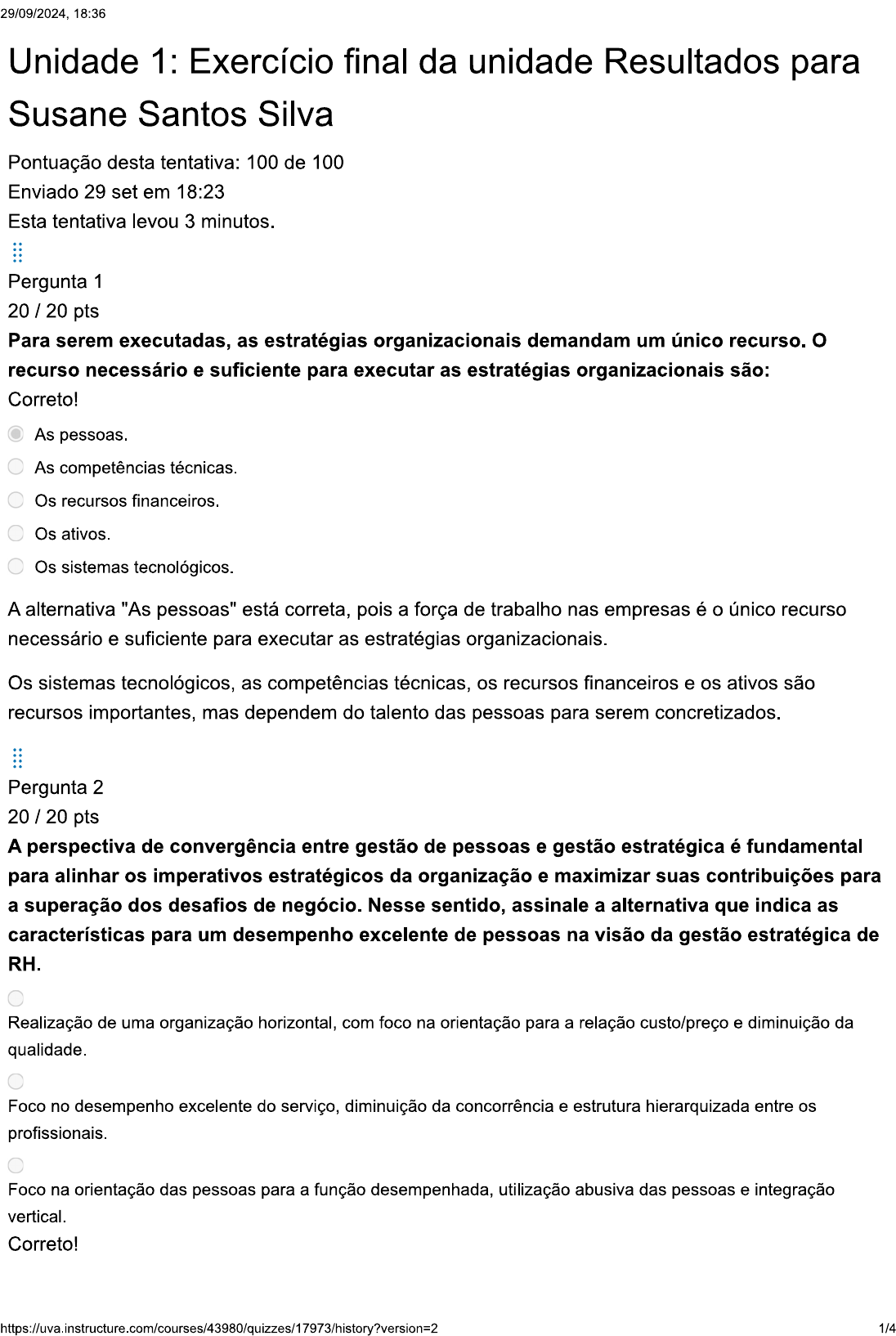 <p>29/09/2024, 18:36 Unidade 1: Exercício final da unidade Resultados para Susane Santos Silva Pontuação desta tentativa: 100 de 100 Enviado 29 set em 18:23 Esta tentativa levou 3 minutos. Pergunta 1 20 / 20 pts Para serem executadas, as estratégias organizacionais demandam um único recurso. o recurso necessário e suficiente para executar as estratégias organizacionais são: Correto! As pessoas. As competências técnicas. Os recursos financeiros. Os ativos. Os sistemas tecnológicos. A alternativa "As pessoas" está correta, pois a força de trabalho nas empresas é o único recurso necessário e suficiente para executar as estratégias organizacionais. Os sistemas tecnológicos, as competências técnicas, os recursos financeiros e os ativos são recursos importantes, mas dependem do talento das pessoas para serem concretizados. Pergunta 2 pts A perspectiva de convergência entre gestão de pessoas e gestão estratégica é fundamental para alinhar os imperativos estratégicos da organização e maximizar suas contribuições para a superação dos desafios de negócio. Nesse sentido, assinale a alternativa que indica as características para um desempenho excelente de pessoas na visão da gestão estratégica de RH. Realização de uma organização horizontal, com foco na orientação para a relação custo/preço e diminuição da qualidade. Foco no desempenho excelente do serviço, diminuição da concorrência e estrutura hierarquizada entre os profissionais. Foco na orientação das pessoas para a função desempenhada, utilização abusiva das pessoas e integração vertical. Correto! https://uva.instructure.com/courses/43980/quizzes/17973/history?version=2 1/4</p><p>29/09/2024, 18:36 Entendimento das pessoas como parceiras, orientação para os resultados e atuação por meio de parcerias estratégicas. Entendimento das pessoas como recursos, orientação para a empresa e atuação a partir da estruturação em rede planejamento estratégico aplicado à gestão de pessoas pode agregar valor à empresa, na medida em que alinha o capital humano aos objetivos e às metas da organização. Pergunta 3 pts A gestão estratégica de pessoas contribui para a empresa ao gerar valor agregado e influenciar, positivamente, os resultados da organização. Sobre o tema da gestão estratégica de pessoas, assinale a alternativa que indica a época em que foi possível perceber que essa área despontou como uma concepção empresarial. A partir de 1990, quando ocorre a crise do petróleo, obrigando as organizações a se planejarem, estrategicamente, culminando em demissões em massa. A partir dos anos 2000, com a globalização e o desenvolvimento das tecnologias da informação, introduzindo o modelo de gestão por competência. Correto! A partir de 1980, quando se verificam alterações, nos cenários sociais, políticos e econômicos, introduzindo, entre seus conceitos, o de capital humano. A partir de 1990, quando há uma releitura do papel de RH, que passa a adquirir, entre seus conceitos, o de setor administrativo e o de superação de questões trabalhistas. A partir da década de 1970, incentivado pelo desejo dos profissionais de RH em colocá-lo em nível estratégico; tem entre seus conceitos, o de liberalidade. O modelo de gestão de pessoas como gestão estratégica surge da necessidade de vincular a gestão de pessoas às estratégias da organização. Os fatores econômicos e sociais que marcaram a década de 1980 foram esclarecedores sobre o aparecimento da área de RH como uma atividade mais central e de maior importância nas empresas. Pergunta 4 20 / 20 pts A evolução da Gestão de Pessoas é pautada por algumas fases, sendo uma delas a Fase Burocrática. Dizemos que a fase burocrática é caracterizada pela: https://uva.instructure.com/courses/43980/quizzes/17973/history?version=2 2/4</p><p>18:36 Reforma estrutural profunda nas organizações. Correto! Regulamentação das relações de trabalho e o surgimento do departamento pessoal em função das exigências legais. Novas relações de trabalho. Implantação dos subsistemas de RH em função das demandas das indústrias. Inexistência das relações trabalhistas e do departamento pessoal. A alternativa "Regulamentação das relações de trabalho e o surgimento do departamento pessoal em função das exigências legais" está correta pois a fase burocrática é caracterizada pelo surgimento da legislação trabalhista com a criação da CLT - Consolidação das Leis do Trabalho. A inexistência das relações trabalhistas e do departamento pessoal estão associadas a fase pré- jurídica trabalhista. A implantação dos subsistemas de RH em função das demandas das indústrias está associada a fase tecnicista. A reforma estrutural profunda nas organizações esta associada a fase sistêmica e as novas relações de trabalho esta associada a fase de adoção de modelos externos. Pergunta 5 20 / 20 pts Compreender como se deu a evolução e os desafios da gestão de pessoas, nas organizações, é, muito, importante para os estudantes e os envolvidos no processo de gestão, já que é um processo que vem ocorrendo, há séculos, e abrange discussões em vários campos do conhecimento. A área de gestão foi marcada por alguns movimentos principais. Acerca de tais movimentos, assinale a alternativa correta. O psicólogo Elton Mayo categorizou o movimento denominado Administração Científica, que tinha por objetivo aumentar a produção dentro das organizações e aprimorar a eficiência dos trabalhadores. Correto! No movimento denominado Escola das Relações Humanas, o psicólogo Elton Mayo foi responsável por estabelecer a importância de fatores psicológicos e sociais na produtividade das empresas, por meio da experiência da fadiga. O primeiro movimento marcante, na área de gestão de pessoas, ocorreu na era da informação, que impulsionou transformações nas relações de trabalho, exigindo que os pr