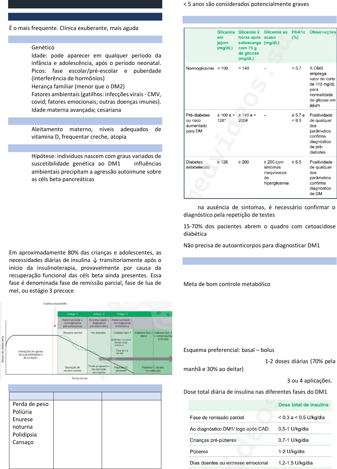 <p>ABORDAGEM DA CRIANÇA COM DIABETES</p><p>DM1</p><p>É o mais frequente. Clínica exuberante, mais aguda.</p><p>Fatores de risco:</p><p>• Genético</p><p>• Idade: pode aparecer em qualquer período da</p><p>infância e adolescência, após o período neonatal.</p><p>Picos: fase escolar/pré-escolar e puberdade</p><p>(interferência de hormônios)</p><p>• Herança familiar (menor que o DM2)</p><p>• Fatores ambientais (gatilhos: infecções virais - CMV,</p><p>covid; fatores emocionais; outras doenças imunes).</p><p>• Idade materna avançada; cesariana</p><p>Fatores de proteção:</p><p>• Aleitamento materno, níveis adequados de</p><p>vitamina D, frequentar creche, atopia</p><p>História natural do DM1:</p><p>• Hipótese: indivíduos nascem com graus variados de</p><p>suscetibilidade genética ao DM1 → influências</p><p>ambientais precipitam a agressão autoimune sobre</p><p>as céls beta pancreáticas</p><p>• Estágio 1: DM1 pré-sintomático, com</p><p>autoimunidade positiva e glicemia normal</p><p>• Estágio 2: DM1 pré-sintomático, com</p><p>autoimunidade positiva e disglicemia pré-diabética</p><p>– fase de doença quase irreversível</p><p>• Estágio 3: DM1 sintomático, com autoimunidade</p><p>positiva e disglicemia diabética – fase de aceleração</p><p>autoimune da doença</p><p>Em aproximadamente 80% das crianças e adolescentes, as</p><p>necessidades diárias de insulina ↓ transitoriamente após o</p><p>início da insulinoterapia, provavelmente por causa da</p><p>recuperação funcional das céls beta ainda presentes. Essa</p><p>fase é denominada fase de remissão parcial, fase de lua de</p><p>mel, ou estágio 3 precoce.</p><p>Sinais e sintomas:</p><p>Mais comuns Menos comuns Graves (CAD)</p><p>Perda de peso</p><p>Poliúria</p><p>Enurese</p><p>noturna</p><p>Polidipsia</p><p>Cansaço</p><p>Fome excessiva</p><p>Turvação visual</p><p>Mudanças de</p><p>humor</p><p>Infecções de</p><p>pele</p><p>Candidíase</p><p>Dor abdominal</p><p>Vômitos e dor</p><p>abdominal</p><p>Hálito cetônico/</p><p>rubor facial</p><p>Desidratação com</p><p>poliúria</p><p>↓ nível consciência</p><p>Respiração acidótica</p><p>Coma e choque</p><p>Cuidado com diagnostico em lactentes</p><p>< 5 anos são considerados potencialmente graves</p><p>Critérios diagnósticos:</p><p>Obs: na ausência de sintomas, é necessário confirmar o</p><p>diagnóstico pela repetição de testes.</p><p>15-70% dos pacientes abrem o quadro com cetoacidose</p><p>diabética.</p><p>Não precisa de autoanticorpos para diagnosticar DM1</p><p>Tratamento:</p><p>Insulinoterapia:</p><p>Meta de bom controle metabólico:</p><p>• HbA1c < 7% em pacientes sem risco para</p><p>hipoglicemia</p><p>• GJ e pré-prandiais entre 90 e 130</p><p>• Ao deitar e de madrugada entre 90 e 150</p><p>• Monitorização contínua de glicose:</p><p>o 70-80mg/dL em > 70% do tempo</p><p>o > 180mg/dL < 25%</p><p>Esquema preferencial: basal – bolus</p><p>Basal (30-40% da dose diária): 1-2 doses diárias (70% pela</p><p>manhã e 30% ao deitar)</p><p>Bolus/prandial (60-70% da dose diária): 3 ou 4 aplicações.</p><p>Dose total diária de insulina nas diferentes fases do DM1:</p><p>Priscylla Guimarães</p><p>Realce</p><p>Priscylla Guimarães</p><p>Realce</p><p>Priscylla Guimarães</p><p>Realce</p><p>Priscylla Guimarães</p><p>Realce</p><p>Priscylla Guimarães</p><p>Realce</p><p>Priscylla Guimarães</p><p>Realce</p><p>Priscylla Guimarães</p><p>Realce</p><p>Priscylla Guimarães</p><p>Realce</p><p>Priscylla Guimarães</p><p>Realce</p><p>Priscylla Guimarães</p><p>Realce</p><p>Priscylla Guimarães</p><p>Realce</p><p>Priscylla Guimarães</p><p>Realce</p><p>Priscylla Guimarães</p><p>Realce</p><p>Priscylla Guimarães</p><p>Realce</p><p>A degludeca permite maior flexibilidade de horários de</p><p>aplicação.</p><p>FIASP: análogo de ação ultra-rápida (o inicio de ação é</p><p>imediato).</p><p>Regular não é uma boa opção para faixa etária pediátrica.</p><p>Atividade física</p><p>• Pelo menos 1h por dia todos os dias</p><p>• Ideal: medir glicemia antes, durante (se > 1h)</p><p>• Risco de hipoglicemia após 7-11h da ativ física</p><p>• Carboidrato extra e ajuste na insulina são mais</p><p>importantes se ativ > 1h</p><p>• Refeição completa a noite reduz o risco de</p><p>hipoglicemia subsequente</p><p>• Aplicação da insulina no membro que será usado de</p><p>forma extenuante não é adequado</p><p>Nutrição</p><p>• Manter ingestão adequada de nutrientes com</p><p>aprox 50% de carboidratos, 20% de proteínas e 30%</p><p>de gorduras</p><p>• Contagem de carboidratos</p><p>• Regra de Holiday</p><p>DM2</p><p>• Adolescentes, obesidade, HF (hereditariedade)</p><p>• Clínica mais arrastada</p><p>Tratamento</p><p>• Mudança no estilo de vida (MEV)</p><p>• Orientação alimentar</p><p>• Programa regular de atividade física</p><p>Tratamento medicamentoso:</p><p>Outros tipos:</p><p>• Diabetes neonatal: primeiros 6 meses de vida</p><p>• MODY: HF positiva</p><p>• DM induzido por medicamentos: corticoides, L-</p><p>aspararginase</p><p>• Pancreatite fibrocalculosa</p><p>• Associado a síndromes / fibrose cística</p><p>Priscylla Guimarães</p><p>Realce</p><p>Priscylla Guimarães</p><p>Realce</p><p>Priscylla Guimarães</p><p>Realce</p><p>Priscylla Guimarães</p><p>Realce</p><p>Priscylla Guimarães</p><p>Realce</p><p>Priscylla Guimarães</p><p>Realce</p><p>Priscylla Guimarães</p><p>Realce</p><p>Priscylla Guimarães</p><p>Realce</p><p>Priscylla Guimarães</p><p>Realce</p><p>Priscylla Guimarães</p><p>Realce</p>