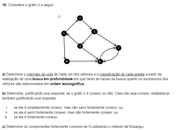 <p>16. Considere O grafo G a seguir: G 2 5 1 3 7 4 6 a) Determine intervalo de vida de cada um dos vértices e a classificação de cada aresta a partir da realização de uma busca em profundidade em que tanto as raízes da busca quanto os sucessores dos vértices são selecionados em ordem b) justificando sua resposta, se grafo G é conexo ou não. Caso ele seja conexo, estabelecer, também justificando sua resposta: i. se ele é simplesmente conexo, mas não semi fortemente conexo; ou ii. se ele é semi fortemente conexo, mas não fortemente conexo; ou iii. se ele é fortemente conexo. c) Determine os componentes fortemente conexos de G utilizando método de Kosaraju.</p>