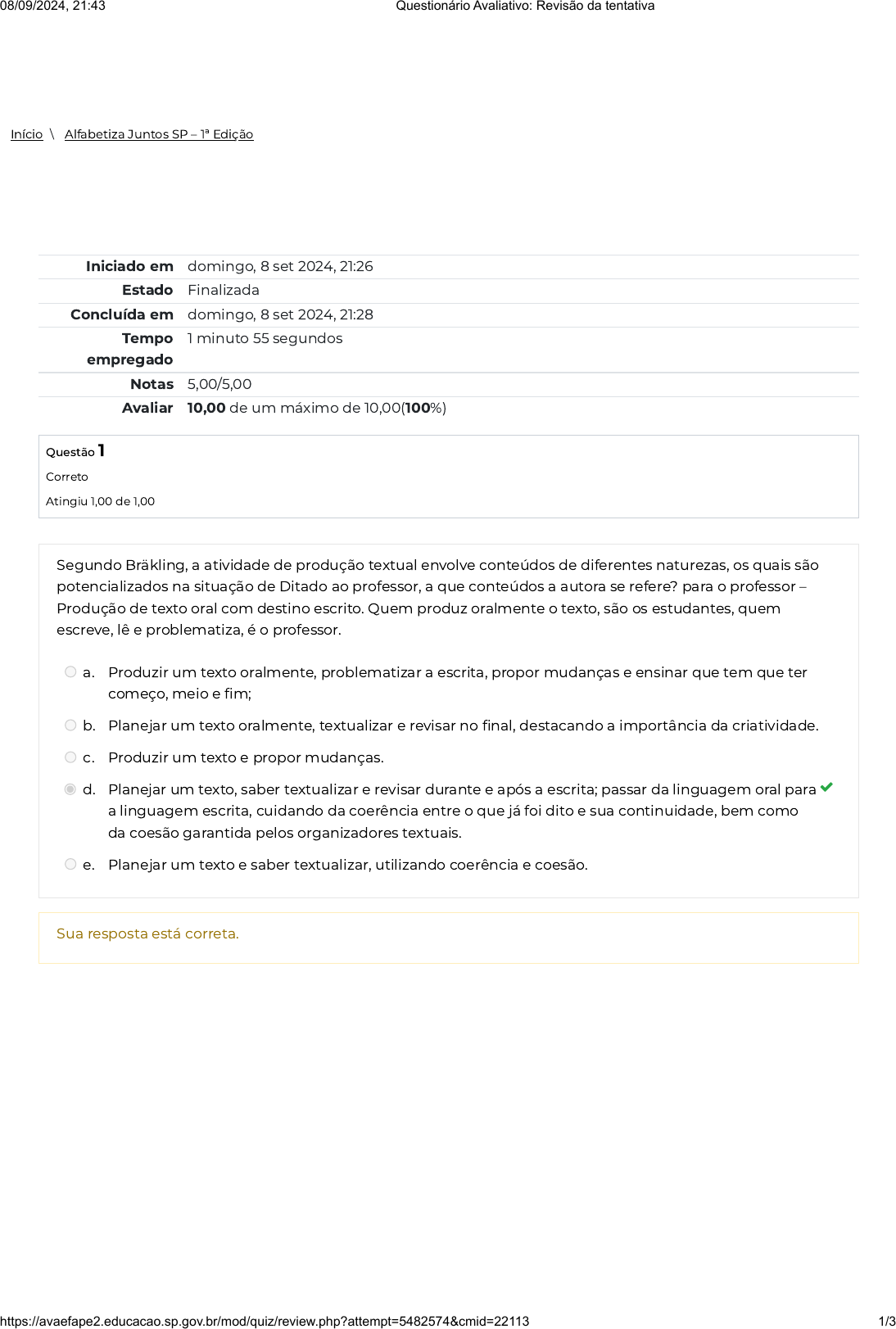 <p>Início \ Alfabetiza Juntos SP – 1ª Edição</p><p>Iniciado em domingo, 8 set 2024, 21:26</p><p>Estado Finalizada</p><p>Concluída em domingo, 8 set 2024, 21:28</p><p>Tempo</p><p>empregado</p><p>1 minuto 55 segundos</p><p>Notas 5,00/5,00</p><p>Avaliar 10,00 de um máximo de 10,00(100%)</p><p>Questão 1</p><p>Correto</p><p>Atingiu 1,00 de 1,00</p><p>Segundo Bräkling, a atividade de produção textual envolve conteúdos de diferentes naturezas, os quais são</p><p>potencializados na situação de Ditado ao professor, a que conteúdos a autora se refere? para o professor –</p><p>Produção de texto oral com destino escrito. Quem produz oralmente o texto, são os estudantes, quem</p><p>escreve, lê e problematiza, é o professor.</p><p>a. Produzir um texto oralmente, problematizar a escrita, propor mudanças e ensinar que tem que ter</p><p>começo, meio e �m;</p><p>b. Planejar um texto oralmente, textualizar e revisar no �nal, destacando a importância da criatividade.</p><p>c. Produzir um texto e propor mudanças.</p><p>d. Planejar um texto, saber textualizar e revisar durante e após a escrita; passar da linguagem oral para</p><p>a linguagem escrita, cuidando da coerência entre o que já foi dito e sua continuidade, bem como</p><p>da coesão garantida pelos organizadores textuais.</p><p></p><p>e. Planejar um texto e saber textualizar, utilizando coerência e coesão.</p><p>Sua resposta está correta.</p><p>08/09/2024, 21:43 Questionário Avaliativo: Revisão da tentativa</p><p>https://avaefape2.educacao.sp.gov.br/mod/quiz/review.php?attempt=5482574&cmid=22113 1/3</p><p>https://avaefape2.educacao.sp.gov.br/my/</p><p>https://avaefape2.educacao.sp.gov.br/course/view.php?id=315</p><p>Questão 2</p><p>Correto</p><p>Atingiu 1,00 de 1,00</p><p>Questão 3</p><p>Correto</p><p>Atingiu 1,00 de 1,00</p><p>No projeto de produção de Autobiogra�as, quais foram as condições didáticas que o professor precisou</p><p>garantir para que os estudantes pudessem produzir bons textos:</p><p>a. procurar os recursos usados pelo autor e copiá-las nas autobiogra�as produzidas.</p><p>b. desenhar o que entendeu da história.</p><p>c. escrever o resumo da história.</p><p>d. realizar leituras complementares.</p><p>e. ler biogra�as bem escritas e de personalidades conhecidas para revisão. </p><p>Sua resposta está correta.</p><p>No Currículo Paulista, as habilidades que precisam ser desenvolvidas desde o 1° ano, em LP, indica: (EF01LP18)</p><p>Produzir, em colaboração com colegas e com a ajuda do professor, cantigas, quadrinhas, parlendas, trava-</p><p>línguas, entre outros textos do campo da vida cotidiana. Neste caso, a professora deverá garantir:</p><p>a. o propósito comunicativo.</p><p>b. que a turma memorize o texto fonte.</p><p>c. o trabalho em equipe.</p><p>d. as alternativas: a e b estão corretas. </p><p>e. a re�exão sobre o contexto.</p><p>Sua resposta está correta.</p><p>08/09/2024, 21:43 Questionário Avaliativo: Revisão da tentativa</p><p>https://avaefape2.educacao.sp.gov.br/mod/quiz/review.php?attempt=5482574&cmid=22113 2/3</p><p>Escola de Formação e Aperfeiçoamento dos Pro�ssionais da Educação do Estado de São Paulo "Paulo Renato Costa Souza"</p><p>Rua João Ramalho, 1546 - Perdizes - CEP 05008-002 - São Paulo - SP - Brasil - (11) 3866-0400</p><p>Questão 4</p><p>Correto</p><p>Atingiu 1,00 de 1,00</p><p>Questão 5</p><p>Correto</p><p>Atingiu 1,00 de 1,00</p><p>Quando propomos aos estudantes a produção de um texto no gênero da vida cotidiana, tendo o professor</p><p>como escriba, o que se quer que os pequenos aprendam:</p><p>a. relacionar os acontecimentos das aulas.</p><p>b. distinguir as letras do alfabeto de outros sinais grá�cos.</p><p>c. comparar as gra�as das diferentes palavras.</p><p>d. comparar o som e a gra�a de palavras</p><p>e. procedimentos de escritor </p><p>Sua resposta está correta.</p><p>A situação didática de produção de texto por meio da escrita do professor, também é conhecida como</p><p>“Ditado para o professor – Produção de texto oral com destino escrito” porque:</p><p>a. os estudantes são avaliados na leitura da produção.</p><p>b. os estudantes memorizam o texto oralmente.</p><p>c. quem escreve, lê e problematiza o que foi escrito é o professor, quem produz o texto oralmente é o</p><p>estudante.</p><p></p><p>d. quem escreve e lê o que foi escrito é o estudante.</p><p>e. os estudantes são acompanhados no momento da leitura.</p><p>Sua resposta está correta.</p><p>Unidade 4 - Acompanhar …❮ Seguir para... Para começar... ❯</p><p>08/09/2024, 21:43 Questionário Avaliativo: Revisão da tentativa</p><p>https://avaefape2.educacao.sp.gov.br/mod/quiz/review.php?attempt=5482574&cmid=22113 3/3</p><p>http://www.saopaulo.sp.gov.br/orgaos-e-entidades/secretarias/educacao/</p><p>https://avaefape2.educacao.sp.gov.br/mod/resource/view.php?id=22112&forceview=1</p><p>https://avaefape2.educacao.sp.gov.br/mod/resource/view.php?id=22114&forceview=1</p>