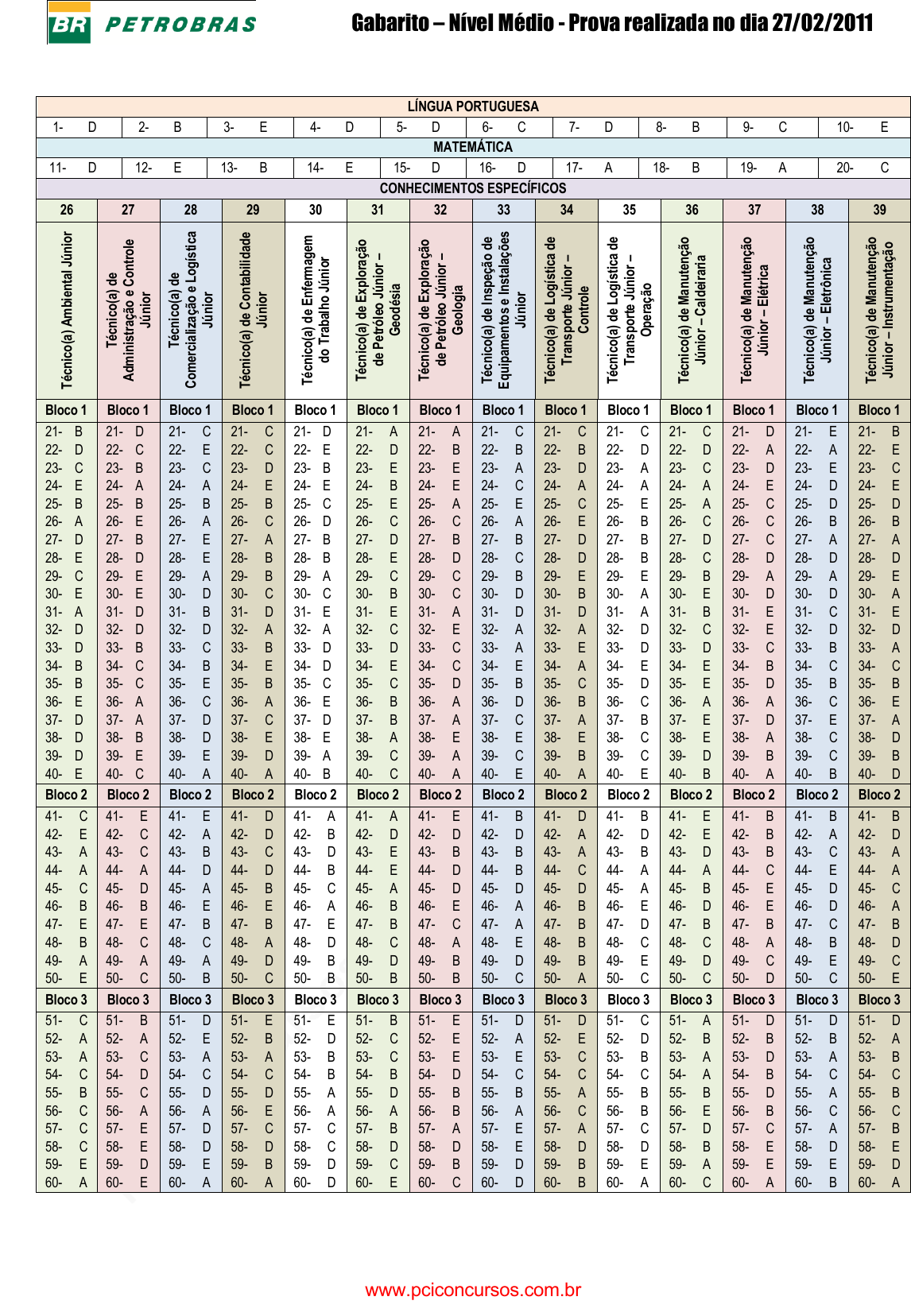 <p>pcimarkpci MjgwNDowMTRkOjc0ODE6NTUzMDpjNTNlOjE2ODk6YWUwYTo3N2Q4:U3VuLCAxMSBGZWIgMjAyNCAwODozNjo0NiAtMDMwMA==</p><p>www.pciconcursos.com.br</p><p>Gabarito – Nível Médio - Prova realizada no dia 27/02/2011</p><p>LÍNGUA PORTUGUESA</p><p>1- D 2- B 3- E 4- D 5- D 6- C 7- D 8- B 9- C 10- E</p><p>MATEMÁTICA</p><p>11- D 12- E 13- B 14- E 15- D 16- D 17- A 18- B 19- A 20- C</p><p>CONHECIMENTOS ESPECÍFICOS</p><p>26 27 28 29 30 31 32 33 34 35 36 37 38 39</p><p>T</p><p>éc</p><p>n</p><p>ic</p><p>o</p><p>(a</p><p>)</p><p>A</p><p>m</p><p>b</p><p>ie</p><p>n</p><p>ta</p><p>l J</p><p>ú</p><p>n</p><p>io</p><p>r</p><p>T</p><p>éc</p><p>n</p><p>ic</p><p>o</p><p>(a</p><p>)</p><p>d</p><p>e</p><p>A</p><p>d</p><p>m</p><p>in</p><p>is</p><p>tr</p><p>aç</p><p>ão</p><p>e</p><p>C</p><p>o</p><p>n</p><p>tr</p><p>o</p><p>le</p><p>Jú</p><p>n</p><p>io</p><p>r</p><p>T</p><p>éc</p><p>n</p><p>ic</p><p>o</p><p>(a</p><p>)</p><p>d</p><p>e</p><p>C</p><p>o</p><p>m</p><p>er</p><p>ci</p><p>al</p><p>iz</p><p>aç</p><p>ão</p><p>e</p><p>L</p><p>o</p><p>g</p><p>ís</p><p>ti</p><p>ca</p><p>Jú</p><p>n</p><p>io</p><p>r</p><p>T</p><p>éc</p><p>n</p><p>ic</p><p>o</p><p>(a</p><p>)</p><p>d</p><p>e</p><p>C</p><p>o</p><p>n</p><p>ta</p><p>b</p><p>ili</p><p>d</p><p>ad</p><p>e</p><p>Jú</p><p>n</p><p>io</p><p>r</p><p>T</p><p>éc</p><p>n</p><p>ic</p><p>o</p><p>(a</p><p>)</p><p>d</p><p>e</p><p>E</p><p>n</p><p>fe</p><p>rm</p><p>ag</p><p>em</p><p>d</p><p>o</p><p>T</p><p>ra</p><p>b</p><p>al</p><p>h</p><p>o</p><p>J</p><p>ú</p><p>n</p><p>io</p><p>r</p><p>T</p><p>éc</p><p>n</p><p>ic</p><p>o</p><p>(a</p><p>)</p><p>d</p><p>e</p><p>E</p><p>xp</p><p>lo</p><p>ra</p><p>çã</p><p>o</p><p>d</p><p>e</p><p>P</p><p>et</p><p>ró</p><p>le</p><p>o</p><p>J</p><p>ú</p><p>n</p><p>io</p><p>r</p><p>–</p><p>G</p><p>eo</p><p>d</p><p>és</p><p>ia</p><p>T</p><p>éc</p><p>n</p><p>ic</p><p>o</p><p>(a</p><p>)</p><p>d</p><p>e</p><p>E</p><p>xp</p><p>lo</p><p>ra</p><p>çã</p><p>o</p><p>d</p><p>e</p><p>P</p><p>et</p><p>ró</p><p>le</p><p>o</p><p>J</p><p>ú</p><p>n</p><p>io</p><p>r</p><p>–</p><p>G</p><p>eo</p><p>lo</p><p>g</p><p>ia</p><p>T</p><p>éc</p><p>n</p><p>ic</p><p>o</p><p>(a</p><p>)</p><p>d</p><p>e</p><p>In</p><p>sp</p><p>eç</p><p>ão</p><p>d</p><p>e</p><p>E</p><p>q</p><p>u</p><p>ip</p><p>am</p><p>en</p><p>to</p><p>s</p><p>e</p><p>In</p><p>st</p><p>al</p><p>aç</p><p>õ</p><p>es</p><p>Jú</p><p>n</p><p>io</p><p>r</p><p>T</p><p>éc</p><p>n</p><p>ic</p><p>o</p><p>(a</p><p>)</p><p>d</p><p>e</p><p>L</p><p>o</p><p>g</p><p>ís</p><p>ti</p><p>ca</p><p>d</p><p>e</p><p>T</p><p>ra</p><p>n</p><p>sp</p><p>o</p><p>rt</p><p>e</p><p>Jú</p><p>n</p><p>io</p><p>r</p><p>–</p><p>C</p><p>o</p><p>n</p><p>tr</p><p>o</p><p>le</p><p>T</p><p>éc</p><p>n</p><p>ic</p><p>o</p><p>(a</p><p>)</p><p>d</p><p>e</p><p>L</p><p>o</p><p>g</p><p>ís</p><p>ti</p><p>ca</p><p>d</p><p>e</p><p>T</p><p>ra</p><p>n</p><p>sp</p><p>o</p><p>rt</p><p>e</p><p>Jú</p><p>n</p><p>io</p><p>r</p><p>–</p><p>O</p><p>p</p><p>er</p><p>aç</p><p>ão</p><p>T</p><p>éc</p><p>n</p><p>ic</p><p>o</p><p>(a</p><p>)</p><p>d</p><p>e</p><p>M</p><p>an</p><p>u</p><p>te</p><p>n</p><p>çã</p><p>o</p><p>Jú</p><p>n</p><p>io</p><p>r</p><p>–</p><p>C</p><p>al</p><p>d</p><p>ei</p><p>ra</p><p>ri</p><p>a</p><p>T</p><p>éc</p><p>n</p><p>ic</p><p>o</p><p>(a</p><p>)</p><p>d</p><p>e</p><p>M</p><p>an</p><p>u</p><p>te</p><p>n</p><p>çã</p><p>o</p><p>Jú</p><p>n</p><p>io</p><p>r</p><p>–</p><p>E</p><p>lé</p><p>tr</p><p>ic</p><p>a</p><p>T</p><p>éc</p><p>n</p><p>ic</p><p>o</p><p>(a</p><p>)</p><p>d</p><p>e</p><p>M</p><p>an</p><p>u</p><p>te</p><p>n</p><p>çã</p><p>o</p><p>Jú</p><p>n</p><p>io</p><p>r</p><p>–</p><p>E</p><p>le</p><p>tr</p><p>ô</p><p>n</p><p>ic</p><p>a</p><p>T</p><p>éc</p><p>n</p><p>ic</p><p>o</p><p>(a</p><p>)</p><p>d</p><p>e</p><p>M</p><p>an</p><p>u</p><p>te</p><p>n</p><p>çã</p><p>o</p><p>Jú</p><p>n</p><p>io</p><p>r</p><p>–</p><p>In</p><p>st</p><p>ru</p><p>m</p><p>en</p><p>ta</p><p>çã</p><p>o</p><p>Bloco 1 Bloco 1 Bloco 1 Bloco 1 Bloco 1 Bloco 1 Bloco 1 Bloco 1 Bloco 1 Bloco 1 Bloco 1 Bloco 1 Bloco 1 Bloco 1</p><p>21- B 21- D 21- C 21- C 21- D 21- A 21- A 21- C 21- C 21- C 21- C 21- D 21- E 21- B</p><p>22- D 22- C 22- E 22- C 22- E 22- D 22- B 22- B 22- B 22- D 22- D 22- A 22- A 22- E</p><p>23- C 23- B 23- C 23- D 23- B 23- E 23- E 23- A 23- D 23- A 23- C 23- D 23- E 23- C</p><p>24- E 24- A 24- A 24- E 24- E 24- B 24- E 24- C 24- A 24- A 24- A 24- E 24- D 24- E</p><p>25- B 25- B 25- B 25- B 25- C 25- E 25- A 25- E 25- C 25- E 25- A 25- C 25- D 25- D</p><p>26- A 26- E 26- A 26- C 26- D 26- C 26- C 26- A 26- E 26- B 26- C 26- C 26- B 26- B</p><p>27- D 27- B 27- E 27- A 27- B 27- D 27- B 27- B 27- D 27- B 27- D 27- C 27- A 27- A</p><p>28- E 28- D 28- E 28- B 28- B 28- E 28- D 28- C 28- D 28- B 28- C 28- D 28- D 28- D</p><p>29- C 29- E 29- A 29- B 29- A 29- C 29- C 29- B 29- E 29- E 29- B 29- A 29- A 29- E</p><p>30- E 30- E 30- D 30- C 30- C 30- B 30- C 30- D 30- B 30- A 30- E 30- D 30- D 30- A</p><p>31- A 31- D 31- B 31- D 31- E 31- E 31- A 31- D 31- D 31- A 31- B 31- E 31- C 31- E</p><p>32- D 32- D 32- D 32- A 32- A 32- C 32- E 32- A 32- A 32- D 32- C 32- E 32- D 32- D</p><p>33- D 33- B 33- C 33- B 33- D 33- D 33- C 33- A 33- E 33- D 33- D 33- C 33- B 33- A</p><p>34- B 34- C 34- B 34- E 34- D 34- E 34- C 34- E 34- A 34- E 34- E 34- B 34- C 34- C</p><p>35- B 35- C 35- E 35- B 35- C 35- C 35- D 35- B 35- C 35- D 35- E 35- D 35- B 35- B</p><p>36- E 36- A 36- C 36- A 36- E 36- B 36- A 36- D 36- B 36- C 36- A 36- A 36- C 36- E</p><p>37- D 37- A 37- D 37- C 37- D 37- B 37- A 37- C 37- A 37- B 37- E 37- D 37- E 37- A</p><p>38- D 38- B 38- D 38- E 38- E 38- A 38- E 38- E 38- E 38- C 38- E 38- A 38- C 38- D</p><p>39- D 39- E 39- E 39- D 39- A 39- C 39- A 39- C 39- B 39- C 39- D 39- B 39- C 39- B</p><p>40- E 40- C 40- A 40- A 40- B 40- C 40- A 40- E 40- A 40- E 40- B 40- A 40- B 40- D</p><p>Bloco 2 Bloco 2 Bloco 2 Bloco 2 Bloco 2 Bloco 2 Bloco 2 Bloco 2 Bloco 2 Bloco 2 Bloco 2 Bloco 2 Bloco 2 Bloco 2</p><p>41- C 41- 
