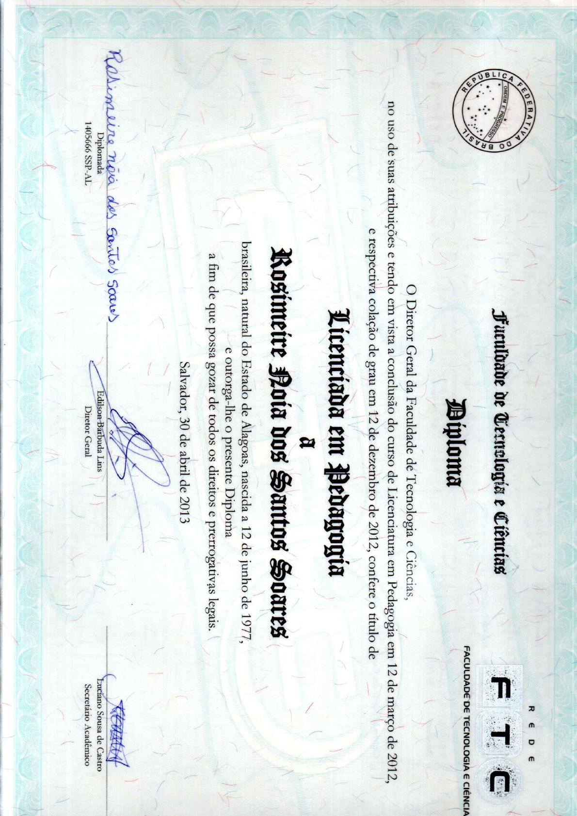 <p>FEDERATIVA A REDE ORDEM E de FTC FACULDADE DE TECNOLOGIA E CIÊNCIA Díploma O Diretor Geral da Faculdade de Tecnologia e Ciências, no uso de suas atribuições e tendo em vista a conclusão do curso de Licenciatura em Pedagogia em 12 de março de 2012, e respectiva colação de grau em 12 de dezembro de 2012, confere o título de Licenciada em Pedagogía dos Santos Soares brasileira, natural do Estado de Alagoas, nascida a 12 de junho de 1977, e outorga-lhe presente Diploma a fim de que possa gozar de todos os direitos e prerrogativas legais. Salvador, 30 de abril de 2013 Rosimeire noia dos Santos Diplomada Edilson Barbuda Lins Luciano Sousa de Castro 1405666 SSP-AL Diretor Geral Secretário Acadêmico</p><p>FACULDADE DE TECNOLOGIA E CIÊNCIAS Portaria do MEC N° 2.144 de 16/07/2004 D.O.U de 20/07/2004 e Portaria do MEC 558 de 20/02/2006 D.O.U de 21/02/2006 FTC Reconhecido nos termos do Artigo 63 da Portaria normativa 40 de 12/12/2007 (DOU de Avenida Luiz Viana Filho, 8812 Paralela FACULDADE DE TECNOLOGIA CIÊNCIAS Salvador BA CNPJ: INSCRIÇÃO ESTADUAL Isento HISTÓRICO ESCOLAR UP ARAPIRACA AL Matrícula Nome Nascimento RG 65629 Rosimeire Noia dos Santos Soares 12/06/1977 1405666 SSP/AL Sexo Nacionalidade Naturalidade CPF Feminino Brasileira ARAPIRACA AL 025.515.914-57 Estabelecimento de Ensino Médio Cidade UF ESCOLA ESTADUAL PROFESSOR JOSE QUINTELLA Ano Conclusão CAVALCANTI Arapiraca AL 2000 Processo Seletivo Certificado Militar Processo Seletivo Vestibular Fevereiro/2008 colocado Data do ENADE 1 Informações Sobre o ENADE 1 09/11/2008 Ingressante/Dispensado Data do ENADE 2 Informações Sobre o ENADE 2 06/11/2011 do ENADE pelo MEC nos termos do da Lei 10861/2004" Data de Colação Data de Conclusão Data de Expedição Data de Emissão de Grau do Curso do Diploma do Histórico 12/12/2012 12/03/2012 30/04/2013 03/05/2013 LICENCIATURA EM PEDAGOGIA - NOTURNO Período Carga Nota Componentes Curriculares Horária Situação Final Período de Realização do Final Componente 1° Fundamentos da Educação 72 h 8,2 Aprovado Mai 2008 Set 2008 Abordagens da Educação 72 h 8,8 Aprovado Jul 2008 Set 2008 Psicologia da Educação 72 8,8 Aprovado Ago 2008 Set 2008 Pesquisa e Prática Pedagógica 68 h 8,1 Aprovado Set 2008 Out 2008 Metodologia 72 h 9,1 Aprovado Abr 2008 Ago 2008 Total 356 h Didática 72 h 9,0 Aprovado Out 2008 Nov 2008 Pesquisa e Prática Pedagógica II 68 6,9 Aprovado Mar 2009 Abr 2009 Arte-educação 72 7,4 Aprovado Nov 2008 Dez 2008 Leitura e Produção de Textos 72 7,9 Aprovado Dez 2008 Fev 2009 Psicologia da Aprendizagem e do Desenvolvimento Humano 72 8,1 Aprovado Fev 2009 Mar 2009 Total 356 h Pesquisa e Prática Pedagógica III 68 h 8,3 Aprovado Ago 2009 Ago 2009 Educação Inclusiva 72 h 8,8 Aprovado Mar 2009 Mai 2009 Formação Pessoal e Social na Infância 72 7,3 Aprovado Abr 2009 Jun 2009 Estudos da Linguagem Oral e Escrita na Educação Infantil 72 8,0 Aprovado Mai 2009 Jul 2009 Estudos da Matemática na Educação Infantil 72 6,9 Aprovado Jul 2009 Ago 2009 Total 356 h Pesquisa e Prática Pedagógica IV 68 h 9,4 Aprovado Fev 2010 Mar 2010 Fundamentos e Didática da Alfabetização 72 h 9,0 Aprovado Dez 2009 Fev 2010 Estudos da Natureza na Educação Infantil 72 h 8,9 Aprovado Ago 2009 Set 2009 Estudos da Sociedade na Educação Infantil 72 h 7.8 Aprovado Set 2009 Nov 2009 Musicalização na Educação 72 h 9,1 Aprovado Nov 2009 Dez 2009 Total 356 h Carga Horária Total das Disciplinas 1424 h Página 1/2 Tatiana Luciano Castro Academico Port 2010 FTC EAD</p><p>FACULDADE DE TECNOLOGIA E CIÊNCIAS E D Portaria do MEC N° 2.144 de 16/07/2004 D.O.U de 20/07/2004 e Portaria do MEC 558 de 20/02/2006 D.O.U de 21/02/2006 FTC Portaria Normativa 40, de 12/12/2007 e DOU de 13/12/2007 Avenida Luiz Viana Filho, 8812 Paralela Salvador BA CNPJ: FACULDADE DE TECNOLOGIA CIÊNCIAS INSCRIÇÃO ESTADUAL: Isento HISTÓRICO ESCOLAR UP ARAPIRACA AL Nome Nascimento RG Matrícula 65629 Rosimeire Noia dos Santos Soares 12/06/1977 1405666 SSP/AL LICENCIATURA EM PEDAGOGIA NOTURNO Carga Nota Período de Realização do Período Componentes Curriculares Situação Final Horária Final Componente Fundamentos e Didática da Língua Portuguesa I 72 h 8,8 Aprovado Mar 2010 Abr 2010 Fundamentos e Didática da Matemática I 72 h 9,3 Aprovado Abr 2010 Mai 2010 Fundamentos e Didática das Ciências Naturais 72 h 9,1 Aprovado Mai 2010 Jun 2010 Fundamentos e Didática da História I 72 h 8,6 Aprovado Jun 2010 Ago 2010 Estágio Supervisionado na Educação Infantil 36 Aprovado Mar 2010 Mar 2010 Tópicos Especiais em Educação I 40 h 7,7 Aprovado Ago 2010 Ago 2010 Total 364 h Fundamentos e Didática da Língua Portuguesa II 72 h 9,0 Aprovado Out 2010 Nov 2010 Fundamentos e Didática da Geografia I 72 9,1 Aprovado Set 2010 Out 2010 Fundamentos e Didática das Ciências Naturais II 72 9,1 Aprovado Dez 2010 Fev 2011 Fundamentos e Didática da Matemática II 72 9,1 Aprovado Nov 2010 Dez 2010 Estágio Supervisionado no Ensino Fundamental 36 9,4 Aprovado Ago 2010 Set 2010 Tópicos Especiais em Educação II 40 9,3 Aprovado Fev 2011 Mar 2011 Total 364 h 70 Fundamentos e Didática da História II 72 h 9,1 Aprovado Mar 2011 Abr 2011 Fundamentos e Didática da Geografia II 72 9,6 Aprovado Abr 2011 Mai 2011 Fundamentos da Orientação Educacional 72 9,6 Aprovado Mai 2011 Jun 2011 Fundamentos da Supervisão Escolar 72 9,2 Aprovado Jun 2011 Jul 2011 Estágio Supervisionado em Gestão Escolar 36 7,0 Aprovado Jul 2011 Ago 2011 Tópicos Especiais em Educação III 40 9,9 Aprovado Ago 2011 Ago 2011 Total 364 h 8° Libras 72 9,1 Aprovado Jan 2012 Fev 2012 Educação e Corporeidade 72 8,9 Aprovado Nov 2011 Jan 2012 Educação de Jovens e Adultos 72 9,3 Aprovado Set 2011 Out 2011 Organização e Gestão da Educação 72 9,4 Aprovado Ago 2011 Out 2011 Educação e Tecnologias 72 9,2 Aprovado Out 2011 Nov 2011 Tópicos Especiais em Educação IV 36 8,3 Aprovado Fev 2012 Mar 2012 Total 396 h Carga Horária Total das Disciplina