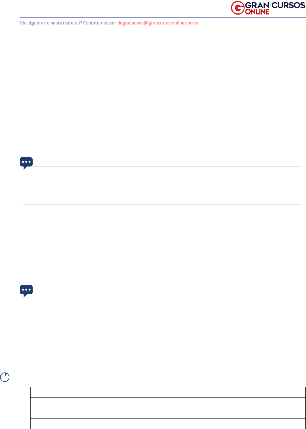 <p>1www.grancursosonline.com.br</p><p>Viu algum erro neste material? Contate-nos em: degravacoes@grancursosonline.com.br</p><p>A</p><p>N</p><p>O</p><p>TA</p><p>ÇÕ</p><p>E</p><p>S</p><p>Tóp. 12 – Base Nacional Comum Curricular (BNCC)</p><p>CONHECIMENTOS COMPLEMENTARES</p><p>TÓP. 12 – BASE NACIONAL COMUM CURRICULAR (BNCC)</p><p>10. A intersecção entre a formação dos alunos e os conhecimentos das áreas de Lingua-</p><p>gens, Matemática, Ciências da Natureza, Ciências Humanas e Ensino Religioso, em</p><p>conformidade com a BNCC, se dá através do desenvolvimento de:</p><p>a. Trabalho coletivo.</p><p>b. Pesquisas científicas.</p><p>c. Estudos de campo.</p><p>d. Competências e habilidades.</p><p>e. Participação em movimentos sociais.</p><p>COMENTÁRIO</p><p>Já que não há alusão às tecnologias, sabe-se que está se referindo ao ensino fundamental.</p><p>A intersecção das disciplinas se dá por meio das competências e habilidades, as quais são</p><p>mais amplas e abrangem todo o processo formativo.</p><p>11. Assinale a alternativa que representa o fundamento pedagógico da BNCC:</p><p>a. Prioriza a transmissão de conteúdos.</p><p>b. Foco no desenvolvimento de competências.</p><p>c. Os meios de ensino são responsáveis pelo sucesso na aprendizagem dos alunos.</p><p>d. Ênfase na terminalidade dos currículos.</p><p>e. Foco em uma única modalidade de ensino.</p><p>COMENTÁRIO</p><p>a. A BNCC pretende superar as características de um currículo tradicional, o que contraria</p><p>a alternativa.</p><p>b. A BNCC aborda constantemente o desenvolvimento de competências e habilidades.</p><p>A competência é a mobilização de conhecimentos, os quais são atribuídos por meio de</p><p>conceitos e de procedimentos. Além disso, também envolve as habilidades, estas que se</p><p>relacionam diretamente às práticas, às ações cognitivas e socioemocionais. Além disso, a</p><p>competência mobiliza as atividades e os valores. Isso é planejado, a fim de servir de me-</p><p>canismos à solução de problemas. Vale lembrar que há competências gerais e específicas.</p><p>5m</p><p>www.grancursosonline.com.br</p><p>2www.grancursosonline.com.br</p><p>Viu algum erro neste material? Contate-nos em: degravacoes@grancursosonline.com.br</p><p>A</p><p>N</p><p>O</p><p>TA</p><p>ÇÕ</p><p>E</p><p>S</p><p>Tóp. 12 – Base Nacional Comum Curricular (BNCC)</p><p>CONHECIMENTOS COMPLEMENTARES</p><p>c. A ideia não é atribuir sucesso a partir dos meios de ensino, pois ele se dará via ou-</p><p>tras ações.</p><p>d. O currículo é aberto e flexível.</p><p>e. Não há apenas uma modalidade de ensino mais assertiva e adequada em que de-</p><p>vemos focar.</p><p>12. A Base Nacional Comum Curricular (BNCC) se aplica:</p><p>a. À educação formal e não formal.</p><p>b. Exclusivamente à educação escolar.</p><p>c. Aos processos de ensino que acontecem na escola, no trabalho e na vida social.</p><p>d. À educação popular.</p><p>e. À educação profissional.</p><p>COMENTÁRIO</p><p>A BNCC está exclusivamente ligada à educação escolar, cujos objetivos são pontuais,</p><p>explícitos e mais bem delineados, pois a educação familiar tem outros objetivos e outras</p><p>perspectivas.</p><p>13. A BNCC (Base Nacional Comum Curricular) é referência nacional para os sistemas de en-</p><p>sino e para as instituições ou redes escolares públicas e privadas da Educação Básica, dos</p><p>sistemas federal, estaduais, distrital e municipais, para construírem ou revisarem os seus</p><p>currículos. Considerando o que preconiza a BNCC para o Ensino Fundamental, assinale,</p><p>nas afirmativas que se seguem, SIM para as VERDADEIRAS e NÃO para as FALSAS.</p><p>( ) � A BNCC, no Ensino Fundamental, está organizada em Áreas do Conhecimento.</p><p>�( ) O Conselho Nacional de Educação (CNE), mediante proposta de comissão especí-</p><p>fica, deliberará se o Ensino Religioso no Ensino Fundamental terá tratamento como</p><p>área do conhecimento ou como componente curricular da área de Ciências Humanas.</p><p>�( ) A BNCC dos anos iniciais do Ensino Fundamental aponta para a necessária articu-</p><p>lação com as experiências vividas na Educação Infantil.</p><p>www.grancursosonline.com.br</p><p>3www.grancursosonline.com.br</p><p>Viu algum erro neste material? Contate-nos em: degravacoes@grancursosonline.com.br</p><p>A</p><p>N</p><p>O</p><p>TA</p><p>ÇÕ</p><p>E</p><p>S</p><p>Tóp. 12 – Base Nacional Comum Curricular (BNCC)</p><p>CONHECIMENTOS COMPLEMENTARES</p><p>�( ) Conforme estabelece a BNCC, somente no 1º ano do Ensino Fundamental a ação</p><p>pedagógica deve ter como foco a alfabetização.</p><p>�( ) Em atendimento ao que determina a BNCC, as instituições escolares não poderão</p><p>adotar no processo de construção de suas propostas pedagógicas, formas de or-</p><p>ganização e propostas de progressão próprias.</p><p>A opção que contém a sequência correta, de cima para baixo, é:</p><p>a. SIM, NÃO, SIM, NÃO, SIM.</p><p>b. SIM, NÃO, NÃO, SIM, SIM.</p><p>c. SIM, SIM, SIM, NÃO, NÃO.</p><p>d. SIM, SIM, NÃO, NÃO, SIM.</p><p>COMENTÁRIO</p><p>1ª No ensino fundamental e no ensino médio, sim. Somente a educação infantil está orga-</p><p>nizada por campos de experiência.</p><p>2ª Esse é o texto que se encontra na resolução.</p><p>3ª Aponta para que exista a articulação por meio das experiências, ou seja, existe uma</p><p>transição da educação infantil para o ensino fundamental que não pode ser desprezada.</p><p>4ª Tanto no 1º quanto no 2º ano do ensino fundamental, a ação pedagógica deve ter como</p><p>foco a alfabetização.</p><p>5ª As escolas têm autonomia para adotar, no processo de construção de suas propostas</p><p>pedagógicas, formas de organização e propostas de progressão próprias.</p><p>14. Considerando os direitos de aprendizagem e desenvolvimento, a BNCC estabelece os</p><p>campos de experiências, n