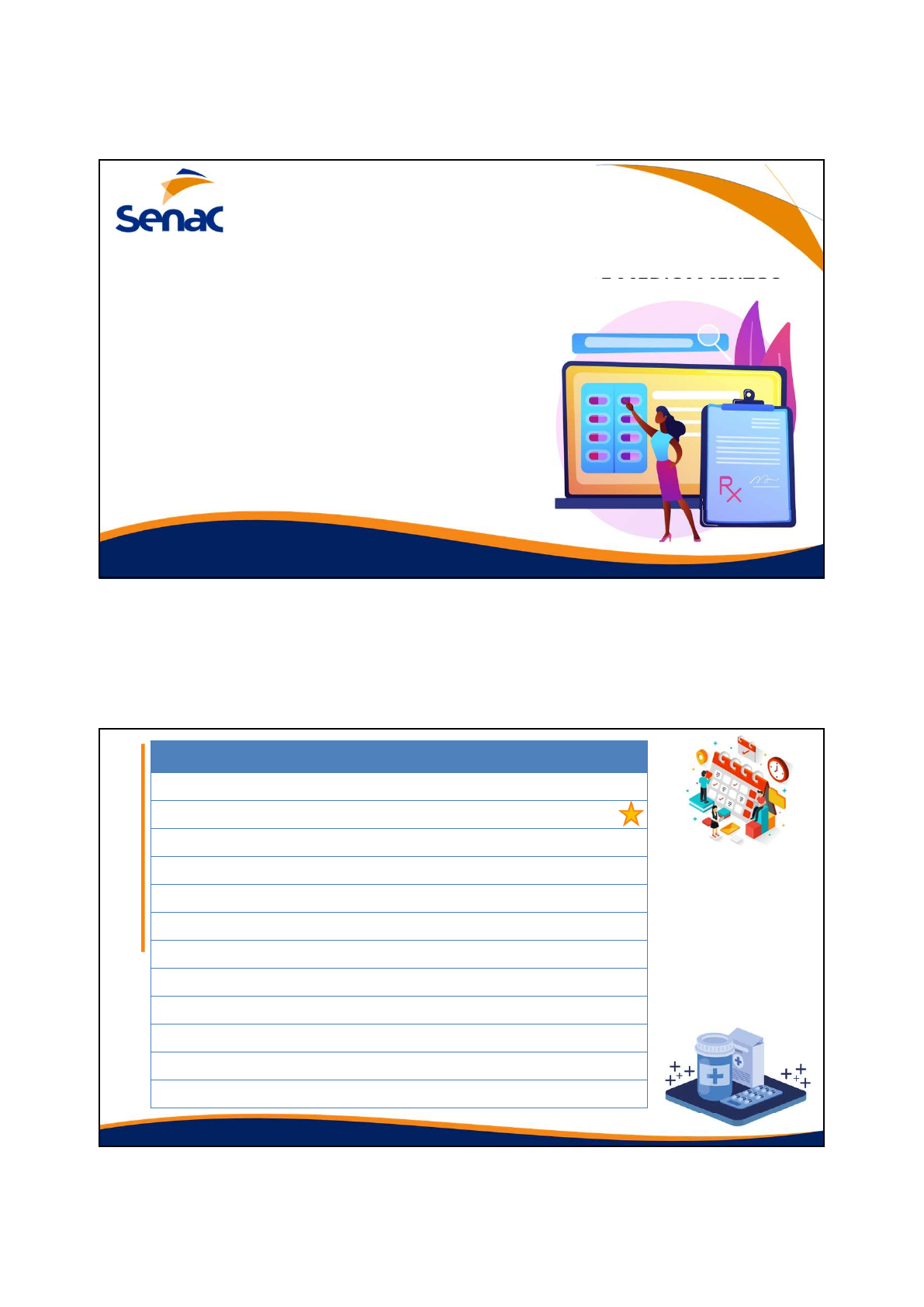 <p>10/11/2020</p><p>1</p><p>Aperfeiçoamento</p><p>Prof. MSc. M. Bruxel</p><p>Aula 02</p><p>CÁLCULOS E SEGURANÇA NA ADMINISTRAÇÃO DE MEDICAMENTOS</p><p>Indicador – Prepara medicamentos, aplicando técnicas de segurança, conforme protocolo da instituição..</p><p>FACULDADE SENAC PALHOÇA</p><p>C</p><p>ro</p><p>n</p><p>o</p><p>g</p><p>ra</p><p>m</p><p>a Aula TEMA</p><p>01 - (09/11) Introdução – Segurança na ADM de Medicamentos;</p><p>02 - (10/11) Tipos de Medicamentos e Cálculos base;</p><p>03 - (11/11) Vias de ADM e Conversão de medidas;</p><p>04 - (12/11) Regra de 3;</p><p>05 - (13/11) Diluição;</p><p>06 - (16/11) Hipodermóclise;</p><p>07 - (17/11) Cálculo de gotejamento;</p><p>08 - (18/11) Penicilinas;</p><p>09 - (19/11) Rediluição;</p><p>10 - (20/11) Exercícios e Revisão;</p><p>11 - (23/11) Atividade avaliativa;</p><p>12 - (24/11) Feedback e encerramento;</p><p>10/11/2020</p><p>2</p><p>Neurolépticos</p><p> Antidepressivos</p><p> Anticonvulsivante</p><p> Analgésicos, antitérmicos e anti-inflamatório</p><p> Antiespasmódicos</p><p> Insulina e Hipoglicemiantes orais</p><p> Cardiotônicos</p><p> Antiarrítmicos</p><p> Anti-hipertensivos</p><p> Vasodilatadores</p><p>Tipos:</p><p> Vasopressores</p><p> Anticoagulantes</p><p> Antitussígenos e mucolíticos</p><p> Broncodilatadores</p><p>Diuréticos</p><p> Antieméticos</p><p> Antiácidos</p><p> Bloqueadores de receptor H2</p><p> Catárticos</p><p> Constipantes\antidiarréicos.</p><p>Tipos:</p><p>10/11/2020</p><p>3</p><p>Formas de apresentação dos medicamentos</p><p>As drogas apresentam-se nos três estado físicos:</p><p>Sólidos;</p><p>Líquido;</p><p>Gasoso, além das formas semi-sólida ou intermediária e das radiações;</p><p>Apresentação</p><p>• Medicamentos sólidos:</p><p>São encontrados em forma de pós, comprimidos, drágeas,</p><p>cápsulas, pílulas, supositórios, óvulos vaginais, pérolas e bastões;</p><p>Apresentação</p><p>10/11/2020</p><p>4</p><p>• Supositórios Bastões Pílulas</p><p>Apresentação</p><p>Óvulos vaginais</p><p>Apresentação</p><p>10/11/2020</p><p>5</p><p>• Medicamentos líquidos:</p><p>São encontrados em forma de solução,</p><p>xarope, elixir, emulsão, suspensão, tintura,</p><p>extrato, colírio;</p><p>Apresentação</p><p>Extrato Colírio</p><p>Apresentação</p><p>10/11/2020</p><p>6</p><p>Medicamentos Gasosos</p><p>Encontra-se sob forma de aerossóis e vapores.</p><p>Apresentação</p><p>Medicamentos semi-sólidos</p><p>Pomada Creme Geleias</p><p>Apresentação</p><p>10/11/2020</p><p>7</p><p>Drogas Irradiantes</p><p>São representados por cobalto (radioterapia) ,</p><p>césios (forma liquida, usada para cura do cancro</p><p>ou câncer) , raios laser, iodo radioativos.</p><p>Apresentação</p><p>Cálculos básicos:</p><p>Para realizar as operações devemos:</p><p>• Os números devem ser alinhados um embaixo do outro, dispostos de maneira que unidade fique embaixo de</p><p>unidade, dezena embaixo de dezena, centena embaixo de centena e assim por diante.</p><p>• Se em um, ou todos os números houver vírgula, alinhar os números embaixo do outro; de maneira que fique</p><p>vírgula debaixo de vírgula, inteiro com inteiro, décimo com décimo, centésimo com centésimo e assim por</p><p>diante.</p><p>• Onde não há nenhum algarismo, preencher com zero (para igualar o número de casas decimais).</p><p>10/11/2020</p><p>8</p><p>Cálculos básicos:</p><p>Cálculos básicos:</p><p>10/11/2020</p><p>9</p><p>Cálculos básicos:</p><p>Exercícios (Soma)</p><p>1. 0,24 + 2,631 =</p><p>2. 1,78 + 0,2 =</p><p>3. 32,32 + 0,08 =</p><p>4. 0,0005 + 25,84 =</p><p>5. 4821,36 + 2,003 =</p><p>6. 0,009 + 0,02 =</p><p>7. 249,658 + 200,58 + 0,22 =</p><p>8. 0,123 + 1,123 + 2,12 =</p><p>9. 817,1 + 95,64 + 6.005,489 =</p><p>Cálculos básicos:</p><p>10/11/2020</p><p>10</p><p>Cálculos básicos:</p><p>Cálculos básicos:</p><p>10/11/2020</p><p>11</p><p>Cálculos básicos:</p><p>Exercícios (Subtração)</p><p>1. 12 - 2,048 =</p><p>2. 11,2 - 10,7 =</p><p>3. 54,35 - 0,08 =</p><p>4. 25,02 - 2,0084 =</p><p>5. 5.784,321 - 2.000 =</p><p>6. 0,108 - 0,03 =</p><p>7. 251,627 - 207,851 =</p><p>8. 5,12 - 1,895 =</p><p>9. 6.005,489 - 1.997,02 =</p><p>Cálculos básicos:</p><p>10/11/2020</p><p>12</p><p>Cálculos básicos:</p><p>10/11/2020</p><p>13</p><p>Cálculos básicos:</p><p>Cálculos básicos:</p><p>10/11/2020</p><p>14</p><p>Cálculos básicos:</p><p>ESEOSNUMEROSTIVESSEMVIRGULA? EX:5,3X6,8= REALIZA-SEOCÁLCULONORMALMENTECOMOSEASVIRGULASNÃOEXISTISSEM.</p><p>AOFINALONUMEROTOTALDECASASAPÓSAVIRGULAACOMPANHAORESULTADOFINAL.VEJA:5,3X6,8=35,36.</p><p>Lembre-se:</p><p>• Ao multiplicar um número inteiro por 10, acrescenta-se ao seu resultado um zero; ao multiplicar por 100,</p><p>acrescenta-se 2 zeros; por 1000, acrescenta-se 3 zeros e assim por diante. Ex: 5 X 10 = 50; 47 X 100 = 4700;</p><p>• Ao multiplicar um número decimal por 10, deve-se mover a vírgula uma posição para a direita, quando multiplica-</p><p>se por 100 a vírgula move-se para direita duas posições, e assim por diante. Ex: 0,5 X 10 = 5; 4,7 X 100 = 470;</p><p>Cálculos básicos:Exercícios (Multiplicação)</p><p>1. 234 X 0,4 =</p><p>2. 0,40 X 0,5 =</p><p>3. 32,4 X 4,1 =</p><p>4. 243 X 74 =</p><p>5. 0,4 X 23,1 =</p><p>6. 1,5 X 5,00 =</p><p>7. 1,5 X 2,53 =</p><p>8. 184 X 257 =</p><p>9. 324 X 48 =</p><p>10/11/2020</p><p>15</p><p>Cálculos básicos:</p><p>Cálculos básicos:</p><p>10/11/2020</p><p>16</p><p>Cálculos básicos:</p><p>Cálculos básicos:</p><p>Matematicamente é prevista a possibilidade de "arredondamento" de resultados (quociente); com</p><p>isso o resultado é considerado "aproximado" (representado pelo símbolo ≈ ou ≅). Para maior</p><p>precisão deve-se continuar a divisão, após a vírgula, pelo menos 2 casas. Ou seja: 250 ÷ 12 é igual a</p><p>20,83 ou ≅ 21.</p><p>Casos em que o divisor é menor que o dividendo?</p><p>10/11/2020</p><p>17</p><p>Cálculos básicos:</p><p>Ao dividir um número inte