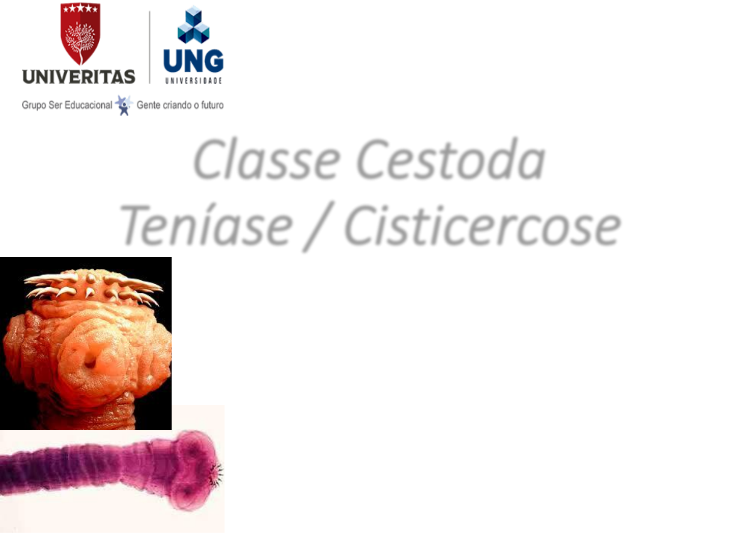 <p>Classe Cestoda</p><p>Teníase / Cisticercose</p><p>Profª Mª Patrícia Benvenuti Mendes</p><p>Biomédica – Analista Clínica</p><p>Mestra em Ciências da Saúde</p><p>patricia.benvenuti81@gmail.com</p><p>O complexo teníase/cisticercose constitui-se de</p><p>duas entidades mórbidas distintas, causadas pela</p><p>mesma espécie de cestódeo, em fases diferentes</p><p>do seu ciclo de vida.</p><p>Classe Cestoda</p><p>Reino Animalia</p><p>Sub-reino Metazoa</p><p>Filo Platyhelminthes</p><p>Classe Trematoda</p><p>Classe Cestoda</p><p>Filo Nematoda</p><p>Classe Cestoda</p><p>Classe Cestoda</p><p>Ordem Cyclophyllida</p><p>Família Teniidae</p><p>Família Hymenolepididae</p><p>Classe Cestoda</p><p>Taenia sollium</p><p>Taenia saginata</p><p>Hymenolepis nana</p><p>Teníase doença provocada pela presença da</p><p>forma adulta da Taenia solium ou da Taenia</p><p>saginata, no intestino delgado do homem</p><p>Cisticercose doença causada pela larva da Taenia</p><p>solium nos tecidos, ou seja, é uma enfermidade</p><p>somática.</p><p>Classe Cestoda</p><p>Os vermes adultos da T. saginata e T. solium</p><p>morfologicamente constam de:</p><p>• Escólex ou cabeça (órgão adaptado para a</p><p>fixação do cestoda na mucosa do intestino,</p><p>apresentando quatro ventosas formadas de</p><p>tecido muscular, arredondadas e</p><p>proeminentes),</p><p>• Rostro (presente somente em T. solium, com</p><p>25 a 50 acúleos),</p><p>Classe Cestoda</p><p>Morfologia</p><p>• Colo (situado abaixo do escólex, sem</p><p>segmentação, está em constante atividade</p><p>reprodutiva, dando origem a próglotes jovens)</p><p>• Estróbilo (é o corpo da tênia, formado pelas</p><p>proglotes, chegando a ter de 800 a mil</p><p>próglotes e atingir 3 metros na T. solium ou até</p><p>8 metros na T. saginata, com mais de mil</p><p>próglotes).</p><p>Classe Cestoda</p><p>Morfologia</p><p>• Proglotes são subdivididas em jovens, maduras</p><p>ou grávidas, tendo cada uma individualidade</p><p>alimentar e reprodutivas.</p><p>• Cada próglote madura apresenta órgãos</p><p>genitais masculinos e femininos desenvolvidos</p><p>e aptos para a fecundação.</p><p>• A próglote grávida da T. solium é quadrangular,</p><p>contendo aproximadamente 80 mil ovos cada,</p><p>enquanto a proglote de T. saginata é</p><p>retangular, contendo até 160 mil ovos</p><p>Classe Cestoda</p><p>Morfologia</p><p>Classe Cestoda</p><p>Morfologia</p><p>Classe Cestoda</p><p>Morfologia</p><p>Classe Cestoda</p><p>Morfologia</p><p>Classe Cestoda</p><p>Morfologia</p><p>Classe Cestoda</p><p>Morfologia</p><p>Taenia Solium:</p><p>• Hábitat: 1/3 superior do Intestino</p><p>Delgado</p><p>• Rostelo em forma de sol</p><p>• 2 a 3 metros (máx. 10m) com 800 a</p><p>1.000 segmentos</p><p>• Acúleos: 20 a 50 no rostro.</p><p>• Proglótides anteriores: mais largas</p><p>•Proglótides posteriores: mais</p><p>compridas</p><p>• Hospedeiro intermediário: Porco</p><p>(humano)</p><p>Classe Cestoda</p><p>Morfologia</p><p>Taenia saginata</p><p>• Hábitat: 1/3 superior do Intestino</p><p>Delgado</p><p>• sem rostro nem acúleos</p><p>• 4 a 10m com até 2.000</p><p>segmentos</p><p>• Proglótides anteriores: mais</p><p>largas</p><p>• Proglótides posteriores: mais</p><p>compridas até 3 vezes a largura.</p><p>• Oviposição na região perianal</p><p>• Hospedeiro intermediário: Bovino</p><p>• Os ovos são microscópicos e são constituídos</p><p>por uma casca protetora formada de quitina.</p><p>• Dentro encontra-se o embrião com dupla</p><p>membrana e três pares de acúleos.</p><p>• É impossível distinguir os ovos de T. solium e T.</p><p>saginata</p><p>Classe Cestoda</p><p>Morfologia</p><p>Classe Cestoda</p><p>Morfologia</p><p>Teníase – é adquirida através do consumo de</p><p>carne crua ou insuficientemente cozida contendo</p><p>os cisticercos (larvas).</p><p>Cisticercose – através do consumo de alimentos</p><p>contaminados com os ovos da tênia, frutas,</p><p>verduras, hortaliças que não são higienizados</p><p>corretamente, através do consumo de água</p><p>contaminada, ou ainda, pode haver a auto-</p><p>infecção.</p><p>Classe Cestoda</p><p>Transmissão</p><p>O homem parasitado elimina as próglotes</p><p>grávidas cheias de ovos para o meio exterior.</p><p>Ocasionalmente as estas podem se romper no</p><p>próprio intestino chegando ao meio externo.</p><p>Classe Cestoda</p><p>Ciclo biológico</p><p>Um hospedeiro intermediário (boi e porco) ingere</p><p>os ovos, os quais sofrem ações de enzimas em seu</p><p>estômago, se rompem no intestino e liberam os</p><p>embriões, os quais penetram nos tecidos,</p><p>permanecem lá por um tempo e logo após</p><p>penetram nas vênulas.</p><p>Classe Cestoda</p><p>Ciclo biológico</p><p>Na corrente sanguínea, os embriões são</p><p>transportados a todos os órgãos e tecidos do</p><p>organismo.</p><p>Os embriões se desenvolvem para cisticercos em</p><p>qualquer tecido mole, mas preferem os músculos</p><p>cardíacos, o cérebro e permanecem viáveis nestes</p><p>por alguns meses.</p><p>Classe Cestoda</p><p>Ciclo biológico</p><p>Quando o homem ingere a carne crua ou mal</p><p>cozida de boi ou porco infectados, o cisticerco</p><p>sofre ação do suco gástrico, prende-se através do</p><p>escólex na membrana intestinal delgada, onde</p><p>transforma-se em tênia adulta.</p><p>Três meses após a ingestão inicia-se a eliminação</p><p>das proglotes grávidas.</p><p>Classe Cestoda</p><p>Ciclo biológico</p><p>Classe Cestoda</p><p>Ciclo biológico</p><p>Teníase – é adquirida pelo homem quando ele</p><p>ingere carne o cisticerco (larva) e este evolui para</p><p>a forma adulta no intestino delgado.</p><p>O verme adulto se fixa e começa a expelir os ovos</p><p>e proglótides, que são excretados nas fezes</p><p>humanas e podem contaminar o solo, a água e os</p><p>alimentos.</p><p>Classe Cestoda</p><p>Ciclo biológico</p><p>Classe Cestoda</p><p>Ciclo biológico</p><p