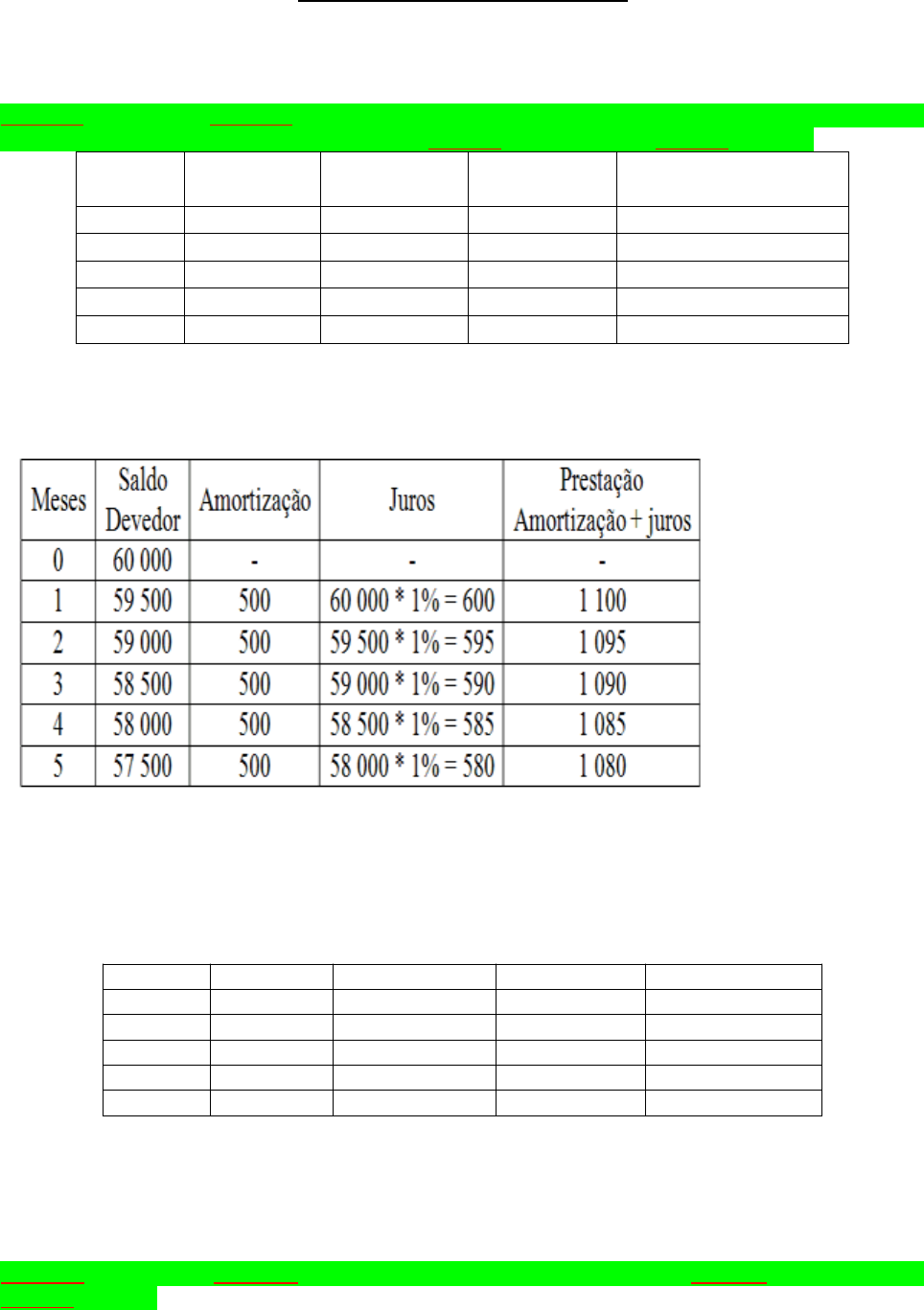 <p>Lista de exercícios – Amortização</p><p>1. Um empréstimo de R$ 30 000,00 deve ser devolvido de acordo com o sistema de amortizações constantes em 30 prestações mensais a taxa de juros de 1% ao mês. Construa a planilha referente as 4 primeiras prestações.</p><p>Passo 1: Price ou Sac? Passo 2: se for SAC, dividir o valor do empréstimo pelas prestações, com isso se sabe o saldo devedor e a amortização por período. Passo 3: calcular os juros. Passo 4: A + J = P</p><p>Mês</p><p>Parcela</p><p>Amortização</p><p>Juros</p><p>Saldo devedor</p><p>0</p><p>30.000</p><p>1</p><p>1300</p><p>1000</p><p>300</p><p>29.000</p><p>2</p><p>1290</p><p>1000</p><p>290</p><p>28.000</p><p>3</p><p>1280</p><p>1000</p><p>280</p><p>27.000</p><p>4</p><p>1270</p><p>1000</p><p>270</p><p>26.000</p><p>2. Um empréstimo de R$ 60 000,00 deve ser devolvido de acordo com o sistema de amortizações constantes em 120 prestações mensais a taxa de juros de 1% ao mês.</p><p>a) Construa a planilha referente as 5 primeiras prestações.</p><p>b) Calcule o total de juros pagos nessas 5 primeiras prestações</p><p>Resposta: R$2.950</p><p>3. Montar a planilha financeira do Sistema de Amortização Constante para um financiamento de R$1.000 a 3% ao mês, com prazo de 4 meses, amortizável em quatro prestações mensais.</p><p>Mês</p><p>Parcela</p><p>Amortização</p><p>Juros</p><p>Saldo devedor</p><p>0</p><p>1000</p><p>1</p><p>280</p><p>250</p><p>30</p><p>750</p><p>2</p><p>272,5</p><p>250</p><p>22,5</p><p>500</p><p>3</p><p>265</p><p>250</p><p>15</p><p>250</p><p>4</p><p>257,5</p><p>250</p><p>7,5</p><p>0</p><p>4. Calcule a prestação de um empréstimo pelo sistema PRICE, de 32.000 reais, que será pago em 36 prestações (36 meses) com uma taxa de juros de 2,5% a.m.</p><p>Resposta: R$1.358,45</p><p>5. Faça uma tabela Price usando as informações acima para os primeiros 3 meses de prestação.</p><p>Passo 1: Price ou Sac? Passo 2: se for Price, descobrir o valor da prestação. Passo 3: calcular os juros. Passo 4: P – J = A</p><p>Mês</p><p>Prestação</p><p>Amortização</p><p>Juros</p><p>Saldo Devedor</p><p>0</p><p>32.000</p><p>1</p><p>1.358,45</p><p>558,45</p><p>800</p><p>31.441,55</p><p>2</p><p>1.358,45</p><p>572,41</p><p>786,04</p><p>30.869,14</p><p>3</p><p>1.358,45</p><p>586,72</p><p>771,73</p><p>30.282,42</p><p>6. Qual a prestação de um empréstimo feito no sistema Price, envolvendo a quantia de R$ 30.000,00 divididos em 12 parcelas a juros mensais de 1,5%.</p><p>Resposta: R$2750,40</p><p>7. Monte uma planilha financeira com as três primeiras prestações, levando em consideração os dados do exemplo anterior.</p><p>Mês</p><p>Parcela</p><p>Amortização</p><p>Juros</p><p>Saldo devedor</p><p>0</p><p>30000</p><p>1</p><p>2750,40</p><p>2.300,40</p><p>450</p><p>27.699,60</p><p>2</p><p>2750,40</p><p>2.334,91</p><p>415,49</p><p>25.364,69</p><p>3</p><p>2750,40</p><p>2.369,93</p><p>380,47</p><p>22.994,77</p><p>image1.png</p>