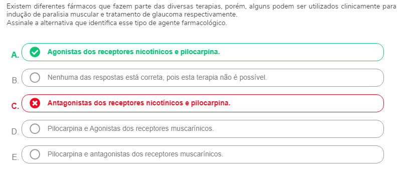 <p>Existem diferentes fármacos que fazem parte das diversas alguns podem ser utilizados clinicamente para indução de paralisia muscular e tratamento de glaucoma respectivamente. Assinale a alternativa que identifica esse tipo de agente farmacológico. A. Agonistas dos receptores nicotínicos e pilocarpina. B. Nenhuma das respostas está correta, pois esta terapia não é C. x Antagonistas dos receptores nicotínicos e pilocarpina. D. Pilocarpina e Agonistas dos receptores E. Pilocarpina e antagonistas dos receptores</p>