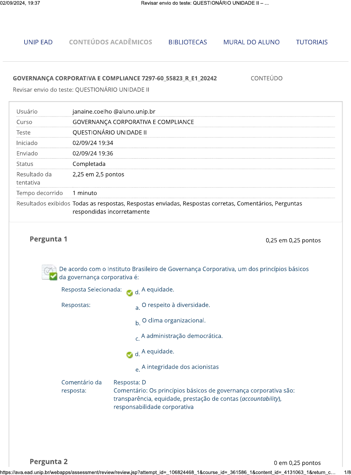 <p>02/09/2024, 19:37 Revisar envio do teste: QUESTIONÁRIO UNIDADE - UNIP EAD CONTEÚDOS ACADÊMICOS BIBLIOTECAS MURAL DO ALUNO TUTORIAIS GOVERNANÇA CORPORATIVA E COMPLIANCE 7297-60_55823_R_E1_20242 CONTEÚDO Revisar envio do teste: QUESTIONÁRIO UNIDADE Usuário Curso GOVERNANÇA CORPORATIVA E COMPLIANCE Teste QUESTIONÁRIO UNIDADE Iniciado 02/09/24 19:34 Enviado 02/09/24 19:36 Status Completada Resultado da 2,25 em 2,5 pontos tentativa Tempo decorrido 1 minuto Resultados exibidos Todas as respostas, Respostas enviadas, Respostas corretas, Comentários, Perguntas respondidas incorretamente Pergunta 1 0,25 em 0,25 pontos De acordo com o Instituto Brasileiro de Governança Corporativa, um dos princípios básicos da governança corporativa é: Resposta Selecionada: d. A equidade. Respostas: respeito à diversidade. a. b. clima organizacional. A administração democrática. C. d. A equidade. e. A integridade dos acionistas Comentário da Resposta: D resposta: Comentário: Os princípios básicos de governança corporativa são: transparência, equidade, prestação de contas (accountability), responsabilidade corporativa Pergunta 2 0 em 0,25 pontos 1/8</p><p>02/09/2024, 19:37 Revisar envio do teste: QUESTIONÁRIO UNIDADE - O risco de reputação decorre da visão desfavorável da imagem de uma empresa pelos próprios clientes, contrapartes e acionistas. Quanto a essa categoria de risco, assinale a alternativa correta. Resposta x e. Selecionada: Consiste em uma categoria de risco objetiva, o que facilita a respectiva mensuração, requerendo menos atenção que os riscos financeiros. Respostas: Representa um risco essencialmente financeiro. a. b. É o mesmo que risco legal, portanto, um risco não financeiro primário. C. Trata-se de um risco secundário, que não implica possibilidade de perda financeira. d. São exemplos de fatores de risco de reputação a participação em ações danosas ao meio ambiente e a relação conflituosa com clientes e contrapartes. e. Consiste em uma categoria de risco objetiva, o que facilita a respectiva mensuração, requerendo menos atenção que os riscos financeiros. Pergunta 3 0,25 em 0,25 pontos São princípios básicos da boa prática de governança corporativa e compliance:</p><p>02/09/2024, 19:37 Revisar envio do teste: QUESTIONÁRIO UNIDADE - Resposta C. Selecionada: Transparência, equidade, prestação de contas e responsabilidade. Respostas: a. Legalidade, legitimidade e transparência. b. Impessoalidade, competência, efetividade. C. Transparência, equidade, prestação de contas e responsabilidade. d. Eficiência, eficácia e competitividade. Competência, profissionalismo e formalidade. e. Comentário da Resposta: C resposta: Comentário: São princípios básicos de governança corporativa: transparência, equidade, prestação de contas (accountability), responsabilidade corporativa. Pergunta 4 0,25 em 0,25 pontos Conforme apresenta o (IBGC) Instituto Brasileiro de Governança Corporativa, os quatro princípios básicos da governança corporativa são transparência, equidade, responsabilidade corporativa e prestação de contas. O princípio da equidade significa: 3/8</p><p>02/09/2024, 19:37 Revisar envio do teste: QUESTIONÁRIO UNIDADE - Resposta b. Selecionada: Deve tratar de forma igual e justa todos os seus sócios ou acionistas, colaboradores e stakeholders. Respostas: Não deve fugir às características especificadas pela sua missão. a. b. Deve tratar de forma igual e justa todos os seus sócios ou acionistas, colaboradores e stakeholders. C. Deve realizar benchmarkings periódicos para manter a padronização dos processos. d. Deve garantir uma produção de bens ou serviços com base nas regras do ISO 9001. e. Deve buscar uma divisão igualitária de recursos para todos os seus funcionários. Comentário da Resposta: B resposta: Comentário: O princípio da equidade é caracterizado pelo tratamento justo e isonômico de todos os sócios ou acionistas, colaboradores e stakeholders. Pergunta 5 0,25 em 0,25 pontos Os agentes de governança devem zelar pela viabilidade econômico-financeira das organizações, reduzir as externalidades negativas de seus negócios e suas operações e aumentar as positivas, levando em consideração, no seu modelo de negócios, os diversos capitais (financeiro, manufaturado, intelectual, humano, social, ambiental, reputacional, etc.) no curto, médio e longo prazos. texto acima trata de um dos princípios básicos da governança corporativa, que é o da: Resposta Selecionada: d. Responsabilidade corporativa. Respostas: a. Equidade. b. Transparência. Prestação de contas. C. d. Responsabilidade corporativa. e. Valorização dos acionistas majoritários. 4/8</p><p>02/09/2024, 19:37 Revisar envio do teste: QUESTIONÁRIO UNIDADE - Comentário da Resposta: D resposta: Comentário: O enunciado é a exata cópia do princípio da Responsabilidade Corporativa, presente no Código das Melhores Práticas do IBGC. Pergunta 6 0,25 em 0,25 pontos "Governança corporativa é o sistema pelo qual as organizações são dirigidas, monitoradas e incentivadas, envolvendo os relacionamentos entre Proprietários, Conselho de Administração, Diretoria e órgãos de controle. As boas práticas de governança corporativa convertem princípios em recomendações objetivas, alinhando interesses com a finalidade de preservar e otimizar o valor da organização, facilitando seu acesso a recursos e contribuindo para a sua longevidade". A definição está contida no seguinte documento: Resposta C. Selecionada: Código das Melhores Práticas de Governança Corporativa, do IBGC. Respostas: Regulamento do Novo Mercado, da BM&F Bovespa. a. b. Guia Prático para Investidores, da AMBIMA. C. Código das Melhores Práticas de Governança Corporativa, do IBGC. d. Manual de Governança Corporativa, do Banco Central. e. Código de Boas Práticas de Governança, do Ministério da Fazenda. Comentário Resposta: C da resposta: Comentár