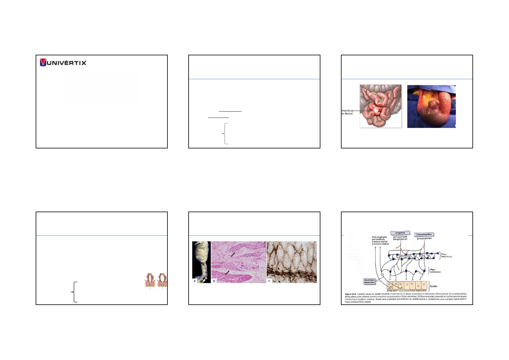 <p>21/09/2024</p><p>1</p><p>Patologia II</p><p>Patologias do</p><p>INSTESTINOS</p><p>Prof. Rogério Oliva Carvalho</p><p>Anomalias congênitas</p><p> É a malformação congênita mais frequente do intestino delgado →</p><p>persistência do ducto onfalomesentérico</p><p> Divertículo verdadeiro → a cerca de 80 cm da válvula ileocecal.</p><p> Diagnosticado → laparotomia ou necrópsia.</p><p> Muitas vezes assintomático</p><p> Casos sintomáticos → associada a heterotopia de mucosa gástrica ou</p><p>parênquima pancreático.</p><p> Complicações</p><p>Divertículo de Meckel</p><p>• Inflamação (diverticulite),</p><p>• úlcera péptica,</p><p>• perfuração</p><p>• hemorragia digestiva (50% dos casos).</p><p>Anomalias congênitas</p><p>Divertículo de Meckel</p><p>Divertículo de 0,5 a 6,0 cm.</p><p>Na borda antimesentérica do íleo</p><p>Megacólon congênito (doença de Hirchsprung) ou</p><p>aganglionose congênita do cólon</p><p>Anomalias congênitas</p><p> Ausência de células ganglionares nos plexos nervosos que</p><p>coordenam a motilidade intestinal.</p><p> Homens> mulheres (4:1)</p><p> 10% dos casos em crianças com a síndrome de Down.</p><p> Compromete → cólon distal e o reto (perde motilidade)</p><p> Diagnóstico → Biopsia retal e manometria- anorretal (pressão do</p><p>esfíncter anal e reflexos neurais do reto)</p><p> Sinal clínico:</p><p> Período neonatal → ausência de</p><p>eliminação de mecônio, distensão</p><p>abdominal e vômitos</p><p> Constipação intestinal crônica</p><p>Megacólon congênito (doença de Hirchsprung) ou</p><p>aganglionose congênita do cólon</p><p>Anomalias congênitas</p><p>A. Segmento intestinal agangliônico contraído (estreito), com dilatação a</p><p>montante.</p><p>B. Ausência de células ganglionares nos plexos nervosos mioentéricos (setas).</p><p>C. Acetilcolinesterase positiva nas fibras nervosas da mucosa (histoquímica).</p><p>21/09/2024</p><p>2</p><p>Anomalias</p><p>Megacólon adquirido</p><p> Principalmente na doença de Chagas (Trypanosoma cruzi ) →</p><p>destruição dos neurônios dos plexos nervosos mioentéricos.</p><p>Outras causas:</p><p> Complicação de colite ulcerativa idiopática;</p><p> Dilatação por distúrbios psicossomáticos.</p><p>Megacólon chagásico.</p><p>Dilatação acentuada do retossigmoide.</p><p>Obstrução intestinal</p><p> Hérnias,</p><p> Aderências intestinais,</p><p> Intussuscepção</p><p> Vólvulo</p><p> Tumores</p><p> Infartos</p><p>Etiologias</p><p>80%</p><p>Manifestações clínicas:</p><p> Dor abdominal,</p><p> Distensão abdominal,</p><p> Vômitos,</p><p> Obstipação intestinal.</p><p>Obstrução intestinal</p><p>Obstrução intestinal</p><p>Intussuscepção</p><p> Consiste na penetração de um segmento do intestino no interior do</p><p>segmento imediatamente distal → mais frequente válvula ileocecal</p><p> Resulta em infarto do segmento invaginado</p><p> Ocorre principalmente na infância. (principal causa obstrução em</p><p>crianças < 2 anos)</p><p>intussuscepção íleo-cólica.</p><p>Obstrução intestinal</p><p>Intussuscepção</p><p> Sinais clínicos:</p><p>Principais Causas:</p><p>• Tumores (principalmente os pediculados);</p><p>• Hemorragia, que produz alterações circulatórias e tumefação da</p><p>área envolvida;</p><p>• Traumatismos,</p><p>• Contração espasmódica de um segmento;</p><p>• Espasmo anóxico;</p><p>• Úlceras intestinais;</p><p>• Divertículos;</p><p>• Corpos estranhos.</p><p> Dor abdominal em cólica,</p><p> Eliminação de sangue e muco nas fezes.</p><p>Obstrução intestinal</p><p>Hérnia Abdominal</p><p>Deslocamentos de porções de vísceras intestinais para fora da cavidade</p><p>peritoneal por fragilidade ou defeito na parede da cavidade peritoneal</p><p> Orifícios naturais</p><p> Traumatismo ou aumento da pressão peritoneal,</p><p> Cirurgias,</p><p> Inflamação.</p><p> Hiato diafragmático,</p><p> Hiato do cordão espermático</p><p> Cicatriz umbilical</p><p>21/09/2024</p><p>3</p><p>Obstrução intestinal</p><p>Hérnia Abdominal</p><p>Pode ser:</p><p>Congênita (indireto) ou adquirida (direto)</p><p>Redutível (volta para cavidade abdominal)</p><p> Irredutível</p><p>Encarcerada (1)</p><p>Estrangulada (2)</p><p>(1) (2)</p><p>Patogenia: compromete a drenagem venosa→ infarto do segmento</p><p>herniado.</p><p>Obstrução intestinal</p><p>Hérnia Abdominal</p><p>Partes da hernia</p><p> Anel herniário</p><p> Saco herniário (peritônio parietal)</p><p> Conteúdo da hernia</p><p>Sinais e Sintomas</p><p>• Abaulamento visível</p><p>• Dor no abdómen, geralmente na zona da hérnia;</p><p>• Dor progressiva intensa → hérnia estrangulada;</p><p>• Edema e pele avermelhada ou roxa no local da hérnia;</p><p>• Náuseas;</p><p>• Vómitos;</p><p>• Febre;</p><p>• Obstipação (intestino preso).</p><p>Obstrução intestinal</p><p>Hérnia Abdominal</p><p>Obstrução intestinal</p><p>Vólvulo (volvo) intestinal</p><p> Torção de alça intestinal sobre si mesma → obstrução da luz e</p><p>compressão vascular → infarto e gangrena → Ruptura e Peritonite</p><p>Mais comum: no sigmoide (90%) (megacólon chagásico); no ceco ou</p><p>no íleo.</p><p> Fatores</p><p>predisponentes:</p><p> dilatação e alongamento do cólon e do sigmoide</p><p>→ megacólon chagásico,</p><p> mesentério anormalmente longo (incapaz de fixar</p><p>o cólon e o sigmoide)</p><p>Obstrução intestinal</p><p>Vólvulo (volvo) intestinal</p><p> Em jovens → quadro de abdome agudo obstrutivo,</p><p> Em idosos → evolução de dias ou meses, simulando obstrução por</p><p>câncer.</p><p>Volvo sigmoide</p><p>Obstrução intestinal</p><p>Aderências (bridas)</p><p>Pontes fibrosas entre os segmentos intestinais e/ou a parede</p><p>abdominal ou no local de uma cirurgia.</p><p> Etiologias:</p><p> Complicação: Podem estrangular alças intestinais e causar</p><p>obstrução mecânica.</p><p> Mais comuns em mulher