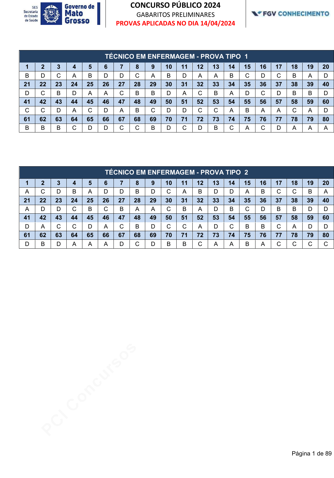 <p>pcimarkpci MjgwNDowZDQ3OjdhMmU6NjgwMDowMDQ5OmU2MmI6NGM5ZjpjMGEw:V2VkLCAyNSBTZXAgMjAyNCAxMTo1NzoxOSAtMDMwMA==</p><p>www.pciconcursos.com.br</p><p>CONCURSO PÚBLICO 2024</p><p>GABARITOS PRELIMINARES</p><p>PROVAS APLICADAS NO DIA 14/04/2024</p><p>Página 1 de 89</p><p>TÉCNICO EM ENFERMAGEM - PROVA TIPO 1</p><p>1 2 3 4 5 6 7 8 9 10 11 12 13 14 15 16 17 18 19 20</p><p>B D C A B D D C A B D A A B C D C B A D</p><p>21 22 23 24 25 26 27 28 29 30 31 32 33 34 35 36 37 38 39 40</p><p>D C B D A A C B B D A C B A D C D B B D</p><p>41 42 43 44 45 46 47 48 49 50 51 52 53 54 55 56 57 58 59 60</p><p>C C D A C D A B C D D C C A B A A C A D</p><p>61 62 63 64 65 66 67 68 69 70 71 72 73 74 75 76 77 78 79 80</p><p>B B B C D D C C B D C D B C A C D A A A</p><p>TÉCNICO EM ENFERMAGEM - PROVA TIPO 2</p><p>1 2 3 4 5 6 7 8 9 10 11 12 13 14 15 16 17 18 19 20</p><p>A C D B A D D B D C A B D D A B C C B A</p><p>21 22 23 24 25 26 27 28 29 30 31 32 33 34 35 36 37 38 39 40</p><p>A D D C B C B A A C B A D B C D B B D D</p><p>41 42 43 44 45 46 47 48 49 50 51 52 53 54 55 56 57 58 59 60</p><p>D A C C D A C B D C C A D C B B C A D D</p><p>61 62 63 64 65 66 67 68 69 70 71 72 73 74 75 76 77 78 79 80</p><p>D B D A A A D C D B B C A A B A C C C C</p><p>pcimarkpci MjgwNDowZDQ3OjdhMmU6NjgwMDowMDQ5OmU2MmI6NGM5ZjpjMGEw:V2VkLCAyNSBTZXAgMjAyNCAxMTo1NzoxOSAtMDMwMA==</p><p>www.pciconcursos.com.br</p><p>CONCURSO PÚBLICO 2024</p><p>GABARITOS PRELIMINARES</p><p>PROVAS APLICADAS NO DIA 14/04/2024</p><p>Página 2 de 89</p><p>TÉCNICO EM FARMÁCIA - PROVA TIPO 1</p><p>1 2 3 4 5 6 7 8 9 10 11 12 13 14 15 16 17 18 19 20</p><p>B D C A B D D C A B D A A B C D C B A D</p><p>21 22 23 24 25 26 27 28 29 30 31 32 33 34 35 36 37 38 39 40</p><p>D C B D A A C B B D A C B A D C D B B D</p><p>41 42 43 44 45 46 47 48 49 50 51 52 53 54 55 56 57 58 59 60</p><p>C C D A C D A B C D D C C A D B C A D C</p><p>61 62 63 64 65 66 67 68 69 70 71 72 73 74 75 76 77 78 79 80</p><p>B A C C D A A D D B A C B D A C A C D C</p><p>pcimarkpci MjgwNDowZDQ3OjdhMmU6NjgwMDowMDQ5OmU2MmI6NGM5ZjpjMGEw:V2VkLCAyNSBTZXAgMjAyNCAxMTo1NzoxOSAtMDMwMA==</p><p>www.pciconcursos.com.br</p><p>CONCURSO PÚBLICO 2024</p><p>GABARITOS PRELIMINARES</p><p>PROVAS APLICADAS NO DIA 14/04/2024</p><p>Página 3 de 89</p><p>TÉCNICO EM IMOBILIZAÇÃO ORTOPÉDICA ( GESSO) - PROVA TIPO 1</p><p>1 2 3 4 5 6 7 8 9 10 11 12 13 14 15 16 17 18 19 20</p><p>B D C A B D D C A B D A A B C D C B A D</p><p>21 22 23 24 25 26 27 28 29 30 31 32 33 34 35 36 37 38 39 40</p><p>D C B D A A C B B D A C B A D C D B B D</p><p>41 42 43 44 45 46 47 48 49 50 51 52 53 54 55 56 57 58 59 60</p><p>C C D A C D A B C D D C C A B D B C A A</p><p>61 62 63 64 65 66 67 68 69 70 71 72 73 74 75 76 77 78 79 80</p><p>D C B D A B B A A C D B B D A A C B A A</p><p>pcimarkpci MjgwNDowZDQ3OjdhMmU6NjgwMDowMDQ5OmU2MmI6NGM5ZjpjMGEw:V2VkLCAyNSBTZXAgMjAyNCAxMTo1NzoxOSAtMDMwMA==</p><p>www.pciconcursos.com.br</p><p>CONCURSO PÚBLICO 2024</p><p>GABARITOS PRELIMINARES</p><p>PROVAS APLICADAS NO DIA 14/04/2024</p><p>Página 4 de 89</p><p>TÉCNICO EM MANUTENÇÃO DE EQUIPAMENTOS MÉDICO HOSPITALARES - PROVA TIPO 1</p><p>1 2 3 4 5 6 7 8 9 10 11 12 13 14 15 16 17 18 19 20</p><p>B D C A B D D C A B D A A B C D C B A D</p><p>21 22 23 24 25 26 27 28 29 30 31 32 33 34 35 36 37 38 39 40</p><p>D C B D A A C B B D A C B A D C D B B D</p><p>41 42 43 44 45 46 47 48 49 50 51 52 53 54 55 56 57 58 59 60</p><p>C C D A C D A B C D D C C A C C B A C A</p><p>61 62 63 64 65 66 67 68 69 70 71 72 73 74 75 76 77 78 79 80</p><p>B C A C D B C A A B A B C C C B C B B A</p><p>pcimarkpci MjgwNDowZDQ3OjdhMmU6NjgwMDowMDQ5OmU2MmI6NGM5ZjpjMGEw:V2VkLCAyNSBTZXAgMjAyNCAxMTo1NzoxOSAtMDMwMA==</p><p>www.pciconcursos.com.br</p><p>CONCURSO PÚBLICO 2024</p><p>GABARITOS PRELIMINARES</p><p>PROVAS APLICADAS NO DIA 14/04/2024</p><p>Página 5 de 89</p><p>TÉCNICO EM ÓRTESE E PRÓTESE - PROVA TIPO 1</p><p>1 2 3 4 5 6 7 8 9 10 11 12 13 14 15 16 17 18 19 20</p><p>B D C A B D D C A B D A A B C D C B A D</p><p>21 22 23 24 25 26 27 28 29 30 31 32 33 34 35 36 37 38 39 40</p><p>D C B D A A C B B D A C B A D C D B B D</p><p>41 42 43 44 45 46 47 48 49 50 51 52 53 54 55 56 57 58 59 60</p><p>C C D A C D A B C D D C C A A C C B C D</p><p>61 62 63 64 65 66 67 68 69 70 71 72 73 74 75 76 77 78 79 80</p><p>A D D C D C B D D B A A C B A D C B C C</p><p>pcimarkpci MjgwNDowZDQ3OjdhMmU6NjgwMDowMDQ5OmU2MmI6NGM5ZjpjMGEw:V2VkLCAyNSBTZXAgMjAyNCAxMTo1NzoxOSAtMDMwMA==</p><p>www.pciconcursos.com.br</p><p>CONCURSO PÚBLICO 2024</p><p>GABARITOS PRELIMINARES</p><p>PROVAS APLICADAS NO DIA 14/04/2024</p><p>Página 6 de 89</p><p>TÉCNICO EM PATOLOGIA CLÍNICA - PROVA TIPO 1</p><p>1 2 3 4 5 6 7 8 9 10 11 12 13 14 15 16 17 18 19 20</p><p>B D C A B D D C A B D A A B C D C B A D</p><p>21 22 23 24 25 26 27 28 29 30 31 32 33 34 35 36 37 38 39 40</p><p>D C B D A A C B B D A C B A D C D B B D</p><p>41 42 43 44 45 46 47 48 49 50 51 52 53 54 55 56 57 58 59 60</p><p>C C D A C D A B C D D C C A A C C B C D</p><p>61 62 63 64 65 66 67 68 69 70 71 72 73 74 75 76 77 78 79 80</p><p>D A B D D A B D C C B A D B B A D C C A</p><p>pcimarkpci MjgwNDowZDQ3OjdhMmU6NjgwMDowMDQ5OmU2MmI6NGM5ZjpjMGEw:V2VkLCAyNSBTZXAgMjAyNCAxMTo1NzoxOSAtMDMwMA==</p><p>www.pciconcursos.com.br</p><p>CONCURSO PÚBLICO 2024</p><p>GABARITOS PRELIMINARES</p><p>PROVAS APLICADAS NO DIA 14/04/2024</p><p>Página 7 de 89</p><p>TÉCNICO EM RADIOLOGIA - PROVA TIPO 1</p><p>1 2 3 4 5 6 7 8 9 10 11 12 13 14 15 16 17 18 19 20</p><p>B D C A B D D C A B D A A B C D C B A D</p><p>21 22 23 24 25 26 27 28 29 30 31 32 33 34 35 36 37 38 39 40</p><p>D C B D A A C B B D A C B A D C D B B D</p><p>41 42 43 44 45 46 47 48 49 50 51 52 53 54 55 56 57 58 59 60</p><p>C C D A C D A B C D D C C A D C A B C A</p><p>61 62 63 64 65 66 67 68 69 70 71 72 73 74 75 76 77 78 79 80</p><p>C B C D A B C A B A C A D A A B D B C B</p><p>pcimarkpci MjgwNDowZDQ3OjdhMmU6NjgwMDowMDQ5OmU2MmI6NGM5ZjpjMGEw:V2VkLCAyNSBTZXAgMjAyNCAxMTo1NzoxOSAtMDMwMA==</p><p>www.pciconcursos.com.br</p><p>CONCURSO PÚBLICO 2024</p><p>GABARITOS PRELIMIN