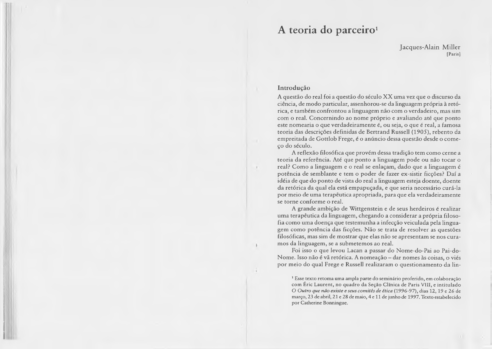 <p>A teoria do parceiro1</p><p>Jacques-Alain Miller</p><p>[Paris]</p><p>Introdução</p><p>A questão do real foi a questão do século X X uma vez que o discurso da</p><p>ciência, de modo particular, assenhorou-se da linguagem própria à retó</p><p>rica, e também confrontou a linguagem não com o verdadeiro, mas sim</p><p>com o real. Concernindo ao nome próprio e avaliando até que ponto</p><p>este nomearia o que verdadeiramente é, ou seja, o que é real, a famosa</p><p>teoria das descrições definidas de Bertrand Russell (1905), rebento da</p><p>empreitada de Gottlob Frege, é o anúncio dessa questão desde o come</p><p>ço do século.</p><p>A reflexão filosófica que provém dessa tradição tem como cerne a</p><p>teoria da referência. Até que ponto a linguagem pode ou não tocar o</p><p>real? Como a linguagem e o real se enlaçam, dado que a linguagem é</p><p>potência de semblante e tem o poder de fazer ex-sistir ficções? Daí a</p><p>idéia de que do ponto de vista do real a linguagem esteja doente, doente</p><p>da retórica da qual ela está empapuçada, e que seria necessário curá-la</p><p>por meio de uma terapêutica apropriada, para que ela verdadeiramente</p><p>se torne conforme o real.</p><p>A grande ambição de Wittgenstein e de seus herdeiros é realizar</p><p>uma terapêutica da linguagem, chegando a considerar a própria filoso</p><p>fia como uma doença que testemunha a infecção veiculada pela lingua</p><p>gem como potência das ficções. Não se trata de resolver as questões</p><p>filosóficas, mas sim de mostrar que elas não se apresentam se nos cura</p><p>mos da linguagem, se a submetemos ao real.</p><p>Foi isso o que levou Lacan a passar do Nome-do-Pai ao Pai-do-</p><p>Nome. Isso não é vã retórica. A nomeação - dar nomes às coisas, o viés</p><p>por meio do qual Frege e Russell realizaram o questionamento da lin-</p><p>1 Esse texto retoma uma ampla parte do seminário proferido, em colaboração</p><p>com Éric Laurent, no quadro da Seção Clínica de Paris VIII, e intitulado</p><p>O Outro que não existe e seus comitês de ética (1 9 9 6 -9 7 ), dias 1 2 ,1 9 e 2 6 de</p><p>março, 23 de abril, 21 e 28 de maio, 4 e 11 de junho de 1997. Texto estabelecido</p><p>por Catherine Bonningue.</p><p>Os circuitos do desejo na vida e na análise</p><p>guagem comum - não é a comunicação, não é a conversa fiada. A no</p><p>meação é a questão de saber como a conversa fiada pode se ligar a</p><p>alguma coisa de real.</p><p>Em nosso vocabulário, é a função do pai que permite dar nome às</p><p>coisas, ou seja, passar do simbólico ao real. Pode-se dispensar o Nome-</p><p>do-Pai - Lacan o disse certa vez e Eric Laurent o fez passar ao uso</p><p>corrente - sob a condição de servir-se dele. Poder dispensá-lo significa</p><p>dizer que o Nome-do-Pai, derivado do conceito de Edipo, não é da</p><p>ordem do real. De fato, o Nome-do-Pai é um semblante relativo que</p><p>tenta se fazer passar como sendo da ordem do real. Dito de outro modo,</p><p>o Nome-do-Pai não é da ordem do que não cessa de se escrever. Eis por</p><p>que Lacan elevou o sintoma, e não o Nome-do-Pai, como o que, na</p><p>dimensão própria à psicanálise, não cessa de se escrever, ou seja, como</p><p>o equivalente de um saber no real. Quando há o Nome-do-Pai, ele o é</p><p>como uma espécie de sintoma, nada mais.</p><p>O sintoma é uma lei? Se ele o é, ele é uma lei particular a um</p><p>sujeito, e podemos perguntar em que condições é concebível que haja</p><p>sintoma para um sujeito. Se ele é da ordem do real, trata-se de um real</p><p>bem particular, já que seria real para Um, e portanto não para o Outro.</p><p>Como se sabe, é próprio ao real que só se o aborde um a um, e dessa</p><p>constatação decorrem inúmeras conseqüências. Dito de outro modo,</p><p>isso põe em questão o que é o real para a espécie humana.</p><p>Considerar que há sintoma para cada um dos que falam significa</p><p>dizer que, no nível da espécie humana, há um saber que não se inscreve</p><p>no real. No nível da espécie que fala, não há inscrição no real de um</p><p>saber que diga respeito à sexualidade, ou seja, não há nesse nível o que</p><p>chamamos de “instinto”, que leva, de forma invariável e típica para</p><p>uma espécie, rumo ao parceiro.</p><p>O desejo não pode absolutamente servir-se disso uma vez que o</p><p>desejo é uma questão. Isso causa perplexidade. A pulsão tampouco pode</p><p>servir-se do instinto, já que ela nada assegura no nível do sexual em</p><p>relação a esse Outro. Dito de outro modo, naquilo que o estimula a</p><p>uma competição, a uma referência com a ciência, a existência do sintoma</p><p>exige a modificação do nosso conceito de saber no real. Se há sinto</p><p>ma, então não há saber no real sobre a sexualidade. Se há sintoma como</p><p>o que não cessa de se escrever para um sujeito, então há, de maneira</p><p>correlata, um saber que não cessa de não se escrever, um saber especial.</p><p>Não é o saber no real, dado que ele não cessa de se escrever. Se há</p><p>sintoma, é porque deve haver, para a espécie humana, um saber que não</p><p>cessa de não se escrever. Esta é a demonstração que Lacan tenta fazer</p><p>1 5 4</p><p>A teoria do parceiro</p><p>brotar da experiência psicanalítica. Se há sintoma, então não há relação</p><p>sexual, há não-relação sexual, há uma ausência de saber no real que</p><p>diga respeito à sexualidade.</p><p>E muito difícil demonstrar uma ausência de saber no real. O que,</p><p>na experiência analítica, nos situa diante desta ausência?</p><p>O que a experiência nos ensina em cada caso que se submete à</p><p>experiência analítica - Lacan nos fez perceber o seu valor e foi necessá</p><p>rio que o formulasse para que isso se tornasse evidente - é a função</p><p>determinante, em cada caso, de um encontro, um aleatório, um certo</p><p>acaso, u