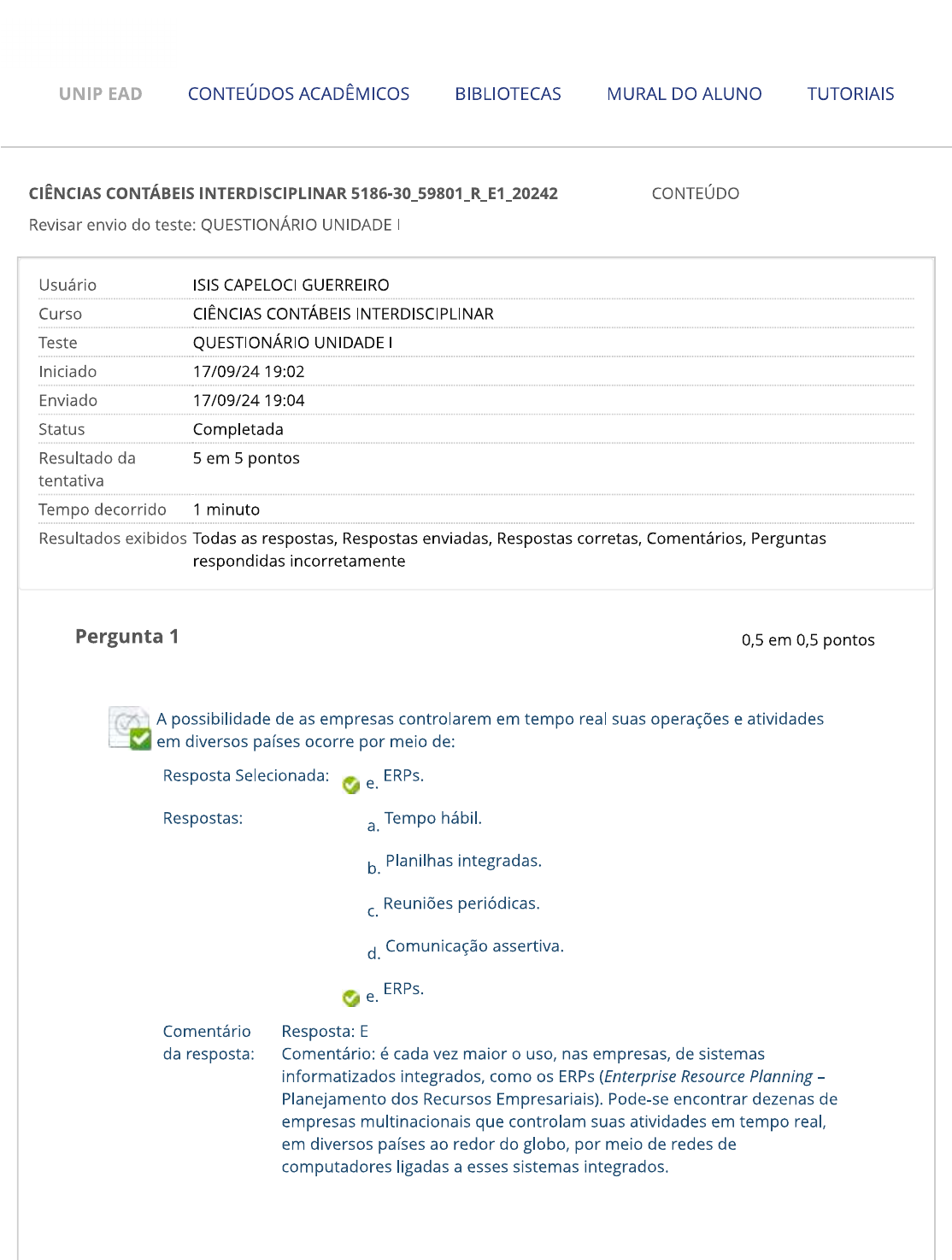 <p>UNIP EAD CONTEÚDOS ACADÊMICOS BIBLIOTECAS MURAL DO ALUNO TUTORIAIS CIÊNCIAS CONTÁBEIS INTERDISCIPLINAR 5186-30_59801_R_E1_20242 CONTEÚDO Revisar envio do teste: QUESTIONÁRIO UNIDADE Usuário ISIS CAPELOCI GUERREIRO Curso CIÊNCIAS CONTÁBEIS INTERDISCIPLINAR Teste QUESTIONÁRIO UNIDADE Iniciado 17/09/24 19:02 Enviado 17/09/24 19:04 Status Completada Resultado da 5 em 5 pontos tentativa Tempo decorrido 1 minuto Resultados exibidos Todas as respostas, Respostas enviadas, Respostas corretas, Comentários, Perguntas respondidas incorretamente Pergunta 1 0,5 em 0,5 pontos A possibilidade de as empresas controlarem em tempo real suas operações e atividades em diversos países ocorre por meio de: Resposta Selecionada: e. ERPs. Respostas: Tempo hábil. a. b. Planilhas integradas. Reuniões periódicas. C. d. Comunicação assertiva. ERPs. Comentário Resposta: E da resposta: Comentário: é cada vez maior o uso, nas empresas, de sistemas informatizados integrados, como os ERPs (Enterprise Resource Planning - Planejamento dos Recursos Empresariais). Pode-se encontrar dezenas de empresas multinacionais que controlam suas atividades em tempo real, em diversos países ao redor do globo, por meio de redes de computadores ligadas a esses sistemas integrados.</p><p>Pergunta 2 0,5 em 0,5 pontos Acerca da atuação dos Princípios Contábeis, para que um princípio seja incorporado à Doutrina Contábil, este deve atender duas condições básicas: Resposta Selecionada: Ser praticável e útil. C. Respostas: Ser simples e resumido. a. b. Ser aceito pela Comissão. Ser praticável e útil. C. Ser detalhado e dinâmico. d. Ser atualizado e publicado. e. Comentário da Resposta: C resposta: Comentário: segundo ludícibus et al. (1990), para um princípio ser incorporado à doutrina contábil, é necessário que atenda a duas condições básicas: 1. o objetivo deve ser considerado praticável pelo consenso profissional; 2. deve ser considerado útil. Pergunta 3 0,5 em 0,5 pontos Além de um conjunto de normas internacionais, o que é necessário para a aplicação correta das IFRS? Resposta b. Selecionada: O conhecimento dos seguintes conceitos: convergência, harmonização e padronização. Respostas: a. O parecer de uma auditoria externa. b. O conhecimento dos seguintes conceitos: convergência, harmonização e padronização. C. Um parecer do ISO ( International Standardization Organization) d. A autorização da CVM (Comissão de Valores Mobiliários). Uma instrução normativa determinada pela Receita Federal. e. Comentário da Resposta: B resposta: Comentário: três conceitos precisam ser estudados para uma melhor</p><p>compreensão do que significa convergência contábil: convergência, harmonização e padronização. Pergunta 4 0,5 em 0,5 pontos Dentre as características qualitativas exigidas para as demonstrações financeiras, tomando-se como base o CPC (2012) Pronunciamento Conceitual Básico (R1), assinalar a alternativa incorreta: Resposta Selecionada: e. Ajustadas. Respostas: a. Confiáveis. b. Comparáveis. C. Relevantes. d. Materiais. e. Ajustadas. Comentário Resposta: E da resposta: Comentário: características qualitativas das demonstrações contábeis de acordo com CPC (2012) Pronunciamento Conceitual Básico (R1), as demonstrações devem ser: compreensíveis, relevantes, materiais ou importantes para os usuários, confiáveis e comparáveis. Entende-se que os contadores devem se preocupar não somente com a acurácia quantitativa do seu trabalho, mas também em aumentar as informações de cunho qualitativo que melhorem a experiência dos usuários da contabilidade ao consultarem e analisarem as demonstrações financeiras. Pergunta 5 0,5 em 0,5 pontos Em relação às normas internacionais de contabilidade, pode-se entender que as mesmas afetam somente os profissionais de contabilidade. Você concorda? Resposta Selecionada: Não, o assunto envolve os demais profissionais de uma empresa. Respostas: Sim, conforme determina a legislação vigente. a. b. Sim, conforme determina as IFRS.</p><p>C. Não, o assunto envolve os demais profissionais de uma empresa. d. Sim, mas somente os profissionais de contabilidade habilitados. e. Sim, desde que a empresa negocie ações em Bolsas de Valores. Comentário Resposta: C da resposta: Comentário: em palestra no Congresso USP de Contabilidade, em 2010, o Prof. Ariovaldo dos Santos recomendou que o contador descentralizasse parte de sua responsabilidade em juntar informações qualitativas para outros profissionais da empresa. Essa tem sido uma orientação básica que vem sendo transmitida aos contadores. Por exemplo: antes, um contador, para realizar o cálculo da depreciação, teria de consultar a legislação brasileira e aplicar uma alíquota adequada, de acordo com o texto legal. Agora, essa consulta já não é mais suficiente. Faz-se necessário realizar um cálculo de depreciação de um imóvel, não basta aplicar uma taxa média definida previamente em lei ou em algum regulamento tributário. Para bem aplicar o conceito de Valor Justo Fair Value, o contador precisa envolver os outros profissionais na empresa; nesse exemplo, os engenheiros. Um engenheiro, com base em estudos apresentados na forma de laudo, irá fornecer a informação necessária para que o contador possa decidir qual o valor a ser depreciado. O engenheiro, por sua vez, talvez tenha de recorrer ao trabalho de corretores de imóveis que, com seu conhecimento, irão ajudar na montagem do laudo. Então, chegamos a uma conclusão: sendo assim, as normas internacionais de contabilidade não são um assunto apenas dos contadores. As normas internacionais de contabilidade são um assunto de todos os profissionais! Pergunta 6 0,5 em 0,5 pontos Entende-se por tempestividade: Resposta d. Selecionada: O período em que as demonstrações financeiras são utilizadas para tomada de decisão. Respostas: A data do encerramento das demonstrações financeiras. a. b. A