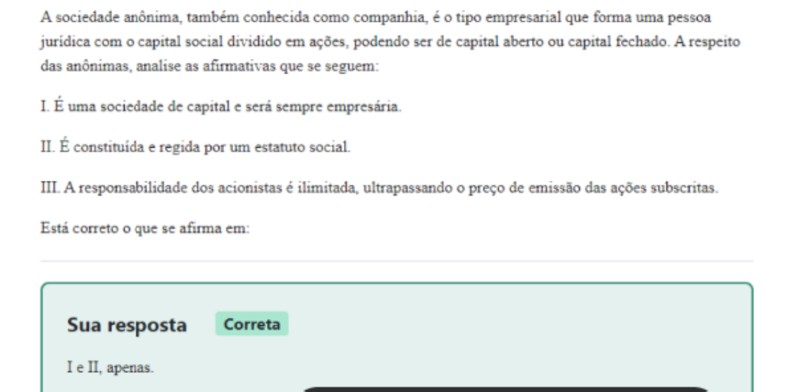 <p>A sociedade anônima, também conhecida como companhia, é o tipo empresarial que forma uma pessoa jurídica com o capital social dividido em ações, podendo ser de capital aberto ou capital fechado. A respeito das anônimas, analise as afirmativas que se seguem: I É uma sociedade de capital e será sempre empresária. II. É constituída e regida por um estatuto social. III. A responsabilidade dos acionistas é ilimitada, ultrapassando o preço de emissão das ações Está correto o que se afirma em: Sua resposta Correta II, apenas.</p>