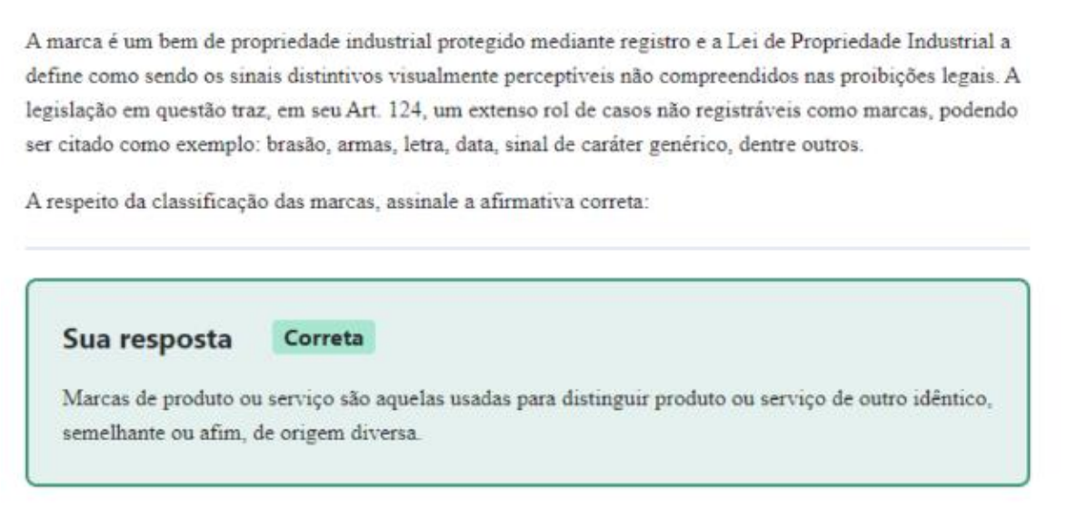 <p>A marca é um bem de propriedade industrial protegido mediante registro e a Lei de Propriedade Industrial a define como sendo os sinais distintivos visualmente perceptiveis não compreendidos nas proibições legais. A legislação em questão traz, em seu Art. 124, um extenso rol de casos não registráveis como marcas, podendo ser citado como exemplo: brasão, armas, letra, data, sinal de caráter genérico, dentre outros. A respeito da classificação das marcas, assinale a afirmativa correta: Sua resposta Correta Marcas de produto ou serviço são aquelas usadas para distinguir produto ou serviço de outro semelhante ou afim, de origem</p>