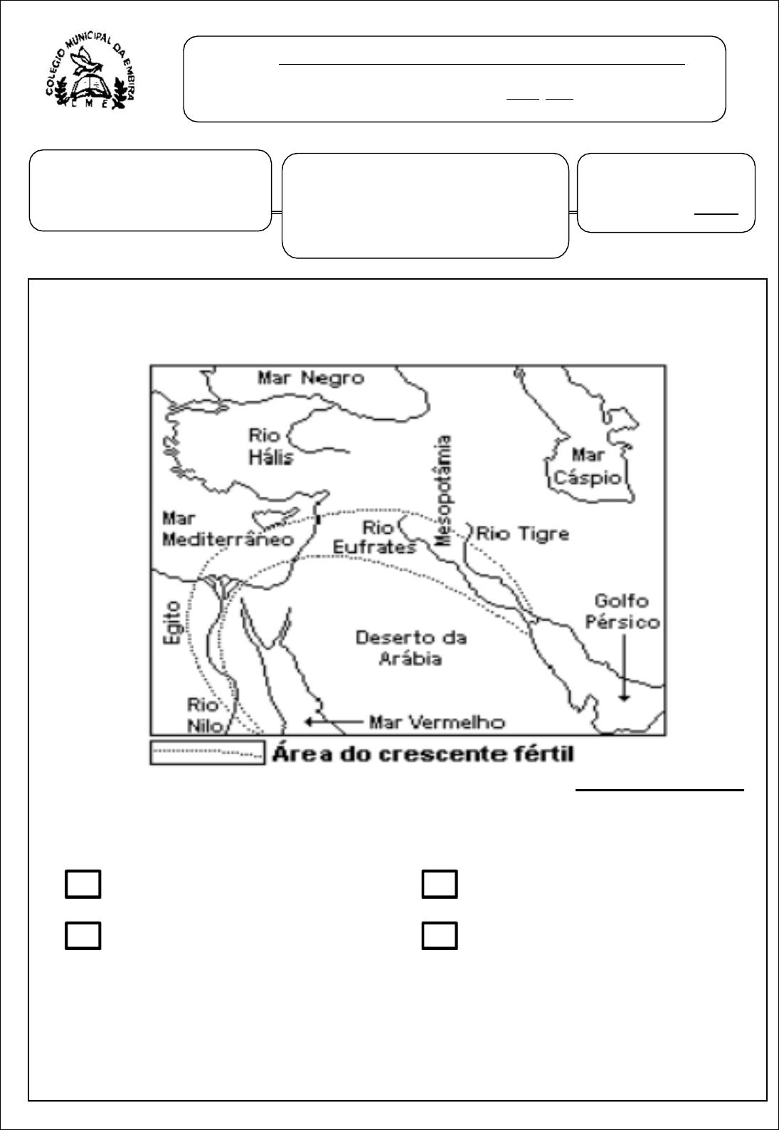 <p>Disciplina: História</p><p>Professor(a): Janete Neves</p><p>Avaliação Parcial de</p><p>História</p><p>ADAPTADA</p><p>III Trimestre</p><p>Nota Atribuída: 3,0</p><p>Nota Aferida</p><p>Estudante: _</p><p>Ano: 6º Turma: Única Data: / /2024</p><p>1. OBSERVE O MAPA:</p><p>A PALAVRA “MESOPOTÂMIA” VEM DO GREGO E SIGNIFICA TERRA ENTRE RIOS .</p><p>ENCONTRE NO MAPA A PALAVRA “MESOPOTÂMIA” E MARQUE COM UM “x”,</p><p>COM LÁPIS VERMELHO. EM SEGUIDA, OBSERVE QUE ESTA CIVILIZAÇÃO ESTÁ</p><p>ENTRE 2 RIOS. QUAIS SÃO ELES?</p><p>RIO GANGES E RIO HINDU RIO NÍGER E RIO PARAGUAÇU</p><p>RIO TIGRE E RIO EUFRATES RIO NILO E RIO JORDÃO</p><p>2. OS RIOS TIGRE E EUFRATES FORAM IMPORTANTES PARA OS POVOS QUE ALI</p><p>VIVERAM, POIS GARATIAM:</p><p>A PRÁTICA DA AGRICULTURA ACESSO AOS ESCRAVIZADOS</p><p>O ACESSO AO OURO MAIORES TERRITÓRIOS</p><p>3. NUMERE CORRETAMENTE DE ACORDO COM A PIRÂMISE SOCIAL DA MESOPOTÂMIA:</p><p>COMERCIANTES, ESCRIBAS E ARTESÃOS</p><p>REI</p><p>CAMPONESES E ESCRAVOS</p><p>SARCERDOTES, NOBRES E MILITARES</p><p>BONS ESTUDOS!</p><p>1</p><p>2</p><p>3</p><p>4</p><p>REI</p><p>SARCERDOTES, NOBRES</p><p>E MILITARES</p><p>COMERCIANTES</p><p>ESCRIBAS E</p><p>ARTESÃOS</p><p>CAMPONESES</p><p>E ESCRAVOS</p>