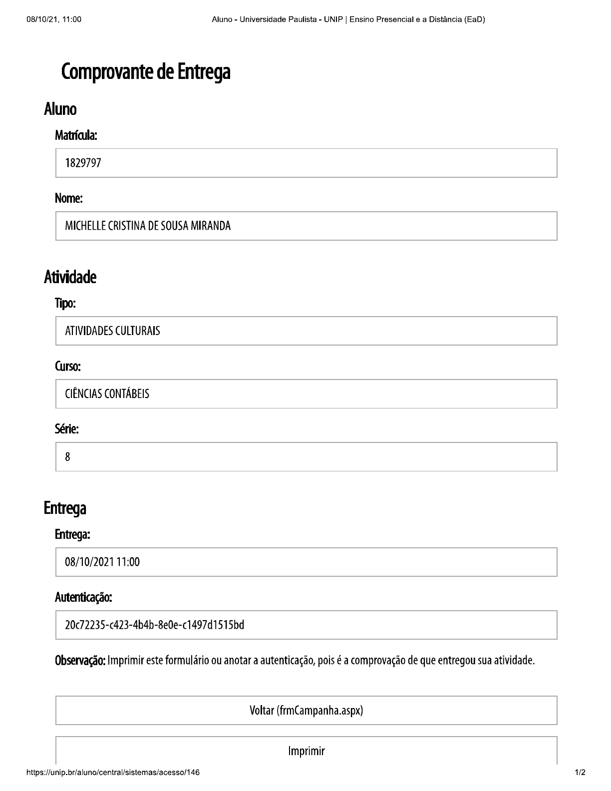 <p>08/10/21, 11:00 Aluno - Universidade Paulista - UNIP Ensino Presencial e a Distância (EaD) Comprovante de Entrega Aluno Matrícula: 1829797 Nome: MICHELLE CRISTINA DE SOUSA MIRANDA Atividade Tipo: ATIVIDADES CULTURAIS Curso: CIÊNCIAS CONTÁBEIS Série: 8 Entrega Entrega: 08/10/2021 11:00 Autenticação: 20c72235-c423-4b4b-8e0e-c1497d1515bd Observação: Imprimir este formulário ou anotar a autenticação, pois é a comprovação de que entregou sua atividade. Voltar (frmCampanha.aspx) Imprimir https://unip.br/aluno/central/sistemas/acesso/146 1/2</p><p>08/10/21, 11:00 Aluno - Universidade Paulista - UNIP Ensino Presencial e a Distância (EaD) https://unip.br/aluno/central/sistemas/acesso/146 2/2</p>