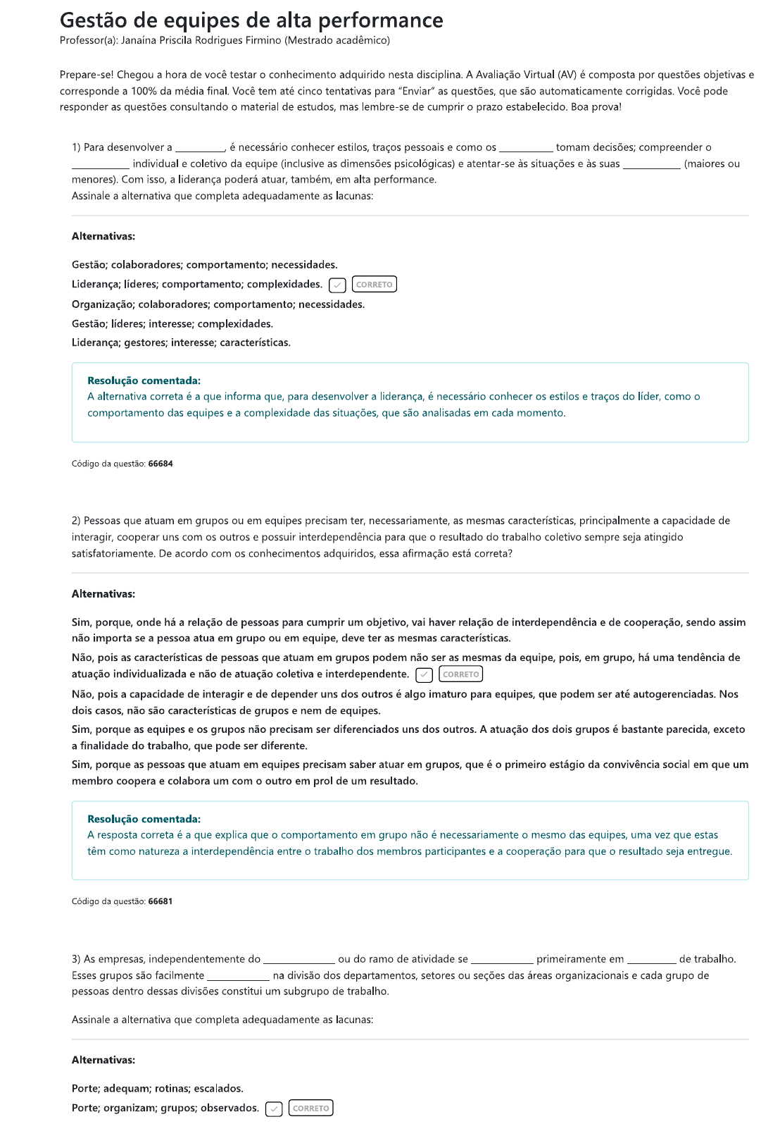 <p>Gestão de equipes de alta performance Professor(a): Janaína Priscila Rodrigues Firmino (Mestrado acadêmico) Prepare-se! Chegou a hora de você testar o conhecimento adquirido nesta disciplina. A Avaliação Virtual (AV) é composta por questões objetivas e corresponde a 100% da média final. Você tem até cinco tentativas para "Enviar" as questões, que são automaticamente corrigidas. Você pode responder as questões consultando o material de estudos, mas lembre-se de cumprir o prazo estabelecido. Boa prova! 1) Para desenvolver a é necessário conhecer estilos, traços pessoais e como os tomam decisões; compreender o individual e coletivo da equipe (inclusive as dimensões psicológicas) e atentar-se às situações e às suas (maiores ou menores). Com isso, a liderança poderá atuar, também, em alta performance. Assinale a alternativa que completa adequadamente as lacunas: Alternativas: Gestão; colaboradores; comportamento; necessidades. Liderança; líderes; comportamento; complexidades. CORRETO Organização; colaboradores; comportamento; necessidades. Gestão; líderes; interesse; complexidades. Liderança; gestores; interesse; características. Resolução comentada: A alternativa correta é a que informa que, para desenvolver a liderança, é necessário conhecer os estilos e traços do líder, como o comportamento das equipes e a complexidade das situações, que são analisadas em cada momento. Código da questão: 66684 2) Pessoas que atuam em grupos ou em equipes precisam ter, necessariamente, as mesmas características, principalmente a capacidade de interagir, cooperar uns com os outros e possuir interdependência para que o resultado do trabalho coletivo sempre seja atingido satisfatoriamente. De acordo com os conhecimentos adquiridos, essa afirmação está correta? Alternativas: Sim, porque, onde há a relação de pessoas para cumprir um objetivo, vai haver relação de interdependência e de cooperação, sendo assim não importa se a pessoa atua em grupo ou em equipe, deve ter as mesmas características. Não, pois as características de pessoas que atuam em grupos podem não ser as mesmas da equipe, pois, em grupo, há uma tendência de atuação individualizada e não de atuação coletiva e interdependente. CORRETO Não, pois a capacidade de interagir e de depender uns dos outros é algo imaturo para equipes, que podem ser até autogerenciadas. Nos dois casos, não são características de grupos e nem de equipes. Sim, porque as equipes e os grupos não precisam ser diferenciados uns dos outros. A atuação dos dois grupos é bastante parecida, exceto a finalidade do trabalho, que pode ser diferente. Sim, porque as pessoas que atuam em equipes precisam saber atuar em grupos, que é o primeiro estágio da convivência social em que um membro coopera e colabora um com o outro em prol de um resultado. Resolução comentada: A resposta correta é a que explica que o comportamento em grupo não é necessariamente o mesmo das equipes, uma vez que estas têm como natureza a interdependência entre o trabalho dos membros participantes e a cooperação para que o resultado seja entregue. Código da questão: 66681 3) As empresas, independentemente do ou do ramo de atividade se primeiramente em de trabalho. Esses grupos são facilmente na divisão dos departamentos, setores ou seções das áreas organizacionais e cada grupo de pessoas dentro dessas divisões constitui um subgrupo de trabalho. Assinale a alternativa que completa adequadamente as lacunas: Alternativas: Porte; adequam; rotinas; escalados. Porte; organizam; grupos; observados. CORRETO</p><p>Mercado; estabelecem; divisão; determinados. Modelo de gestão; adequam; equipes; criados. Modelo de gestão; organizam; equipes; Resolução comentada: A alternativa correta é aquela que demonstra que, em uma empresa, primeiramente, são criados os grupos formais, os quais podem ser constituídos por outros grupos, dependendo da divisão do trabalho e da característica do seu gerenciamento. Código da questão: 66682 4) Há o entendimento de que equipes são consideradas um tipo diferente de pois as pessoas que as compõem possuem diferenciadas, tais como estabilidade temporal e de autoridade. Assinale a alternativa que completa adequadamente as lacunas: Alternativas: Conjunto; competências; inteligência emocional; uso. Grupo; características; habilidades especiais; diferenciação. CORRETO Grupo; formações; nível superior; influência. Grupo; competências; nível superior; diferenciação. Departamento; funções; cargos; uso. Resolução comentada: A alternativa correta é a que informa que as equipes são um tipo diferente de grupo, pois possuem características diferenciadas na maneira de agir devido a habilidades especiais, estabilidade temporal e diferenciação no uso dos poderes de decisão, por exemplo. Código da questão: 66677 5) Sobre as características dos grupos formais e informais, analise as afirmativas a seguir e assinale-as com V (verdadeiro) ou F (falso): grupo formal é facilmente identificado na organização pela divisão de áreas e tarefas. Os grupos informais são oriundos do interesse e também da afinidade entre seus participantes. Os grupos formais podem ter duração temporária ou indeterminada dependendo da finalidade de cada um. É possível que qualquer colaborador de uma empresa participe de um grupo informal. Basta querer e pedir para participar. Não há barreiras de entrada. Em grupos formais é possível reconhecer como características os benefícios e as conveniências que todos esperam receber quando defendem uma ideia. Assinale a alternativa que contenha a sequência correta de Alternativas: CORRETO Resolução comentada: A primeira, a segunda e a terceira são verdadeiras. Veja a forma correta das afirmativas falsas: Quarta Nem sempre os grupos informais aceitam a participação de pessoas apenas por querer participar. Muitas vezes os novos integrantes prec