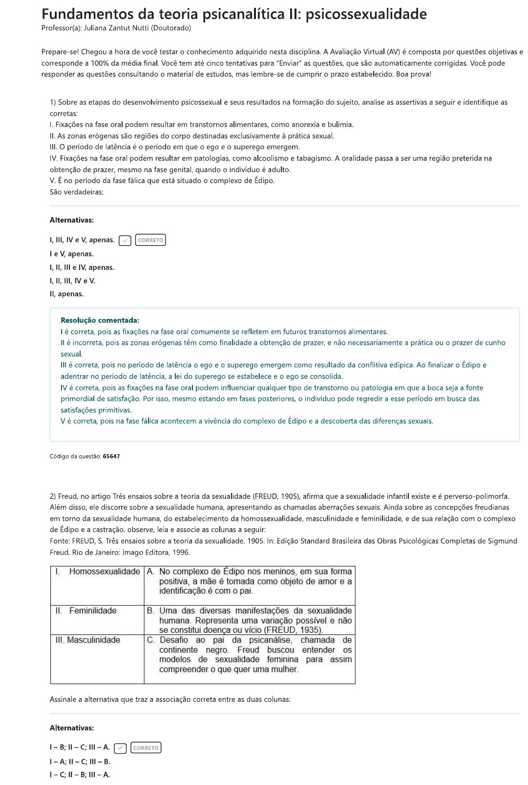 <p>Fundamentos da teoria psicanalítica II: psicossexualidade Professor(a): Juliana Zantut Nutti (Doutorado) Prepare-se! Chegou a hora de você testar o conhecimento adquirido nesta disciplina. A Avaliação Virtual (AV) é composta por questões objetivas e corresponde a 100% da média final. Você tem até cinco tentativas para "Enviar" as questões, que são automaticamente corrigidas. Você pode responder as questões consultando o material de estudos, mas lembre-se de cumprir o prazo estabelecido. Boa prova! 1) Sobre as etapas do desenvolvimento psicossexual e seus resultados na formação do sujeito, analise as assertivas a seguir e identifique as corretas: I. Fixações na fase oral podem resultar em transtornos alimentares, como anorexia e bulimia. II. As zonas erógenas são regiões do corpo destinadas exclusivamente à prática sexual. III. O período de latência é o período em que o ego e o superego emergem IV. Fixações na fase oral podem resultar em patologias, como alcoolismo e tabagismo. A oralidade passa a ser uma região preterida na obtenção de prazer, mesmo na fase genital, quando o indivíduo é adulto. V. É no período da fase fálica que está situado o complexo de Édipo. São verdadeiras: Alternativas: I, III, IV e V, apenas. CORRETO e V, apenas. I, II, III e IV, apenas. I, II, III, IV e V. II, apenas. Resolução comentada: é correta, pois as fixações na fase oral comumente se refletem em futuros transtornos alimentares. é pois as zonas erógenas têm como finalidade a obtenção de prazer, e não necessariamente a prática ou o prazer de cunho sexual. III é correta, pois no período de latência o ego e superego emergem como resultado da conflitiva edípica. Ao finalizar o Édipo e adentrar no período de latência, a lei do superego se estabelece e o ego se consolida. IV é correta, pois as fixações na fase oral podem influenciar qualquer tipo de transtorno ou patologia em que a boca seja a fonte primordial de satisfação. Por isso, mesmo estando em fases posteriores, indivíduo pode regredir a esse período em busca das satisfações primitivas. V é correta, pois na fase fálica acontecem a vivência do complexo de e a descoberta das diferenças sexuais. Código da questão: 65647 2) Freud, no artigo Três ensaios sobre a teoria da sexualidade (FREUD, 1905), afirma que a sexualidade infantil existe e é perverso-polimorfa. Além disso, ele discorre sobre a sexualidade humana, apresentando as chamadas aberrações sexuais. Ainda sobre as concepções freudianas em torno da sexualidade humana, do estabelecimento da homossexualidade, masculinidade e feminilidade, e de sua relação com o complexo de Édipo e a castração, observe, leia e associe as colunas a seguir: Fonte: FREUD S. Três ensaios sobre a teoria da sexualidade. 1905. In: Edição Standard Brasileira das Obras Psicológicas Completas de Sigmund Freud. Rio de Janeiro: Imago Editora, 1996. I. Homossexualidade A. No complexo de nos meninos, em sua forma positiva, a mãe é tomada como objeto de amor e a identificação é com o pai. II. Feminilidade B. Uma das diversas manifestações da sexualidade humana. Representa uma variação possível e não se constitui doença ou vício (FREUD, 1935). III. Masculinidade C. Desafio ao pai da psicanálise, chamada de continente negro. Freud buscou entender os modelos de sexualidade feminina para assim compreender o que quer uma mulher. Assinale a alternativa que traz a associação correta entre as duas colunas: Alternativas: B; C; III A. CORRETO</p><p>A; B: III C. Resolução comentada: I. Homossexualid Uma das diversas manifestações da ade sexualidade humana. Representa uma variação possível e não se constitui doença ou vício (FREUD, 1935). II. Feminilidade Desafio ao pai da psicanálise, chamada de continente negro. Freud buscou entender os modelos de sexualidade feminina para assim compreender o que quer uma mulher III. Masculinidade No complexo de nos em sua forma positiva, a mãe é tomada como objeto de amor e a identificação é com o pai. Código da questão: 65667 3) Sobre o conceito homossexualidade e sua explicação na obra freudiana, assinale a alternativa correta: Alternativas: É determinada no período da puberdade, sendo apenas uma fase do desenvolvimento do sujeito. Não se estabelece na fase genital. A homossexualidade, segundo a psicanálise, tem uma das suas possibilidades de origem na resolução negativa do complexo de CORRETO Ocorre na adolescência e prevalecerá na idade adulta se a castração do menino e da menina não for suficiente. É fruto especialmente de traumas e abusos sexuais, pois o normal para a psicanálise é a Na homossexualidade temos a manifestação sexual em que o complexo de Édipo foi vivenciado de forma positiva. Resolução comentada: A homossexualidade, segundo a psicanálise, não se trata de uma fase ou da forma positiva do A psicanálise não trabalha com a premissa de normal e patológico, não podendo a homossexualidade ser atribuída a situações traumáticas e abusos, uma vez que se trata de uma dentre muitas formas de manifestação da libido humana. A homossexualidade é uma forma de resolução do complexo de e está associada a diversos fatores: aspectos genéticos, biológicos, sociais e culturais, além dos psicológicos. Código da questão: 65664 4) As fases do desenvolvimento psicossexual estão relacionadas à exploração das zonas erógenas, relacionando cada região a processos de maturação e possíveis fixações. Leia e associe as duas colunas a seguir, de acordo com as fases do desenvolvimento psicossexual. I. Fase oral A. Primeiro período de estabelecimento da zona erógena. Fixações nessa fase resultam em transtornos alimentares ou consumo excessivo de álcool e fumo. II. Fase anal B. Período em que a criança começa a identificar as diferenças sexuais, delimitando quem tem e quem não tem o falo III. Fase fálica C. Fase em que a criança percebe qu