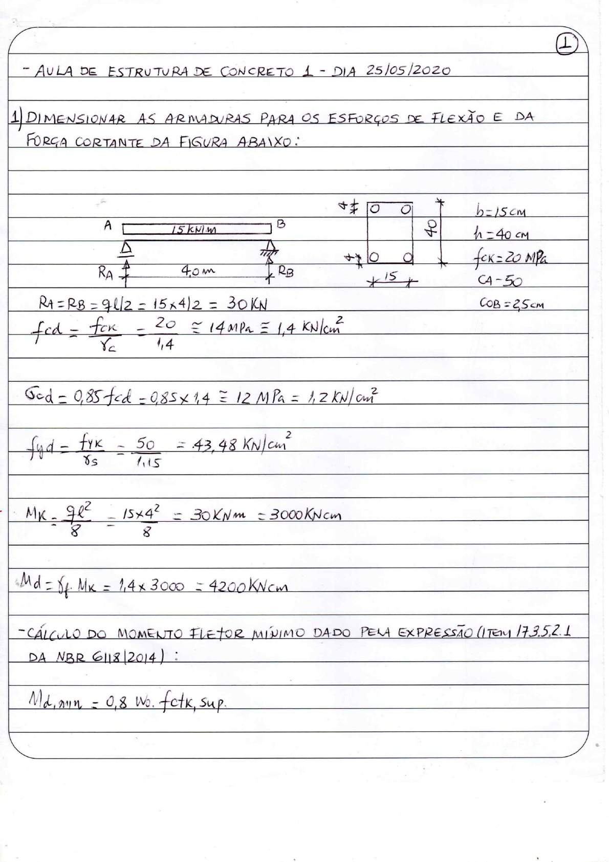 <p>1 - AULA DE ESTRUTURA DE CONCRETO 1 - DIA 25/05/2020 1) DIMENSIONAR AS ARMADURAS PARA 05 ESFORGOS DE E DA FORGA CORTANTE DA FIGURA ABAIXO: b=15cm A 15 KNIM B of h=40 CM 20 MPa RA RB CA - 50 RA=RB = = 15x4/2 = 30KN COB=2,5cm fcd = - for - 20 14 MPa 1,4 rc 1,4 God = = 12 MPa = fyd - fyk - 50 = 43,48 rs 15x42 = 30KNm = 3000KNcm 8 Md= Mk = 1,4x3000 = 4200 KNcm - CALCULO DO MOMENTO FLETOR MINIMO DADO PELA DA NBR : Md,min = 0,8 Wo. fctk,</p><p>2 Wo = DE NO CASO DA SEGÃO RETANGULAR IGUAL A Wo = x 106=4.000 cm fctk,sup = 1,3 fct,m (VER 8.2.5) , PARA CLASSE ATE C50 = Sup = =0,39 = 2,87 MPa = 0,287 Md,min = 0,287 = Md= 4200 KNcm > Md,min = 918,40KNcm ATENDEU A NBR 6/18/2014 M = - Md - = 4200 =0,18 - SUBARMADA (ARMADURA SIMPLES) = 1,25x(1- =0,25 = 0,8 1,2 = 2,98 cm fyd 43,48 CALCULO DA ARMADURA DE (ITEM 17.3.5.2.1) - 0,15%.bh = 0,15% 15cmx 40cm = $ 16. MM A NUMERO DE BARRAS - 2,98 = 1,48 2 BARRAS DE 16.</p><p>3 ARMADURA DE As ADOTAR 2 BARRAS DE 16mm - CÁLCULO DA ARMADURA DE COMPRESSÃO NESTE EXEMPLO, POR SE TRATAR DE ARMADURA SIMPLES As' = ADOTAR 2 PORTANTO = 2x ITEM 17.3.5.2.4 : ARMADURAS DE TRAGÃO E DE A SOMA DAS ARMADURAS DE TRAGAO E DE COMPRESSÃO As') NÃO PODE TER VALOR MAIOR QUE 4% Ac. 4% Ac = = 40cm = 2 = 2,98 + 2 3,38 2</p><p>4 ESTRIBO As' C=COBRIMENTO ah 5mm (FORGA CORTANTE) As * b * ESPAGAMENT to REAL = - = - (2x1,6) = 5,8cm = PASSOU PORQUE ESP. REAL =58mm > ESP. = 30MM, PORTANTO, A NBR 6/18/2014 b) NA VERTICAL (av) : -20 MM - DA BARRA, DO FEIXE DA LWA= 16mm - 0,5 VEZ 4 DIMENSAO MAXIMA CARACTERISTICA DO AGREGADO GRAUDO = 0,5x 25mm = 12,5 MM ESP. = 20MM ESP. REAL = h- - - (2.OEST.) - + (2x0,5) = 31,9 cm = PORQUE ESP. 319 MM > ESP.MiN = 20mm, ATENDEU A NBR 6/18/2014. - PARA COMBATER (ESTADO-LIMITE ULTIMO) ITEM 17.4.1.1.1 : TODOS ELEMENTOS LINEARES SUBMETIDOS A FORGA CORTANTE, Com DOS CASOS INDICADOS EM DEVEM CONTER ARMADURA TRANSVERSAL CONSTITUIDA POR COM</p><p>5 = Asw > 0,2 fct,m fywk Asw - AREA DA SEGAO TRANSVERSAL DOS S - DOS DOS LARGURA MEDIA DA ALMA, MEDIDA AO LONGO DA ALTURA UTIL DA RESPEITADA A INDICADA EM fct,m : VER ITEM 8.2.5 RESISTENCIA CARACTERISTICA ESCOAMEN to DO AGO DA ARMADURA 17.4.2.1 DA : A RESISTENCIA DO ELEMENTO EMUMA DETERMINADA DEVE SER CONSIDERADA SATISFATORIA, QUANDO VERIFICADAS SIMULTANEAMENTE AS SEGUINTES CONDIGOES: Vsd</p><p>6 PARA ESTRIBO, Asw = 2 As(5.0) = 0,40 bw = 15cm S= ? (ESPAGAMENTO) (ESTRIBO NA VERTICAL) fct,m = 0,3 2/3 = 0,3x = 2,21 MPa = 0,221 fywk= 50 (AGO CA-50) 0,40 cm2 - 0,40 cm = - 0,00088 s=30,30cm 50 CÁLCULO DO VRdz VRdz = 0,27 = (1-20/250) = 0,92 fcd = 1,4 bw = cm d = VRd2 = 0,27x0,92x cm2 36cm = 187,79 KN Vsd = 1,4x 30KN = 42KN Vsd VRdz 42 KN (PASSOU).</p><p>7 ARMADURA TRANSVERSAL PARA FORGA CORTANTE a) ITEM 18.3.3.2 : ELEMENTOS ESTRUTURNS ARMADOS COM ESTRIBOS: ESTRIBOS PARA FORGAS CORTANTES DEVEM SER FECHADOS ATRAVE'S DE UM RAMO HORI ENVOLVENDO AS BARRAS DA ARMADURA LONGITUDINAL DE E ANCORADAS NA FACE OPOSTA. 0 DIAMETRO DA BARRA QUE CONSTITUI ESTRIBO DEVE SER MAIOR ou IGVAL A 5 MM SEM EXCEDER 1/10 DA LARGURA DA ALMA VIGA. ESPAGAMENTO ENTRE ESTRIBOS MEDIDO SEGUNDO 0 EIXO LONGI- TUDINAL DO ELEMENTO DEVE SER SUFICIENTE PARA PERMITIR A PASSAGEM DO VIBRADOR, GARANTINDO BOM ADENSAMENTO DA MASSA. MAXIMO ENTRE ESTRIBOS DEVE ATENDER AS SEGUINTES - Vd 0,67 VRd2 ENTAO 300mm - SE Vd > 0,67 NO NOSSO EXEMPLO Vd ENTAO Smix = 0,6d</p><p>8 2) DIMENSIONAR AS ARMADURAS PARA ESFORGOS DE FLEXAO E DA FORGA CORTANTE DA FIGURA A SEGUIR: b=15cm h=40cm A 35 B CA-50 RA RB COB=2,5cm RA=RB = = 35x4/2 = 70KN fed 1,4 Ted 1,2 fyd = 43,4 = 35x42 = 70 = 7000 KNam 8 8 Md = = 1,4 7000 = 9800 Md,min = 0,8 Wo sup= 918,40 Md = 9800 > Md,min = 918,40 KNam (OK) A NBR 6/18/2014 M = Md - - 9800 - - 0,42 1.2 M=0,42 > = 0,372 ARMADURA DUPLA</p><p>9 = d 36 Elim = 0,617 PARA CA-50 As = (0,85 Elim + )xbdGcd - + 0,42-0,372 ) = 1-8 Fyd 1-0,11 43,48 As,min = 0,90 cm2 As > As,min (OK) - - - (1-0,11)+43,48 ARMADURA DE TRAGAO (As) ADOTAR A = NUMERO DE BARRAS - = 1,66 2 BARRAS DE - ARMADURA DE COMPRESSÃO (As') ADOTAR A= cm2 DE BARRAS = = 0,50cm2 = 24cm2 As + As = + = (OK), A NBR 6/18/2014.</p><p>10 TRANSVERSAL a) NA DIREC HORIZONTAL -20 MM - DIAMETRO DA BARRA = 25mm - 1,2 PAG = = 30 MM ESPAGAMENTO DE 30MM ESPAGAMEN to REAL = b - (2 (2 = 4cm = PASSOU PORQUE 0 ESP. REAL = > ESP. = A b) NA VERTICAL (av) : -20 MM - DA BARRA = - 0,5 - 0,5x = 12,5 MM ESPAGAMENTO MÍNIMO = 25 MM ESP. REAL = h-(2cob) - (2 - (1 PAS + 1 = 40 -(2x2,5) - -(2x0,5) (2,5 + 0,8) = = 307 MM PASSOU PORQUE ESP. REAL > ESP. PORTANTO, A NBR-6118/2014 CASO EXISTA A NECESSIDADE DA NESTE ADOTAMOS 2 BARRIS DE PARA A ARMADURA DE TRAGAO. SUPONHAMOS QUE TiVESSEMOS ADOTADO A BITOLA DE A = NUMERO DE BARRAS = = 3 BARRAS DE 20 MM</p><p>11 TRANSVERSAL NÃO PASSA a) NA HORIZONTAL (an) : - 20MM - DIAMETRO DA BARRA = 20 MM - - = 30mm ESPAGAMENTO DE 30mm ESPAGAMENTO REAL - - = 1,5cm = NÃO PASSOU PORQUE ESP. REAL ESP. PASSOU POR ESTE MOTIVO HA NE CESSIDADE DA 2 QUE A UMA DIS MÍNIMA DA NESTE CASO av no - - ESPAGAMENTO = (av) ARMADURA PARA COMBATER A FORGA CORTANTE psw Asw > 0,2 fetim bw.s. fywk ADMITINDO PARA Asw = fctim = 0,3 = 2,21 MPa 0,221 fywk = 50 (AGO C4-50)</p><p>12 0,40 - 0,40cm =0,00088 - 15cm 50 VRdz VRdz = fed = 36cm VRdz = = KN 0,67 VRdz = 0,67x 187, 79 KN = 125,82 KN Vsd = = 98KN Vsd VRdz 98KN 187,79 KN (PASSOU) Vd 0,67 11 0,6d MM</p><p>13 - OUTRA SERIA ADOTAR A BITOLA DE = 0,31 am Asw = 2x = 0,62 0,62 . - 0,62 = 0,00088 : S= 46,97cm x 50 155 VRd2 = 187,79 KN 0,67 VRd2 = 125,82 KN Vsd = 98KN Vsd VRdz 98 KN 187,79 KN (PASSOU) Como Vd 0,67 VRdz, =0,6d 300 MM 0,6 d - = 21,60cm 21,60cm 30 DE CALCULO SERIA ESPAGAMENTO PERMITIDO PELA NBR 6/18/2014 EDE ADOTAR $ 6.3 MM A CADA 21</p><p>14 ITEM 4 - ANCORAGEM DAS ARMADURAS (NBR 9.4.1 - TODAS AS BARRAS DAS ARMADURAS DEVEM SER ANCORADAS DE FORMA QUE ESFORGOS A QUE ESTEJAM SUBMETIDAS SEJAM INTEGRAL- MENTE TRANSMITIDOS SEJA POR DE ADERENCIA ou DE DISPOSITIVOS POR COMBINA DE ITEM ANCORAGEM POR ADERENCIA ACONTECE QUANDO 05 ESFORGOS ANCORADOS POR DE COMPRIMENTO RETO ou GRANDE DE CURVATURA, SEGUI