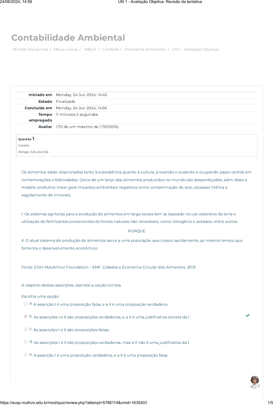 <p>Minhas Disciplinas / Meus cursos / 418421 / Unidade 1 - Panorama Ambiental / UN 1 - Avaliação Objetiva</p><p>Contabilidade Ambiental</p><p>Iniciado em Monday, 24 Jun 2024, 14:45</p><p>Estado Finalizada</p><p>Concluída em Monday, 24 Jun 2024, 14:56</p><p>Tempo</p><p>empregado</p><p>11 minutos 2 segundos</p><p>Avaliar 1,70 de um máximo de 1,70(100%)</p><p>Questão 1</p><p>Correto</p><p>Atingiu 0,34 de 0,34</p><p>Os alimentos estão relacionados tanto à subsistência quanto à cultura, provendo o sustento e ocupando papel central em</p><p>comemorações e festividades. Cerca de um terço dos alimentos produzidos no mundo são desperdiçados, além disso o</p><p>modelo produtivo linear gera impactos ambientais negativos como contaminação do solo, escassez hídrica e</p><p>esgotamento de minerais.</p><p>I. Os sistemas agrícolas para a produção de alimentos em larga escala tem se baseado no uso extensivo da terra e</p><p>utilização de fertilizantes provenientes de fontes naturais não renováveis, como nitrogênio e potássio, entre outros.</p><p>PORQUE</p><p>II. O atual sistema de produção de alimentos serve a uma população que cresce rapidamente, ao mesmo tempo que</p><p>fomenta o desenvolvimento econômico.</p><p>Fonte: Ellen MacArthur Foundation – EMF. Cidades e Economia Circular dos Alimentos. 2019.</p><p>A respeito dessas asserções, assinale a opção correta.</p><p>Escolha uma opção:</p><p>a. A asserção I é uma proposição falsa, e a II é uma proposição verdadeira.</p><p>b. As asserções I e II são proposições verdadeiras, e a II é uma justi�cativa correta da I. </p><p>c. As asserções I e II são proposições falsas.</p><p>d. As asserções I e II são proposições verdadeiras, mas a II não é uma justi�cativa da I.</p><p>e. A asserção I é uma proposição verdadeira, e a II é uma proposição falsa.</p><p>24/06/2024, 14:56 UN 1 - Avaliação Objetiva: Revisão da tentativa</p><p>https://avap.multivix.edu.br/mod/quiz/review.php?attempt=5788114&cmid=1635403 1/5</p><p>https://avap.multivix.edu.br/my/</p><p>https://avap.multivix.edu.br/course/view.php?id=26284</p><p>https://avap.multivix.edu.br/course/view.php?id=26284§ion=2</p><p>https://avap.multivix.edu.br/mod/quiz/view.php?id=1635403</p><p>Questão 2</p><p>Correto</p><p>Atingiu 0,34 de 0,34</p><p>Se os estudos de tendência se con�rmarem para o ano de 2050, a população chegará perto de 10 bilhões de pessoas e</p><p>serão geradas anualmente mais de 2 bilhões de toneladas de resíduos. Para manter o atual padrão de produção e</p><p>consumo será necessário um suprimento de recursos naturais equivalentes a quase três planetas Terra. WWB (2017)</p><p>Com base no texto acima é correto a�rmar que:</p><p>Escolha uma opção:</p><p>a. o desenvolvimento econômico mundial tem se baseado em padrões de crescimento que exploram os recursos</p><p>naturais de maneira linear.</p><p></p><p>b. diferente dos recursos naturais renováveis, os recursos naturais não renováveis estão em risco de esgotamento</p><p>devido ao atual padrão de produção e consumo.</p><p>c. as evoluções tecnocientí�cas do sistema industrial possibilitam que o atual padrão de produção e consumo seja</p><p>mantido por tempo inde�nido.</p><p>d. o crescimento econômico extensivo deve ser adotado em nível mundial, pois utiliza a mesma quantidade de</p><p>recursos como maior e�ciência.</p><p>e. o desenvolvimento econômico baseado no crescimento intensivo é ecoe�ciente e elimina os riscos de</p><p>esgotamento de recursos natruais.</p><p>24/06/2024, 14:56 UN 1 - Avaliação Objetiva: Revisão da tentativa</p><p>https://avap.multivix.edu.br/mod/quiz/review.php?attempt=5788114&cmid=1635403 2/5</p><p>Questão 3</p><p>Correto</p><p>Atingiu 0,34 de 0,34</p><p>A Tilápia é um peixe de água doce, de origem africana, que se reproduz facilmente e apresenta rápido crescimento. Muito</p><p>utilizada para a alimentação humana, é produzida em grande escala em sistemas de con�namento ou semi-</p><p>con�namento em tanques, lagos, represas e rios. Atualmente encontra-se a tilápia em águas abertas de todas as</p><p>Américas, onde é considerada uma espécie exótica e uma ameaça para qualquer outra espécie de peixe, pois alimenta-se</p><p>de ovas, alevinos e pequenos peixes. Mesmo sendo proibida na maior parte da Amazônia, criações foram introduzidas</p><p>ilegamente e é cada vez mais frequente encontrar tilápias nos rios das �orestas amazônicas brasileira e peruana. Por</p><p>outro lado, observa-se nessas regiões a dimuição das populações e até mesmo o desaparecimento de algumas espécies</p><p>de peixes nativos.</p><p>MAISONNAVE, Fabiano. Tilápia avança na Amazônia e gera preocupação sobre impacto ambiental. Folha de S.Paulo, ano</p><p>99, n. 32.928, Ambiente, p.21.</p><p>A partir da leitura do texto acima, é correto a�rmar que</p><p>Escolha uma opção:</p><p>a. a diminuição e o desaparecimento de espécies nativas de peixes podem ser considerados como um aspecto</p><p>ambiental bené�co.</p><p>b. o desequilíbrio ambiental causado pela introdução de espécies exóticas é considerado como um impacto</p><p>ambiental bené�co.</p><p>c. as populações de peixes são consideradas como recursos naturais renováveis e, portanto, podem ser submetidas à</p><p>impactos ambientais adversos.</p><p>d. a criação de espécie exótica é uma atividade que tem como aspecto ambiental a utilização dos rios, e como</p><p>impacto adverso a diminuição das espécies nativas.</p><p></p><p>e. a diminuição de espécies de peixes nativas na presença de espécies exóticas é um acontecimento natural no meio</p><p>ambiente.</p><p>24/06/2024, 14:56 UN 1 - Avaliação Objetiva: Revisão da tentativa</p><p>https://avap.multivix.edu.br/mod/quiz/review.php?attempt=5788114&cmid=1635403 3/5</p><p>Questão 4</p><p>Correto</p><p>Atingiu 0,34 de 0,34</p><p>Qual o aspecto comum entre lâmpada