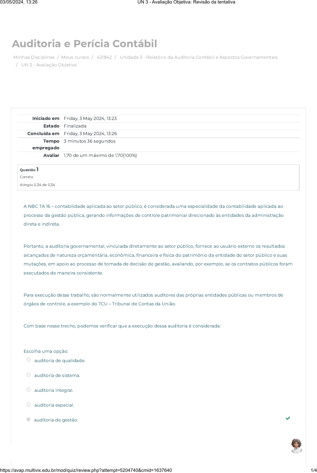 <p>Minhas Disciplinas / Meus cursos / 421842 / Unidade 3 - Relatório da Auditoria Contábil e Aspectos Governamentais</p><p>/ UN 3 - Avaliação Objetiva</p><p>Auditoria e Perícia Contábil</p><p>Iniciado em Friday, 3 May 2024, 13:23</p><p>Estado Finalizada</p><p>Concluída em Friday, 3 May 2024, 13:26</p><p>Tempo</p><p>empregado</p><p>3 minutos 36 segundos</p><p>Avaliar 1,70 de um máximo de 1,70(100%)</p><p>Questão 1</p><p>Correto</p><p>Atingiu 0,34 de 0,34</p><p>A NBC TA 16 – contabilidade aplicada ao setor público, é considerada uma especialidade da contabilidade aplicada ao</p><p>processo da gestão pública, gerando informações de controle patrimonial direcionado às entidades da administração</p><p>direta e indireta.</p><p>Portanto, a auditoria governamental, vinculada diretamente ao setor público, fornece ao usuário externo os resultados</p><p>alcançados de natureza orçamentária, econômica, �nanceira e física do patrimônio da entidade do setor público e suas</p><p>mutações, em apoio ao processo de tomada de decisão de gestão, avaliando, por exemplo, se os contratos públicos foram</p><p>executados de maneira consistente.</p><p>Para execução desse trabalho, são normalmente utilizados auditores das próprias entidades públicas ou membros de</p><p>órgãos de controle, a exemplo do TCU – Tribunal de Contas da União.</p><p>Com base nesse trecho, podemos veri�car que a execução dessa auditoria é considerada:</p><p>Escolha uma opção:</p><p>auditoria de qualidade.</p><p>auditoria de sistema.</p><p>auditoria integral.</p><p>auditoria especial.</p><p>auditoria de gestão. </p><p>03/05/2024, 13:26 UN 3 - Avaliação Objetiva: Revisão da tentativa</p><p>https://avap.multivix.edu.br/mod/quiz/review.php?attempt=5204740&cmid=1637640 1/4</p><p>https://avap.multivix.edu.br/my/</p><p>https://avap.multivix.edu.br/course/view.php?id=26353</p><p>https://avap.multivix.edu.br/course/view.php?id=26353§ion=4</p><p>https://avap.multivix.edu.br/mod/quiz/view.php?id=1637640</p><p>Questão 2</p><p>Correto</p><p>Atingiu 0,34 de 0,34</p><p>Questão 3</p><p>Correto</p><p>Atingiu 0,34 de 0,34</p><p>A auditoria governamental é um segmento bem especí�co da auditoria e visa estabelecer que existam procedimentos</p><p>de controle interno sob a gestão das entidades da administração pública direta e indireta, orientando esses entes sobre a</p><p>qualidade dos gastos públicos, demonstrando maior e�ciência dos controles orçamentários e na transparência.</p><p>Neste sentido, quais as principais vertentes estabelecidas pela auditoria governamental que visam garantir segurança</p><p>direta para o patrimônio ou o interesse público?</p><p>Escolha uma opção:</p><p>Auditoria de controles internos e auditoria de transparência �scal.</p><p>Auditoria de políticas públicas e recursos de terceiros e auditoria de tributária-�scal.</p><p>Auditoria de transparência �scal e auditoria de gestão de contratos públicos.</p><p>Auditoria de controles internos e auditoria de tributária-�scal.</p><p>Auditoria tributária-�scal e auditoria de gestão pública. </p><p>A opinião do auditor é a peça �nal de um trabalho de auditoria independente. Para chegar a essa etapa, o auditor utiliza</p><p>todos os padrões estabelecidos pelas normas brasileiras de contabilidade e auditoria para realizar a elaboração do seu</p><p>parecer, con�rmando ou não se a entidade utiliza boas práticas de controle interno.</p><p>Ao emitir um relatório, o auditor está em conformidade com a NBC TA 700, que transcreve que o relatório de auditoria se</p><p>classi�ca quanto a sua natureza de opinião, sendo classi�cada em dois subgrupos. Quais são os tipos de opinião que</p><p>existem para o relatório do auditor independente?</p><p>Escolha uma opção:</p><p>Opinião não modi�cada: sem ressalva;</p><p>opinião modi�cada: com ressalva e abstenção de opinião.</p><p>Opinião não modi�cada: sem ressalva ou com carta de recomendação;</p><p>opinião modi�cada: com ressalva, adversa e ênfase.</p><p>Opinião não modi�cada: sem ressalva;</p><p>opinião modi�cada: com ênfase e abstenção.</p><p>Opinião não modi�cada: sem ressalva;</p><p>opinião modi�cada: com ressalva, adversa, ênfase e abstenção.</p><p></p><p>Opinião não modi�cada: carta de recomendação; opinião modi�cada: com ressalva, adversa, ênfase e abstenção.</p><p>03/05/2024, 13:26 UN 3 - Avaliação Objetiva: Revisão da tentativa</p><p>https://avap.multivix.edu.br/mod/quiz/review.php?attempt=5204740&cmid=1637640 2/4</p><p>Questão 4</p><p>Correto</p><p>Atingiu 0,34 de 0,34</p><p>Questão 5</p><p>Correto</p><p>Atingiu 0,34 de 0,34</p><p>A NBC TA 700 traz em seu texto editado em 17 de junho de 2016, a estrutura formal na construção do relatório dos</p><p>auditores independentes.</p><p>Nesta norma, �ca exempli�cado como os auditores devem construir seu relatório e apresentá-lo ao seu cliente e ao</p><p>investidor externo. Essa estrutura foi de�nida como base para que qualquer auditor ou empresa de auditoria emita os</p><p>relatórios de forma similar e para que qualquer leitor possa entender a estrutura da auditoria.</p><p>Com base nesse aspecto, a estrutura do relatório deve conter em sua totalidade:</p><p>Escolha uma opção:</p><p>destinatário, parágrafo base de opinião, data, local, assinatura do CEO da empresa e do auditor.</p><p>destinatário, parágrafo base de opinião, data de �nalização dos exames em campo e da reunião com o conselho</p><p>�scal.</p><p>título, destinatário, parágrafo base de opinião, principais assuntos, de responsabilidade do auditor e da</p><p>administração, local, data e assinatura do auditor.</p><p></p><p>título, destinatário, data da circularização dos bancos e opinião do auditor.</p><p>destinatário, parágrafo base de opinião, assinatura da administração e do auditor.</p><p>Com base no trecho a seguir e na aplicaç