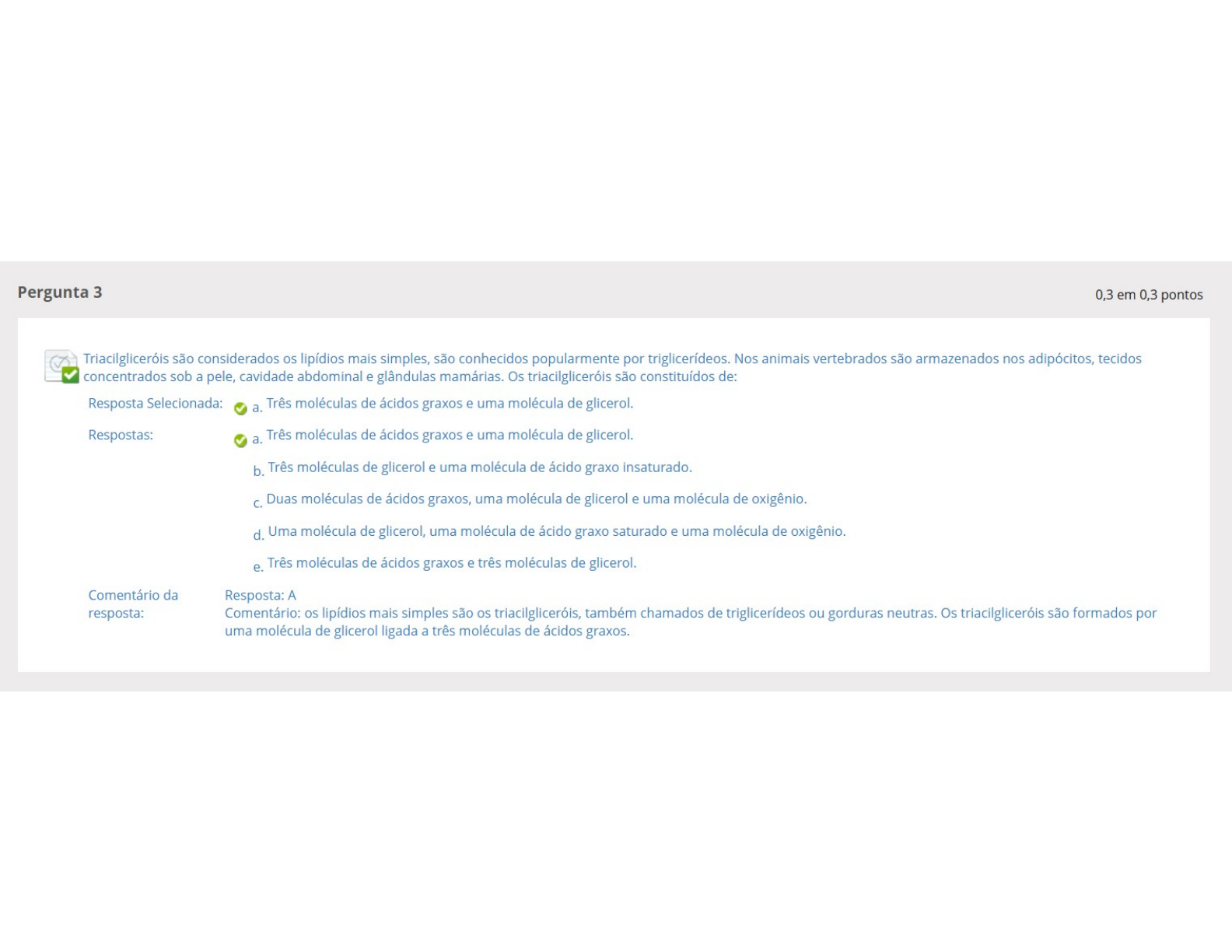 <p>Pergunta 3 0,3 em 0,3 pontos Triacilgliceróis são considerados os lipídios mais simples, são conhecidos popularmente por triglicerídeos. Nos animais vertebrados são armazenados nos adipócitos, tecidos concentrados sob a pele, cavidade abdominal e glândulas mamárias. Os triacilgliceróis são constituídos de: Resposta Selecionada: a. Três moléculas de ácidos graxos e uma molécula de glicerol. Respostas: a. Três moléculas de ácidos graxos e uma molécula de glicerol. b. Três moléculas de glicerol e uma molécula de ácido graxo insaturado. C. Duas moléculas de ácidos graxos, uma molécula de glicerol e uma molécula de oxigênio. d. Uma molécula de glicerol, uma molécula de ácido graxo saturado e uma molécula de oxigênio. e. Três moléculas de ácidos graxos e três moléculas de glicerol. Comentário da Resposta: A resposta: Comentário: os lipídios mais simples são os triacilgliceróis, também chamados de triglicerídeos ou gorduras neutras. Os triacilgliceróis são formados por uma molécula de glicerol ligada a três moléculas de ácidos graxos.</p>