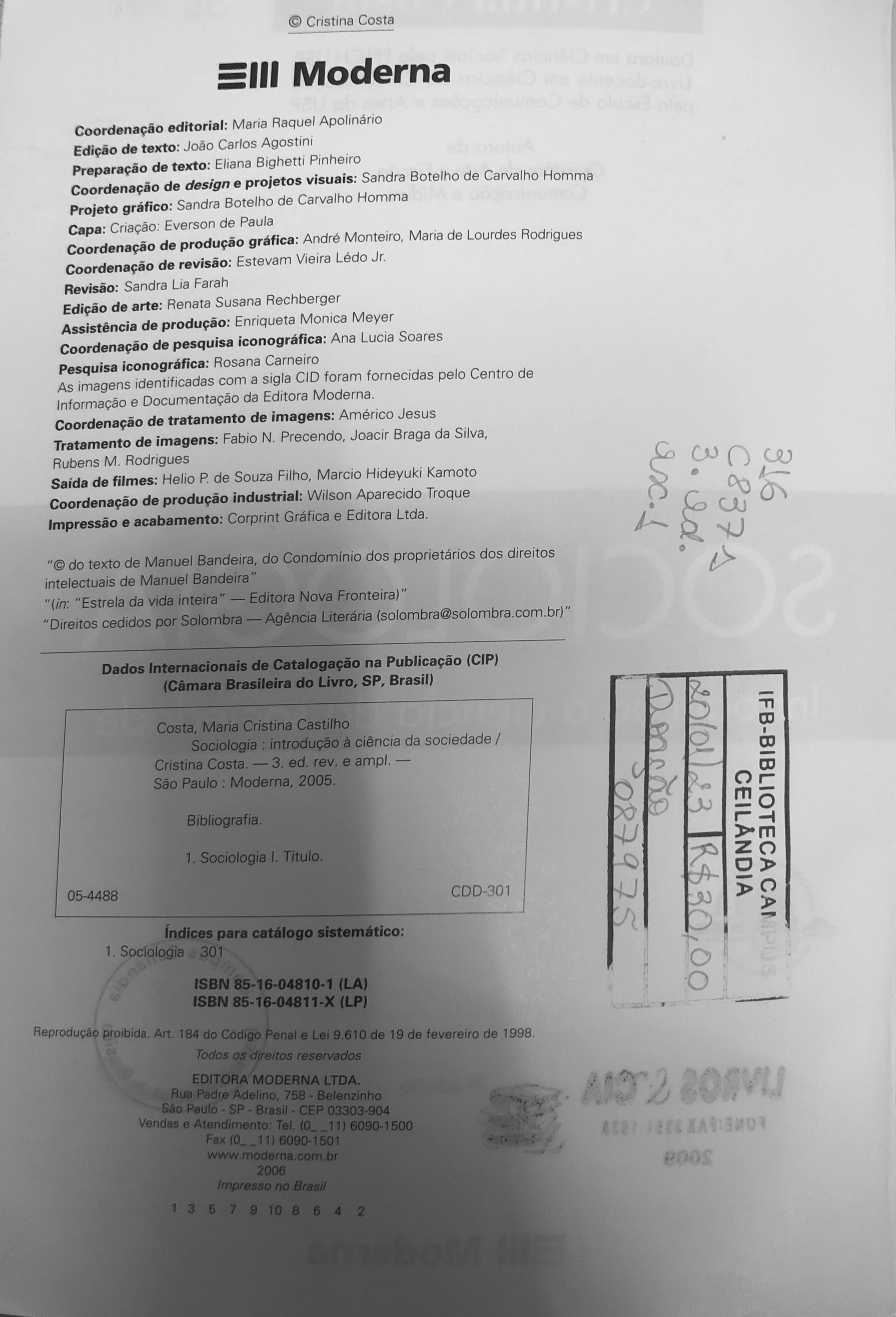 <p>Cristina Costa III Moderna Coordenação editorial: Maria Raquel Apolinário Edição de texto: João Carlos Agostini de texto: Eliana Bighetti Pinheiro Coordenação Preparação de design e projetos visuais: Sandra Botelho de Carvalho Homma Projeto gráfico: Sandra Botelho de Carvalho Homma Criação: Everson de Paula Coordenação Capa: de produção gráfica: Monteiro, Maria de Lourdes Rodrigues Coordenação de revisão: Estevam Vieira Lédo Jr. Revisão: Sandra Lia Farah Edição de arte: Renata Susana Rechberger Assistência de produção: Enriqueta Monica Meyer Coordenação de pesquisa Ana Lucia Soares As imagens identificadas com a sigla CID foram fornecidas pelo Centro de Pesquisa Rosana Carneiro Informação e Documentação da Editora Moderna. Coordenação de tratamento de imagens: Américo Jesus Tratamento de imagens: Fabio N. Precendo, Joacin Braga da Silva, Rubens M. Rodrigues Saída de filmes: Helio P. de Souza Filho, Marcio Hideyuki Kamoto Coordenação de produção industrial: Wilson Aparecido Troque Impressão e acabamento: Corprint Gráfica e Editora Ltda. do texto de Manuel Bandeira, do Condomínio dos proprietários dos direitos intelectuais de Manuel "(in: "Estrela da vida inteira" Editora Nova Fronteira)" "Direitos cedidos por Solombra - Agência Literária (solombra@solombra.com.br)" Dados Internacionais de Catalogação na Publicação (CIP) (Câmara Brasileira do Livro, SP, Brasil) Costa, Maria Cristina Castilho Sociologia : introdução à ciência da sociedade / Cristina Costa. - 3. ed. rev. e ampl. - São Paulo : Moderna, 2005. Bibliografia. 1. Sociologia Título. C 05-4488 CDD-301 Índices para catálogo sistemático: 1. Sociologia 301 ISBN 85-16-04810-1 (LA) ISBN 85-16-04811-X (LP) Reprodução proibida. Art. 184 do Código Penal e Lei 9.610 de 19 de fevereiro de 1998. Todos os direitos reservados EDITORA MODERNA LTDA. Rua Padre Adelino, 758 Belenzinho São Paulo SP Brasil - CEP 03303-904 Vendas e Atendimento: Tel. (0__11) 6090-1500 Fax (0 11) 6090-1501 www.moderna.com.br 2006 Impresso no Brasil 1 3 5 7 9 10 8 6 4 2</p><p>5 A sociologia de Durkheim O que é fato social Embora Comte seja considerado o pai da sociologia e tenha-lhe dado esse nome, Durkheim é apontado como um de seus primeiros grandes teóricos. Ele e seus colaboradores se esforçaram por emancipar a socio- logia das demais teorias sobre a sociedade e constituí-la como disciplina Comte deu o rigorosamente científica. Em livros e cursos, sua preocupação foi definir nome de com precisão o objeto, método e as aplicações dessa nova ciência. sociologia a Imbuído dos princípios positivistas, Durkheim queria definir com ri- essa ciência, gor a sociologia como ciência, estabelecendo seus princípios e limites e mas rompendo com as idéias de senso comum os "achismos" - que inter- Durkheim foi pretavam a realidade social de maneira vulgar e sem critérios. um dos seus Em uma de suas obras fundamentais, As regras do método sociológico, grandes publicada em 1895, Durkheim definiu com clareza o objeto da socio- teóricos. logia os fatos sociais. De acordo com as idéias defendidas nesse trabalho, para o autor, o fato social é experimentado pelo indivíduo como uma realidade inde- pendente e preexistente. Assim, são três as características básicas que distinguem os fatos sociais. A primeira delas é a "coerção social", ou seja, a força que os fatos exercem sobre os indivíduos, levando-os a con- formarem-se às regras da sociedade em que vivem, independentemente de sua vontade e escolha. Essa força se manifesta quando indivíduo desenvolve ou adquire um idioma, quando é criado e se submete a um determinado tipo de formação familiar ou quando está subordinado a certo código de leis ou regras morais. Nessas circunstâncias, o ser huma- no experimenta a força da sociedade sobre si. A força coercitiva dos fatos sociais se torna evidente pelas "sanções legais" ou "espontâneas" a que o indivíduo está sujeito quando tenta rebelar-se contra ela. "Legais" são as sanções prescritas pela socieda- de, sob a forma de leis, nas quais se define a infração e se estabelece a penalidade correspondente. "Espontâneas" são as que afloram como resposta a uma conduta considerada inadequada por um grupo ou por uma sociedade. Multas de trânsito, por exemplo, fazem parte das coer- ções legais, pois estão previstas e regulamentadas pela legislação que regula tráfego de veículos e pessoas pelas vias públicas. Já os olhares de reprovação de que somos alvo quando comparecemos a um local com a roupa inadequada constituem sanções espontâneas. Embora não codificados em lei, esses olhares têm poder de conduzir o infrator para comportamento esperado. Durkheim dá seguinte exemplo das sanções espontâneas: A SOCIOLOGIA DE DURKHEIM 81</p><p>Émile Durkheim (1858-1917) em Epinal, na Alsácia, descenden- seus brinho Marcel Mauss, po que ficou conhecido como num Nasceu de uma família de rabinos. Iniciou estudos te filosóficos na Escola Normal Superior lógica francesa. Suas principais obras de Paris, indo depois para a Alemanha. Leci- Da divisão do trabalho social, As foram onou sociologia em Bordéus, primeira cáte- método sociológico, O regras do dra dessa ciência criada na França. Transfe- mentares da vida religiosa, Educação riu-se em 1902 para Sorbonne, para onde levou inúmeros cientistas, entre eles seu ologia, Sociologia e filosofia e Lições e de ciologia (obra póstuma). Se sou industrial, nada me proíbe de trabalhar utili- zando processos e técnicas do século passado; mas, se fizer, terei a ruína como resultado inevitável. DURKHEIM, Émile. As regras do método São Paulo: Nacional. 1963. p. 3 O comportamento desviante num grupo social pode não ter pena- lidade prevista por lei, mas o grupo pode espontaneamente reagir cas- tigando quem se comporta de forma discordante em relação a deter- minados valores e princípios. A reação negativa da socied