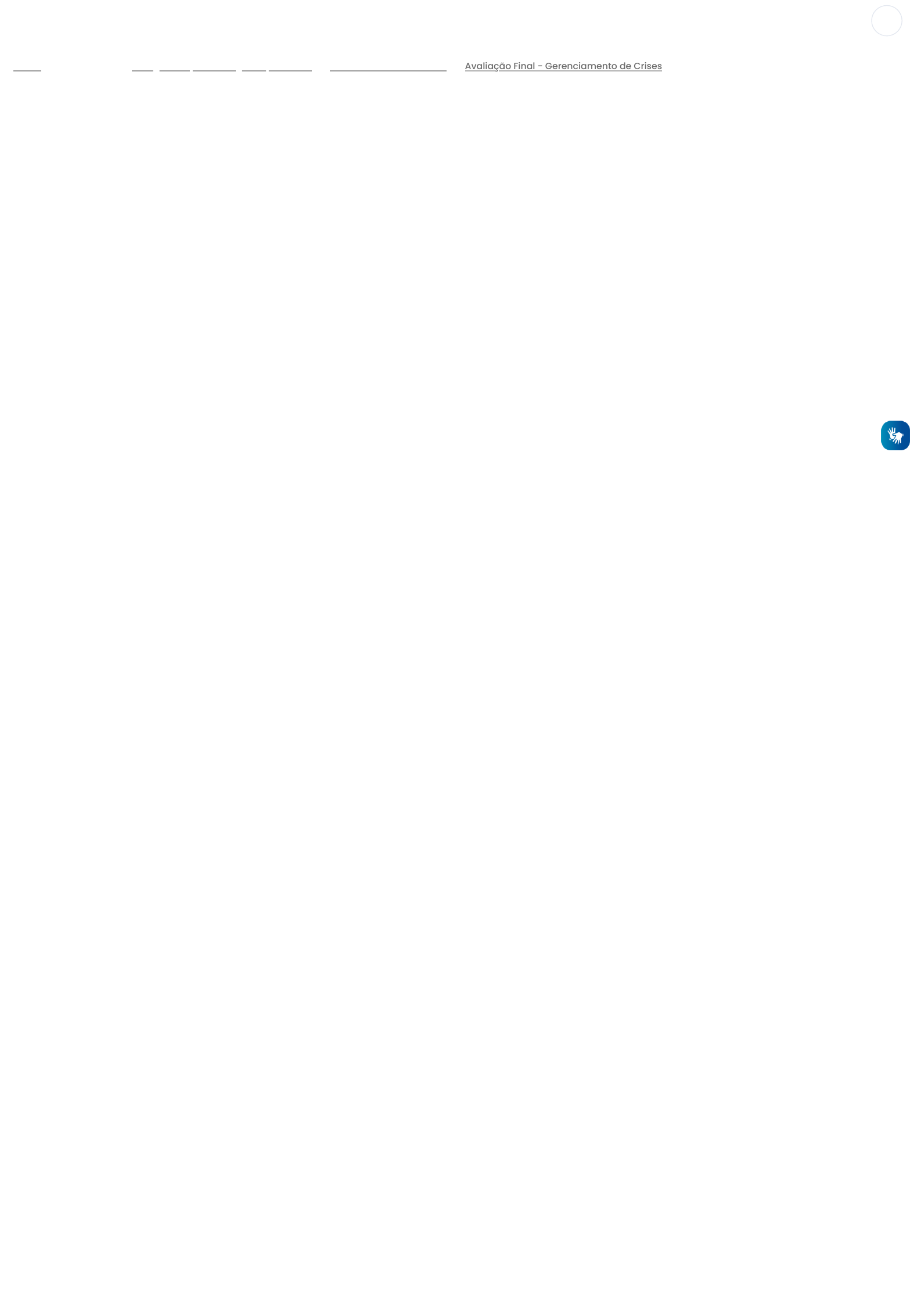 <p>09/03/2023 10:42 Avaliação Final - Gerenciamento de Crises: Revisão da tentativa</p><p>https://ava.faculdadefocus.edu.br/mod/quiz/review.php?attempt=197837&cmid=1366 1/4</p><p>- Meus cursos - - - Painel Pós-graduação em Segurança Pública Gerenciamento de Crises Avaliação Final - Gerenciamento de Crises</p><p> </p><p>https://ava.faculdadefocus.edu.br/my/</p><p>https://ava.faculdadefocus.edu.br/course/view.php?id=44</p><p>https://ava.faculdadefocus.edu.br/course/view.php?id=44§ion=11</p><p>https://ava.faculdadefocus.edu.br/mod/quiz/view.php?id=1366</p><p>09/03/2023 10:42 Avaliação Final - Gerenciamento de Crises: Revisão da tentativa</p><p>https://ava.faculdadefocus.edu.br/mod/quiz/review.php?attempt=197837&cmid=1366 2/4</p><p>Iniciado em quinta, 9 mar 2023, 09:32</p><p>Estado Finalizada</p><p>Concluída em quinta, 9 mar 2023, 10:42</p><p>Tempo</p><p>empregado</p><p>1 hora 10 minutos</p><p>Avaliar 8,0 de um máximo de 10,0(80%)</p><p>Questão 1</p><p>Incorreto Atingiu 0,0 de 1,0</p><p>=Do conteúdo estudo pode-se dizer que o Gerenciamento de Crise exigirá, como demonstrado pelos eventos</p><p>ocorridos na Olimpíada de Munique em 1972:</p><p>a. Postura organizacional rotineira, Planejamento analítico, Considerações legais especiais</p><p>b. Postura organizacional não-rotineira, Planejamento analítico especial, (prévio);</p><p>c. Postura organizacional não-rotineira, Planejamento analítico, Considerações legais especiais;</p><p>d. Postura organizacional não-rotineira, Planejamento analítico especial, (prévio), Considerações legais especiais </p><p>e. Postura organizacional rotineira, Planejamento analítico especial, (prévio), Considerações legais especiais;</p><p>Questão 2</p><p>Correto Atingiu 1,0 de 1,0</p><p>Analise a afirmação a seguir: “O comando horizontal é uma ocorrência típica deste sistema, e se caracteriza</p><p>pela peculiaridade de que o comandante de cada componente do sistema exercer o comando quando de</p><p>sua atuação.”, a afirmação está:</p><p>a. Correta; </p><p>b. Errada.</p><p>Questão 3</p><p>Correto Atingiu 1,0 de 1,0</p><p>Quando da elaboração do Planejamento Específico é necessário que se anteveja qual opção para a solução</p><p>do evento será adotada, sendo as possíveis:</p><p>a. Neutralização do PEC.</p><p>b. Negociação e transferência da crise para outro local;</p><p>c. Negociação e assalto emergencial;</p><p>d. Negociação, assalto tático e postergação da crise;</p><p>e. Negociação e assalto tático; </p><p>Questão 4</p><p>Correto Atingiu 1,0 de 1,0</p><p>O sistema de Gerenciamento de Crises integralmente montado para atender um evento crítico será composto</p><p></p><p>09/03/2023 10:42 Avaliação Final - Gerenciamento de Crises: Revisão da tentativa</p><p>https://ava.faculdadefocus.edu.br/mod/quiz/review.php?attempt=197837&cmid=1366 3/4</p><p>necessariamente pelos seguintes atores:</p><p>a. Grupo de Decisão, Gerente da Crise, Grupo de Negociadores e Grupo Tático; </p><p>b. Grupo de Decisão, Grupo de Negociadores e Grupo Tático.</p><p>c. Gerente da Crise, Grupo de Negociadores e Grupo Tático;</p><p>d. Grupo de Perímetro, Gerente da Área, Grupo de Relações Públicas e Grupo de Assalto;</p><p>e. Grupo de Decisão, Gerente da Crise e Grupo de Negociadores;</p><p>Questão 5</p><p>Correto Atingiu 1,0 de 1,0</p><p>De acordo com o conteúdo apreendido a afirmação “O Gerenciamento de Crises, conceituado como</p><p>processo, busca atingir dois objetivos, a aplicação da Lei e a Preservação de Vidas, nesta ordem” está:</p><p>a. Correta;</p><p>b. Errada. </p><p>Questão 6</p><p>Correto Atingiu 1,0 de 1,0</p><p>Com relação as pessoas capturadas, é correto afirmar-se que:</p><p>a. Vítimas são as pessoas capturadas que não sofreram a chamada síndrome de Estocolmo;</p><p>b. Reféns são as pessoas capturadas que não sofreram a chamada síndrome de Estocolmo</p><p>c. Reféns, são, grosso modo, as pessoas capturadas que tem valor real para o PEC que pretende utiliza-la para obter alguma</p><p>vantagem ou benefício no processo de negociação enquanto as vítimas não tem qualquer valor para o PEC exceto o de</p><p>possibilitar a consecução de seus objetivos com a sua morte</p><p></p><p>d. Reféns e vítimas são pessoas capturadas, não havendo qualquer distinção entre elas;</p><p>e. Reféns não tem qualquer valor para o PEC exceto o de possibilitar a consecução de seus objetivos com a sua morte enquanto as</p><p>vítimas as pessoas capturadas que tem valor real para o PEC que pretende utiliza-la para obter alguma vantagem ou benefício</p><p>no processo de negociação;</p><p>Questão 7</p><p>Correto Atingiu 1,0 de 1,0</p><p>Dentro do sistema de Gerenciamento de Crises, compete ao Gerente da Crise, exceto:</p><p>a. providenciar toda a estrutura física onde estará disposta a equipe de gerenciamento;</p><p>b. Coordenação dos demais elementos e pelas decisões do grupo;</p><p>c. Fixar os parâmetros para a realização de um assalto tático de emergência; </p><p>d. Interlocução com o Grupo de Decisão;</p><p>e. Responsável pelas decisões do Grupo de Gerenciamento de Crise.</p><p>Questão 8</p><p>Correto Atingiu 1,0 de 1,0</p><p>Com relação Implementação do Plano Específico voltado a ação tática – Assalto Deliberado, é INCORRETO</p><p>afirmar:</p><p></p><p>09/03/2023 10:42 Avaliação Final - Gerenciamento de Crises: Revisão da tentativa</p><p>https://ava.faculdadefocus.edu.br/mod/quiz/review.php?attempt=197837&cmid=1366 4/4</p><p>afirmar:</p><p>a. Nos EUA 93% dos eventos críticos são resolvidos com a necessidade de emprego do grupo tático </p><p>b. Caso o evento não seja negociável ou se trate de necessidade de intervenção, a única possibilidade de resolver a crise</p><p>alcançando-se a solução aceitável é através da utilização da força, materializada pela ação do grupo tático</p><p>c. Nenhuma das anteriores.</p><p>d. Antes d