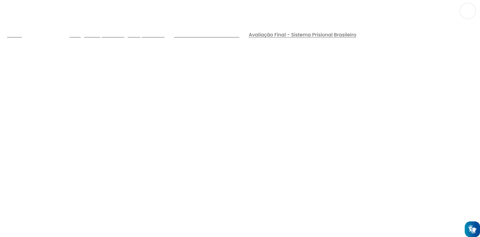 <p>09/03/2023 12:44 Avaliação Final - Sistema Prisional Brasileiro: Revisão da tentativa</p><p>https://ava.faculdadefocus.edu.br/mod/quiz/review.php?attempt=197892&cmid=1368 1/4</p><p>- Meus cursos - - - Painel Pós-graduação em Segurança Pública Sistema Prisional Brasileiro Avaliação Final - Sistema Prisional Brasileiro</p><p> </p><p>https://ava.faculdadefocus.edu.br/my/</p><p>https://ava.faculdadefocus.edu.br/course/view.php?id=44</p><p>https://ava.faculdadefocus.edu.br/course/view.php?id=44§ion=12</p><p>https://ava.faculdadefocus.edu.br/mod/quiz/view.php?id=1368</p><p>09/03/2023 12:44 Avaliação Final - Sistema Prisional Brasileiro: Revisão da tentativa</p><p>https://ava.faculdadefocus.edu.br/mod/quiz/review.php?attempt=197892&cmid=1368 2/4</p><p>Iniciado em quinta, 9 mar 2023, 10:46</p><p>Estado Finalizada</p><p>Concluída em quinta, 9 mar 2023, 12:44</p><p>Tempo</p><p>empregado</p><p>1 hora 57 minutos</p><p>Avaliar 9,0 de um máximo de 10,0(90%)</p><p>Questão 1</p><p>Correto Atingiu 1,0 de 1,0</p><p>No que tange às instituições responsáveis pela execução penal e aos entes federativos:</p><p>a. Os municípios são os principais responsáveis pela execução penal;</p><p>b. Diferente das instituições relacionada à Segurança Pública, não houve preocupação ou padronização em relação à</p><p>execução penal no Brasil, ficando a responsabilidade para os estados. Em cada um a execução penal foi tratada de forma</p><p>diversa, com grande desconformidade em todo país;</p><p></p><p>c. Assim como as instituições relacionada à Segurança Pública, houve grande preocupação com a padronização, gerando um</p><p>modelo único em todo território nacional;</p><p>d. A união é a principal responsável pela execução penal.</p><p>Questão 2</p><p>Correto Atingiu 1,0 de 1,0</p><p>Cesare Beccaria foi considerado:</p><p>a. Principal representante do iluminismo penal e da Escola Clássica do Direito Penal; </p><p>b. Escritor do Código de Hamurabi;</p><p>c. Brasileiro responsável pela elaboração da LEP – Lei de Execução Penal.</p><p>d. Criador da expressão "olho por olho, dente por dente";</p><p>Questão 3</p><p>Correto Atingiu 1,0 de 1,0</p><p>Segundo o INFOPEN, o Brasil conta com a terceira maior população penitenciária do mundo, atrás apenas de:</p><p>a. China e Argentina</p><p>b. Reino Unido e China;</p><p>c. Estados Unidos e China; </p><p>d. China e Índia;</p><p>Questão 4</p><p>Correto Atingiu 1,0 de 1,0</p><p>Em relação à situação atual do sistema prisional brasileiro assinale a alternativa correta</p><p>a. Como resultado desse modelo, estamos vivendo um verdadeiro caos prisional e social, porém, o custo de operação das</p><p>penitenciárias é baixo, com baixo valor gasto por preso.</p><p></p><p>09/03/2023 12:44 Avaliação Final - Sistema Prisional Brasileiro: Revisão da tentativa</p><p>https://ava.faculdadefocus.edu.br/mod/quiz/review.php?attempt=197892&cmid=1368 3/4</p><p>b. O modelo de gestão prisional vigente hoje Brasil mostre-se atualizado, capaz de enfrentar a crise no sistema prisional Brasileiro;</p><p>c. Como resultado desse modelo, o Brasil atravessa um período de estabilidade, com o total controle sobre os estabelecimentos</p><p>prisionais;</p><p>d. O modelo de gestão prisional vigente hoje Brasil mostre-se ultrapassado, ineficiente e, principalmente, um risco crescente à</p><p>sociedade e ao Estado Brasileiro.</p><p></p><p>Questão 5</p><p>Correto Atingiu 1,0 de 1,0</p><p>Segundo à lei 7.209/84, assinale a alternativa INCORRETA</p><p>a. A Colônia Agrícola, Industrial ou Similar destina-se ao cumprimento da pena em regime semi-aberto.</p><p>b. A penitenciária destina-se ao condenado à pena de reclusão, em regime fechado;</p><p>c. A Casa do Albergado destina-se ao cumprimento de pena privativa de liberdade em regime semi-fechado. </p><p>d. No Centro de Observação realizar-se-ão os exames gerais e o criminológico, cujos resultados serão encaminhados à Comissão</p><p>Técnica de Classificação.</p><p>Questão 6</p><p>Correto Atingiu 1,0 de 1,0</p><p>Com relação às ordenações manuelinas</p><p>a. Não se referem ao Brasil, mas somente à Portugal.</p><p>b. Contemplavam direitos e garantias individuais semelhantes as que existem hoje;</p><p>c. Foram editadas em 1514 e foram consideradas a real e efetiva legislação do início do regime colonial no Brasil; </p><p>d. Serviram de base para elaboração do atual Código Penal brasileiro;</p><p>Questão 7</p><p>Correto Atingiu 1,0 de 1,0</p><p>Segundo a Lei de execução penal, o Hospital de Custódia e Tratamento Psiquiátrico destina-se:</p><p>a. Aos semi-imputáveis, somente.</p><p>b. Ao atendimento de presos em estado grave;</p><p>c. Aos imputáveis, somente;</p><p>d. Aos inimputáveis e semi-imputáveis referidos no artigo 26 e seu parágrafo único do Código Penal; </p><p>Questão 8</p><p>Incorreto Atingiu 0,0 de 1,0</p><p>Com relação a origem da prisão com pena e seu histórico, julgue as alternativas abaixo.</p><p>a. A ideia de restrição de liberdade como pena específica surge inicialmente na igreja, destinada aos clérigos rebeldes, que ficavam</p><p>trancados nos mosteiros, para que, por meio de penitência, se arrependessem do mal e obtivessem a correção;</p><p>b. O termo “penitenciária” é moderno e foi adota pelo fato das pessoas sentirem pena dos condenados;</p><p>c. O iluminismo pregava a pena de morte aos criminosos em geral. </p><p>d. O aumento da pobreza não provocou um aumento na criminalidade e não influenciou no sistema prisional;</p><p></p><p>09/03/2023 12:44 Avaliação Final - Sistema Prisional Brasileiro: Revisão da tentativa</p><p>https://ava.faculdadefocus.edu.br/mod/quiz/review.php?attempt=197892&cmid=1368 4/4</p><p>Questão 9</p><p>Correto Atingiu 1,0 de 1,0</p><p>Com relação ao Papel da União na Execução penal:</p><p>a. A união não tem sistema penitenciário sob sua responsabilidade direta;</p><p>b. A u