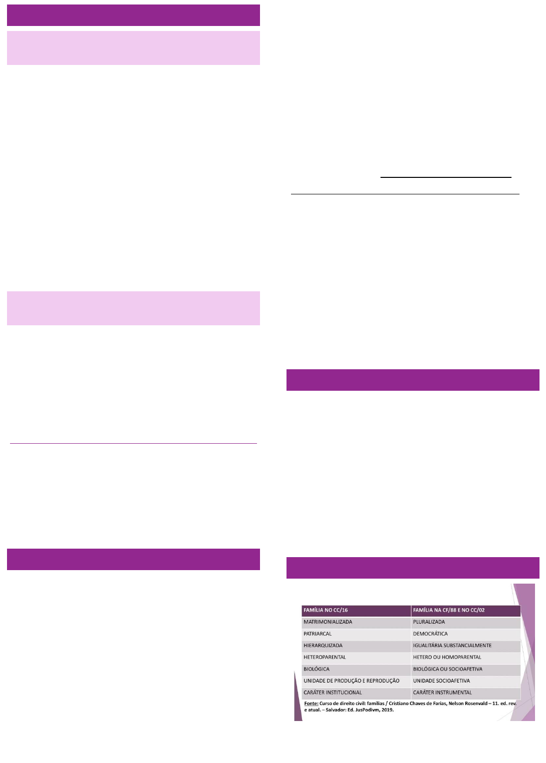 <p>DIREITO DE FAMILIA – CIVIL V</p><p>MODELANDO A IMPORTÂNCIA E A FEIÇÃO DAS</p><p>FAMÍLIAS.</p><p>* A nova realidade das interações familiares</p><p>→ o afeto como liame principal da convivência.</p><p>(A Família Pós- Moderna)</p><p>→ Subjetiva x Institucional.</p><p>→ Relacional x Nuclear.</p><p>→ Foco na qualidade das relações.</p><p>→ Biológico-Afetiva x Exclusivamente biológica. -</p><p>Promoção da personalidade dos seus entes.</p><p>CONSTITUCIONALIZAÇÃO DO DIREITO CIVIL E DO</p><p>DIREITO DAS FAMÍLIAS.</p><p>* CF/88: Uma Constituição Programática.</p><p>→ A cultura positivo-legalista.</p><p>→ A neutralidade das Constituições anteriores.</p><p>→ A CF/88 estabelece um programa.</p><p>“PERCEBE -SE QUE O DIREITO CONSTITUCIONAL</p><p>AFASTOU-SE DE UM CARÁTER NEUTRO E</p><p>INDIFERENTE SOCIALMENTE, DEIXANDO DE CUIDAR</p><p>APENAS DA ORGANIZAÇÃO POLÍTICA DO ESTADO</p><p>PARA AVIZINHAR-SE DAS NECESSIDADES HUMANAS</p><p>REAIS, CONCRETAS, AO CUIDAR DE DIREITOS</p><p>INDIVIDUAIS E SOCIAIS”.</p><p>A FAMÍLIA NA CF/88.</p><p>Art. 226. A família, base da sociedade, tem</p><p>especial proteção do Estado.</p><p>§ 1o O casamento é civil e gratuita a celebração.</p><p>§ 2o O casamento religioso tem efeito civil, nos</p><p>termos da lei.</p><p>§ 3o Para efeito da proteção do Estado, é</p><p>reconhecida a união estável entre o homem e a</p><p>mulher como entidade familiar, devendo a lei</p><p>facilitar sua conversão em casamento.</p><p>§ 4o Entende-se, também, como entidade</p><p>familiar a comunidade formada por qualquer dos</p><p>pais e seus descendentes.</p><p>§ 5o Os direitos e deveres referentes à sociedade</p><p>conjugal são exercidos igualmente pelo homem e</p><p>pela mulher.</p><p>§ 6o O casamento civil pode ser dissolvido pelo</p><p>divórcio.</p><p>§ 7o Fundado nos princípios da dignidade da</p><p>pessoa humana e da paternidade responsável, o</p><p>planejamento familiar é livre decisão do casal,</p><p>competindo ao Estado propiciar recursos</p><p>educacionais e científicos para o exercício desse</p><p>direito, vedada qualquer forma coercitiva por</p><p>parte de instituições oficiais ou privadas.</p><p>§ 8o O Estado assegurará a assistência à família</p><p>na pessoa de cada um dos que a integram,</p><p>criando mecanismos para coibir a violência no</p><p>âmbito de suas relações.</p><p>A FAMÍLIA NA CF/88.</p><p>Art. 227. É dever da família, da sociedade e do</p><p>Estado assegurar à criança, ao adolescente e ao</p><p>jovem, com absoluta prioridade, o direito à vida,</p><p>à saúde, à alimentação, à educação, ao lazer, à</p><p>profissionalização, à cultura, à dignidade, ao</p><p>respeito, à liberdade e à convivência familiar e</p><p>comunitária, além de colocá-los a salvo de toda</p><p>forma de negligência, discriminação, exploração,</p><p>violência, crueldade e opressão.</p><p>O DIREITO DE FAMÍLIA ATUAL.</p><p>O DIREITO DE FAMÍLIA.</p><p>* Direito de Família ou Das Famílias?</p><p>ESTRUTURA:</p><p>→ Direito Matrimonial das Famílias.</p><p>→Direito Convivencial das Famílias.</p><p>→Direito Parental das Famílias.</p><p>→ Direito Assistencial das Famílias.</p><p>→ Natureza Jurídica: Acentuadamente de Dir.</p><p>Privado. (Art. 1513 CC)</p><p>PRINCÍPIOS CONSTITUCIONAIS ESPECÍFICOS DO</p><p>DIREITO DE FAMÍLIA.</p><p>→Princípio da pluralidade das entidades</p><p>familiares. (Art. 226, rol não taxativo)</p><p>→Princípio da igualdade (isonomia) entre o</p><p>homem e a mulher. (Art. 226)</p><p>→Princípio da igualdade substancial entre os</p><p>filhos. (Art. 227, § 6º).</p><p>→ Princípio da facilitação da dissolução do</p><p>casamento. (Art. 226, § 6º)</p><p>→ Princípio da afetividade. (Implícito)</p><p>→Princípio do melhor interesse da criança e do</p><p>adolescente. (Art. 227, caput e ECA.)</p><p>→Princípio da Solidariedade. (Art. 229 e 230)</p><p>(Proteção ao Idoso)</p><p>→Princípio da Monogamia??</p><p>CASAMENTO: NOÇÕES CONCEITUAIS.</p><p>→ Procriação.</p><p>→Indissolubilidade.</p><p>→Religiosidade.</p><p>CONCEITO ATUAL:</p><p>“Entidade familiar estabelecida entre pessoas</p><p>humanas, merecedora de especial proteção</p><p>estatal, constituída, formal e solenemente,</p><p>formando uma comunhão de afetos (comunhão</p><p>de vida) e produzindo diferentes efeitos no</p><p>âmbito pessoal, social e patrimonial.”</p><p>CASAMENTO: NOÇÕES CONCEITUAIS.</p><p>FINALIDADE:</p><p>→ Comunhão de vida.</p><p>NATUREZA JURÍDICA:</p><p>→ 1a Corrente: natureza negocial.</p><p>→ 2a Corrente: natureza institucional.</p><p>→ 3a Corrente: eclética ou mista.</p><p>→ Camilo Colani: “o casamento está contrato”.</p><p>➔ Em seu momento atual, o casamento se</p><p>confirma como negocial.</p><p>CASAMENTO: NOÇÕES CONCEITUAIS.</p><p>CARACTERÍSTICAS:</p><p>a) Caráter personalíssimo e livre quanto à escolha</p><p>b) solenidade de celebração</p><p>c) inexigência de diversidade dos sexos</p><p>d) inadmissibilidade de submissão a termo ou</p><p>condição</p><p>e) estabelecimento de uma comunhão de vida</p><p>f) natureza cogente das normas que o</p><p>regulamentam</p><p>g) estrutura monogâmica</p><p>h) dissolubilidade, de acordo com a vontade das</p><p>partes.</p><p>A PROMESSA DE CASAMENTO.</p><p>→ Os esponsais ou noivos.</p><p>→ O compromisso de casamento – promessa</p><p>recíproca. - Expectativas leais.</p><p>Responsabilidade civil:</p><p>→ Dano moral por comportamento</p><p>contraditório?</p><p>→Promessa de Casamento x Pacto Pré-Nupcial: -</p><p>Não confundir</p><p>FORMAS ESPECIAS DE CASAMENTO.</p><p>→ POR PROCURAÇÃO. (ART. 1542 CC)</p><p>- Realizado por meio de mandato, com poderes</p><p>especiais.</p><p>- Cláusula de irrevogabilidade.</p><p>REQUISITOS</p><p>→INSTRUMENTO PUBLICO</p><p>→PODERES EPECIAIS EXPRESSO NA</p><p>PROCURAÇÃO</p><p>→NAO ULTRAPASSA 90 DIAS</p><p>→NUNCUPATIVO