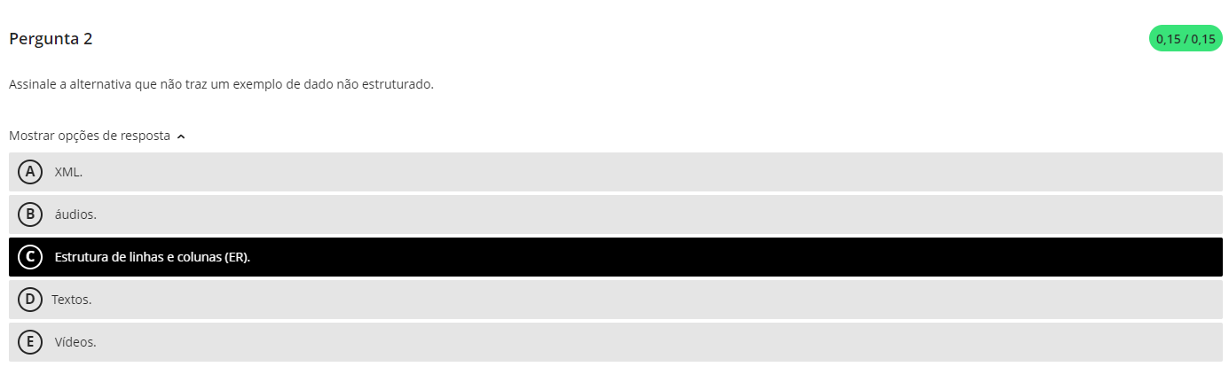 <p>Pergunta 2 0,15/0,15 Assinale a alternativa que não traz um exemplo de dado não estruturado. Mostrar opções de resposta ^ A XML. B C Estrutura de linhas e colunas (ER). D E</p>