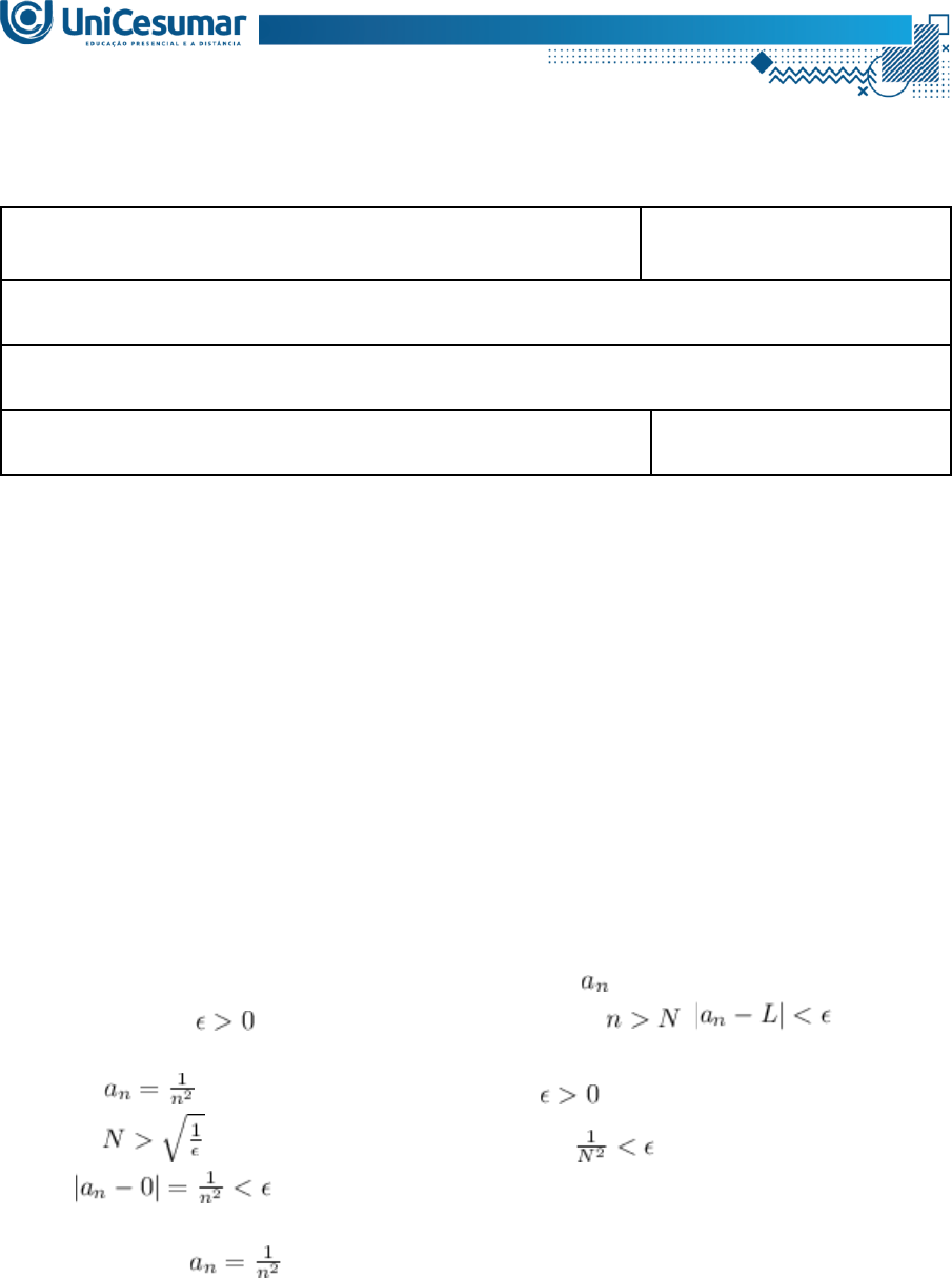 <p>AE 1 – ATIVIDADE DE ESTUDO 01</p><p>ACADÊMICO: Emily Gabriely Dias Campos Da Silva R.A.: 19124237-5</p><p>CURSO: Licenciatura em Matemática</p><p>DISCIPLINA: ANÁLISE MATEMÁTICA</p><p>VALOR DA ATIVIDADE: 0,5 PONTO PRAZO: 08/09/2024 23:59</p><p>Estudar a convergência de sequências e séries é essencial porque</p><p>esses conceitos são fundamentais para o entendimento e aplicação de muitos</p><p>ramos da matemática e suas aplicações práticas. Eles fornecem as</p><p>ferramentas necessárias para análise, modelagem, e solução de problemas em</p><p>diversas áreas do conhecimento</p><p>Sobre a convergência de sequências e séries, considere a sequência</p><p>an definida por an =1/n2, e resolva as seguintes questões.</p><p>1) Prove, utilizando a definição, que a sequência an converge e determine o</p><p>seu limite.</p><p>Convergência da Sequência:</p><p>• Definição de Convergência: Uma sequência converge para um limite L se,</p><p>para todo , existe um N tal que para todo , .</p><p>Para , escolha L = 0. Para qualquer , se</p><p>escolher (resolvendo a partir da equação ), então para todo n > N,</p><p>temos . Assim, a sequência converge para 0.</p><p>A sequência converge e seu limite é 0. Isso é provado pela definição</p><p>de convergência de sequência.</p><p>2) Considere a série dada por ∑an . Determine se a série converge ou diverge.</p><p>Convergência da Série:</p><p>Podemos usar o critério da integral de Cauchy, pelo qual a integral imprópria</p><p>entre 1 e infinito deve ser finita, isso é possível porque an é monotonamente</p><p>decrescente e sempre positiva:</p><p>A série converge, pois é uma série p-série com p > 1, isso pode</p><p>ser comprovado mediante o critério da integral de Cauchy.</p>