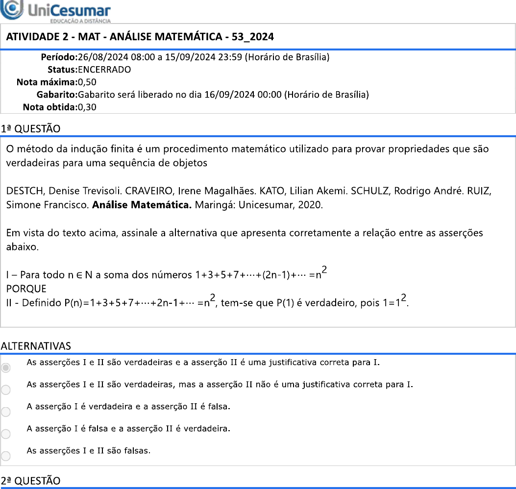 <p>UniCesumar EDUCAÇÃO A DISTÂNCIA ATIVIDADE 2 - MAT - ANÁLISE MATEMÁTICA - 53_2024 Período: 08:00 a 15/09/2024 23:59 (Horário de Brasília) Status:ENCERRADO Nota máxima:0,50 Gabarito:Gabarito será liberado no dia 16/09/2024 00:00 (Horário de Brasília) Nota obtida:0,30 QUESTÃO O método da indução finita é um procedimento matemático utilizado para provar propriedades que são verdadeiras para uma sequência de objetos DESTCH, Denise CRAVEIRO, Irene Magalhães. KATO, Lilian Akemi. SCHULZ, Rodrigo André. RUIZ, Simone Francisco. Análise Matemática. Maringá: Unicesumar, 2020. Em vista do texto acima, assinale a alternativa que apresenta corretamente a relação entre as asserções abaixo 2 - - Para todo e N a soma dos números PORQUE - - Definido tem-se que P(1) é verdadeiro, pois ALTERNATIVAS As asserções I e II são verdadeiras e a asserção II é uma justificativa correta para I. As asserções I e II são verdadeiras, mas a asserção II não é uma justificativa correta para I. A asserção I é verdadeira e a asserção II é falsa. A asserção I é falsa e a asserção II é verdadeira. As asserções I e II são falsas. QUESTÃO</p><p>Uma classe de séries cujos termos são, alternadamente, positivos e negativos são chamadas de séries alternadas. DESTCH, Denise Trevisoli. CRAVEIRO, Irene Magalhães. KATO, Lilian Akemi. SCHULZ, Rodrigo André. RUIZ, Simone Francisco. Análise Matemática. Maringá: Unicesumar, 2020. Adaptado. Com apoio do texto base, analise as asserções a seguir. - A série a seguir é convergente 2n 4 n=1 PORQUE - As condições do critério de Leibniz são satisfeitas, tomando 1/n. Assinale a alternativa que apresenta corretamente a relação entre elas. ALTERNATIVAS As asserções I e II são verdadeiras, e a asserção II é uma justificativa correta para I. As asserções I e II são verdadeiras, mas a asserção II não é uma justificativa correta para I. A asserção I é verdadeira e a asserção II é falsa A asserção I é falsa e a asserção II é verdadeira As asserções I e il são falsas. QUESTÃO Sejam a, b, e d números reais tais que, Considere os intervalos X = b, d). Fonte: Elaborado pelo professor, 2024. Sabendo disso, avalie as seguintes afirmativas: I. O conjunto Y tem supremo, mas não tem máximo. II. Os conjuntos X e Y são compactos. III. Todo máximo é supremo, mas nem todo supremo é máximo. IV. Todo ínfimo é cota inferior, mas nem toda cota inferior é ínfimo. É correto o que se afirma em: ALTERNATIVAS</p><p>I e III, apenas. I e IV, apenas. I, II e III, apenas. I, III e IV, apenas. I, II, III e IV. QUESTÃO Sejam X=(0,2) e -3,3 ambos intervalos definidos na reta real. , Fonte: Elaborado pelo professor, 2024. Sabendo disso, avalie as afirmativas a seguir: I. é um conjunto aberto. II. X é um intervalo fechado e Y é enumerável. III. X U Y é um conjunto compacto. IV. X é um conjunto limitado. É correto o que se afirma em: ALTERNATIVAS I e II, apenas. I e III, apenas. I e IV, apenas. I, III e IV, apenas. I, II, III e IV. QUESTÃO Sobre o limite de funções, avalie as asserções a seguir e a relação proposta entre elas: I. x-3 PORQUE II. Dado basta tomar Assim, E A respeito dessas asserções, assinale a alternativa correta: ALTERNATIVAS</p><p>As asserções I e II são verdadeiras, e a II é uma justificativa correta da I. As asserções I e II são verdadeiras, mas a II não é uma justificativa correta da I. A asserção I é uma proposição verdadeira e a II é uma proposição falsa. A asserção I é uma proposição falsa e a II é uma proposição verdadeira. As asserções I e II são falsas. QUESTÃO Sobre as noções de topologia na reta, considere conjunto ACR, tal que A={xER;0</p><p>O conceito das séries numéricas, são de grande importância na Matemática, uma vez que possibilitam modelar, matematicamente alguns processos discretos e infinitos. DESTCH, Denise Trevisoli. CRAVEIRO, Irene Magalhães. KATO, Lilian Akemi. SCHULZ, Rodrigo André. RUIZ, Simone Francisco. Análise Matemática. Maringá: Unicesumar, 2020. Adaptado. Em vista do texto acima, analise as séries a seguir. 3n n - 2n+1 n=0 3n 2 n - n=0 1 + n n III n=0 O(s) item(ns) que apresenta(m) série(s) convergente(s) pelo teste da raiz são: ALTERNATIVAS I apenas. III, apenas. I e II, apenas. II e III, apenas. I, II e III. QUESTÃO</p><p>Uma função realiza associações entre dois conjuntos não vazios. Podendo ser definida como uma lei que associa cada elemento de um conjunto em um único elemento do outro. DESTCH, Denise Trevisoli. CRAVEIRO, Irene Magalhães. KATO, Lilian Akemi. SCHULZ, Rodrigo André. RUIZ, Simone Francisco. Análise Matemática. Maringá: Unicesumar, 2020. Adaptado. Com base no texto acima, analise as afirmações a seguir Seja f: A-B uma função. - Os conjuntos A e B são ditos domínio e contradomínios da função respectivamente. - - f é dita uma função injetora se, para quais quer valores de a,b E A, tais que f(a)=f(b), então a = b. III - - f é dita uma função sobrejetora se, para cada b existe a E A, tal que f(a)=b. IV - f é dita uma função bijetora se f é somente injetora. É correto o que se diz em: ALTERNATIVAS I, apenas. I e III, apenas. II, e III, apenas. I, II e III, apenas. I, II, III e IV. QUESTÃO Sobre a convergência de sequências, avalie as asserções a seguir e a relação proposta entre elas: I. Seja uma sequência com o termo geral dado por Xn = Essa sequência converge para 0. 3n PORQUE II. Se considerarmos temos 3n 1 - 0</p><p>Uma função é injetora se os elementos distintos do domínio tiverem imagens distintas. Uma função é sobrejetora se, e somente se, o seu conjunto imagem for especificadamente igual ao contradomínio. Uma função é bijetora se ela é injetora e sobrejetora. SILVA, Marcos Noé Pedro da. "Tipos de Função"; Brasil Escola. Disponível em: Acesso em 28 de julho de 2022. Com apoio do texto base, analise as afirmações a seguir. Consid