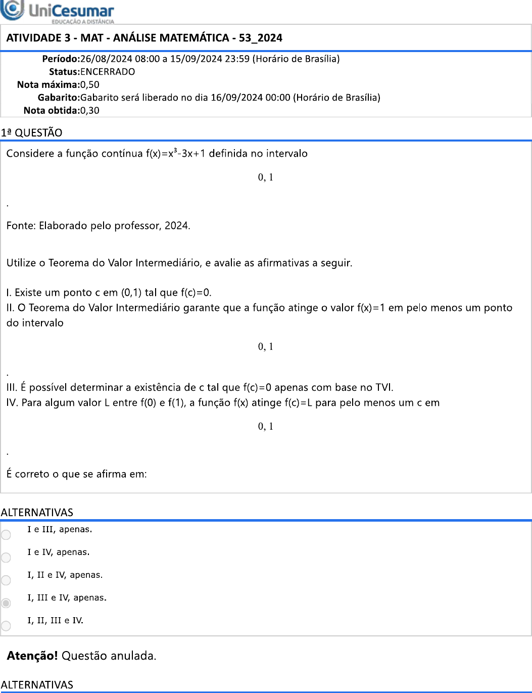 <p>UniCesumar EDUCAÇÃO A DISTÂNCIA ATIVIDADE 3 - - MAT - ANÁLISE MATEMÁTICA - 53_2024 Período:26/08/2024 08:00 a 15/09/2024 23:59 (Horário de Brasília) Status:ENCERRADO Nota máxima:0,50 Gabarito:Gabarito será liberado no dia 16/09/2024 00:00 (Horário de Brasília) Nota obtida:0,30 QUESTÃO Considere a função contínua definida no intervalo 0, 1 Fonte: Elaborado pelo professor, 2024. Utilize o Teorema do Valor Intermediário, e avalie as afirmativas a seguir. I. Existe um ponto C em (0,1) tal que f(c)=0. II. Teorema do Valor Intermediário garante que a função atinge o valor f(x)=1 em pelo menos um ponto do intervalo 0, 1 III. É possível determinar a existência de tal que f(c)=0 apenas com base no TVI. IV. Para algum valor L entre f(0) e f(1), a função f(x) atinge f(c)=L para pelo menos um em 0,1 É correto o que se afirma em: ALTERNATIVAS I e III, apenas. I e IV, apenas. I, II e IV, apenas. I, III e IV, apenas. I, II, III e IV. Atenção! Questão anulada. ALTERNATIVAS</p><p>I, apenas. II e IV, apenas. III e IV, apenas. I, III e IV, apenas. I, II, III e IV. QUESTÃO Sobre o limite de funções, avalie as asserções a seguir e a relação proposta entre elas: I. lim x-3 PORQUE II. Dado E > 0, basta tomar = Assim, 4x A respeito dessas asserções, assinale a alternativa correta: ALTERNATIVAS As asserções I e II são verdadeiras, e a II é uma justificativa correta da I. As asserções I e II são verdadeiras, mas a II não é uma justificativa correta da I. A asserção I é uma proposição verdadeira e a II é uma proposição falsa. A asserção I é uma proposição falsa e a II é uma proposição verdadeira. As asserções I e II são falsas. QUESTÃO Uma função é contínua num intervalo se, e somente se, f for contínua em todos os pontos do intervalo. DESTCH, Denise Trevisoli. CRAVEIRO, Irene Magalhães. KATO, Lilian Akemi. SCHULZ, Rodrigo RUIZ, Simone Francisco. Análise Matemática. Maringá: Unicesumar, 2020. Adaptado. Em vista do texto acima, assinale a alternativa que apresenta corretamente a relação entre as asserções abaixo. - Seja g: R R uma função definida por A função g(x) é contínua. PORQUE II - E R, g é contínua em a. ALTERNATIVAS</p><p>As asserções I e II são verdadeiras e a asserção II é uma justificativa correta para a asserção I. As asserções I e II são verdadeiras, mas a asserção II não é uma justificativa correta para a asserção I. A asserção I é verdadeira e a asserção II é falsa. A asserção I é falsa e a asserção II é verdadeira. As asserções I e II são falsas. QUESTÃO O conjunto dos números reais, explorando a sua representação geométrica, e as diversas propriedades referentes ao mesmo conjunto, extensões das propriedades dos números racionais, é admitido como axiomas. DESTCH, Denise Trevisoli. CRAVEIRO, Irene Magalhães. KATO, Lilian Akemi. SCHULZ, Rodrigo André. RUIZ, Simone Francisco. Análise Matemática. Maringá: Unicesumar, 2020. Adaptado. Com base no texto acima, considere 4 e 7 elementos do conjunto dos números reais. Analise as afirmativas a seguir: As afirmativas e estão relacionadas a: ALTERNATIVAS Propriedade Lógica Propriedade Comutativa Propriedade Associativa Propriedade Demonstrativa Propriedade de Soma e Produto QUESTÃO Embora a disciplina de Cálculo Diferencial e Integral tenha apresentado diversas técnicas de derivação de funções de uma variável, alguns casos precisam ser analisados por sua definição, que é por meio de limites. Assim, analise as afirmações a seguir e verifique a relação existente entre elas: I- A função f : R definida por é derivável no ponto X = 0, e f'(x)=1 PORQUE II- Temos que f(x)-f(0) - 0 lim = lim = lim = 1 I f(x)-f(0) - - lim = lim lim = 1 I Assinale a alternativa que apresenta a relação correta entre as afirmações.</p><p>ALTERNATIVAS As afirmações I e II são verdadeiras e a afirmação II é uma justificativa correta para a afirmação I. As afirmações I e II são verdadeiras e a afirmação II não é uma justificativa correta para a afirmação I. A afirmação I é verdadeira e a afirmação II é falsa. A afirmação I é falsa e a afirmação II é verdadeira. As afirmações I e II são falsas QUESTÃO Considere a seguinte sequência numérica 1 1 125 1 ) Analise as afirmações a seguir. - A sequência Xn possui termo igual a 1 - - A sequência Xn é monótona decrescente. III A série formada pelos termos da sequência dada, é divergente. IV - A série , cujo termo geral é 1 é convergente. É correto o que se diz em. ALTERNATIVAS I e II, apenas. I e III, apenas. II e IV, apenas. I, II e IV, apenas. I, II, III e IV. QUESTÃO</p><p>Seja f(x) uma função contínua em um intervalo fechado a, b De acordo com o Teorema do Valor Intermediário (TVI), avalie as afirmativas a seguir: I. Para qualquer valor C entre f(a) e f(b), existe um único ponto C tal que f(c)=c. II. Se então a função f(x) é sempre crescente ou decrescente no intervalo a, b III. Para todo L entre f(a) e f(b), existe pelo menos um C em (a,b) tal que f(c) = L. IV. O Teorema do Valor Intermediário garante que a função f(x) possui um máximo ou mínimo no intervalo a, b É correto o que se afirma em: ALTERNATIVAS I, apenas. III, apenas. I e III, apenas. I, III e IV, apenas. I, II, III e IV. QUESTÃO Em análise matemática, uma sequência é uma lista ordenada de números, e dizemos que uma sequência é convergente quando seus termos se aproximam de um valor específico conforme avançamos para termos subsequentes. As propriedades das sequências convergentes incluem certas características importantes que as distinguem de outras sequências. Fonte: Elaborado pelo professor, 2024. Com base nessas considerações, avalie as afirmativas a seguir. I. Uma sequência (an) é convergente se os termos an forem sempre positivos. II. Se uma sequência é convergente, então ela é também monótona. III. A definição de sequência converge