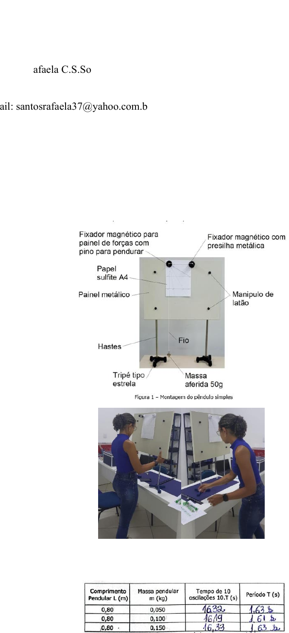<p>1</p><p>Atividade Prática Pêndulo Simples</p><p>Rafaela C.S.Soares</p><p>Centro Universitário Uninter</p><p>Av. Getúlio Vargas, 5664 - Carneirinhos, João Monlevade - MG, 35930-004</p><p>e-mail: santosrafaela37@yahoo.com.br</p><p>Resumo. O objetivo do experimento é verificar a relação do período e massa pendular da (Lei das</p><p>massas), amplitude, comprimento e a aceleração pendular. Determinar experimentalmente o valor</p><p>da aceleração gravitacional do local onde está sendo feito o experimento e por fim criar um mapa</p><p>com resultados de diferentes partes do Brasil.</p><p>Palavras-chave: (Gravidade, Pêndulos, Massa, Aceleração)</p><p>Introdução</p><p>Um pêndulo é um sistema composto por</p><p>uma massa acoplada a um pivô que permite sua mo-</p><p>vimentação livremente. A massa fica sujeita à força</p><p>restauradora causada pela gravidade.</p><p>Existem inúmeros pêndulos estudados por</p><p>físicos e utilizado por engenheiros, já que estes des-</p><p>crevem-no como um objeto de fácil previsão de mo-</p><p>vimentos e que possibilitou inúmeros avanços tec-</p><p>nológicos, mas o modelo mais simples, e que tem</p><p>maior utilização é o Pêndulo Simples.</p><p>O movimento do pêndulo simples pode se</p><p>constituir num exemplo de movimento harmônico</p><p>simples desde que o movimento seja restrito a pe-</p><p>quenas oscilações, ou seja, o ângulo de abertura do</p><p>pêndulo, amplitude, é muito pequeno. Este experi-</p><p>mento será realizado considerando está restrição,</p><p>isto é, o ângulo máximo que o fio pode formar com</p><p>a vertical deve ser menor que 10º. Iremos testar está</p><p>restrição verificando a relação existente entre o pe-</p><p>ríodo pendular e a amplitude do pêndulo.</p><p>Também fará parte deste experimento a ve-</p><p>rificação da relação entre o período do pêndulo e</p><p>sua massa pendular e a relação entre o período e o</p><p>comprimento pendular.</p><p>Procedimento Experimental</p><p>Conforme descrito anteriormente o experimento</p><p>tem como objetivo de comparar o comprimento do fio</p><p>e a variação angular através das oscilações,</p><p>comparando o ângulo e a amplitude com a variação de</p><p>massas. Foi montado painel conforme figura 1 , usando</p><p>massa pendular de 50g, com um fio de linha com</p><p>comprimento de L= 0,80 m. Após montado conforme</p><p>roteiro da atividade prática é necessário fazer medições</p><p>de 10 oscilações mantendo o comprimento L e o ângulo</p><p>inicial.</p><p>Figura 2 - Registro de aluno durante o experimento</p><p>Tabela 1- Ralação entre período e a massa pendular</p><p>Na segunda etapa a proposta feita, foi verificar a</p><p>variação do ângulo inicial mantendo o comprimento (L)</p><p>da linha e com a mesma massa de 50g, repetindo 3</p><p>xxxxxxxxxxxx</p><p>##</p><p>####</p><p>2</p><p>vezes em 10 oscilações e verificar um valor mais exato,</p><p>conforme feito na primeira parte do experimento.</p><p>Tabela 2 – Relação entre o período e a amplitude</p><p>Para finalizar o experimento seria necessário</p><p>encontrar a gravidade no local onde o experimento</p><p>estava sendo realizado, nessa etapa foi mantida a massa</p><p>de 50g e o ângulo inicial de partida, porém tivemos</p><p>variação no comprimento ( L) do pêndulo, para</p><p>assim podermos analisar em cenários adversos os</p><p>valores de gravidade e assim que os valores forem</p><p>coletados eles daria a gravidade aproximada do</p><p>local onde o experimento foi realizado.</p><p>Tabela 3 – Relação entre o período e o comprimento pendular</p><p>Análise e Resultados</p><p>Nessa etapa foi solicitado a construção de um</p><p>gráfico do período T versus o comprimento do fio L,</p><p>qual o aspecto da curva apresentado no gráfico e a</p><p>equação da curva.</p><p>Gráfico 1- Período T x Comprimento L</p><p>Equação: T = -1,7665L2 + 3,4569L+ 0,0173</p><p>(Parábola)</p><p>Em seguida foi solicitado que fosse realizado a</p><p>mudança de variável elevando o período T2 e construir</p><p>um novo gráfico T2 versus o comprimento do fio de</p><p>linha (L)para linearizar o gráfico.</p><p>Gráfico 2 – Período do T2 x Comprimento L</p><p>É possível notar que o período elevado ao quadrado</p><p>a linha tem a tendência de se tornar mais linear, assim</p><p>modificando a equação para uma equação de segundo</p><p>grau.</p><p>E por fim foi período e o comprimento pendular são</p><p>relacionados pela expressão:</p><p>𝟒𝝅𝟐</p><p>𝒈</p><p>= 𝟑, 𝟖𝟏𝟑𝟒</p><p>𝟒𝝅𝟐</p><p>𝟑, 𝟖𝟏𝟑𝟒</p><p>= 𝒈</p><p>𝒈 = 𝟏𝟎, 𝟑𝟓 𝐦/𝐬𝟐</p><p>Figura3 - Localização Geográfica do Polo</p><p>Aceleraçã</p><p>o da</p><p>Período T</p><p>(s)</p><p>gravidade</p><p>local g</p><p>(m/s2)</p><p>10T1 10T2 10T3 10Tmédio T2</p><p>0,75 15,93 16,24 16,52 16,23 1,623 2,634129 11,24</p><p>0,7 15,82 15,78 15,97 15,85 1,585 2,514127 10,991</p><p>0,65 15,05 14,74 15,08 14,95 1,495 2,235025 11,481</p><p>0,6 13,83 14,27 14,27 14,12 1,412 1,993744 11,88</p><p>0,55 13,62 13,96 13,04 13,54 1,354 1,833316 11,843</p><p>0,5 12,56 13,31 12,75 12,87 1,287 1,656369 11,917</p><p>0,45 11,66 12,19 12,51 12,12 1,212 1,468944 12,093</p><p>0,4 11,18 11,27 11,32 11,25 1,125 1,265625 12,477</p><p>0,35 11,14 10,8 10,63 10,89 1,089 1,185921 11,651</p><p>11,675</p><p>1,681 2,825761 11,176</p><p>Valor aceleração</p><p>gravidade médio:</p><p>Comprimento</p><p>Pendular L (m)</p><p>Tempo de 10 oscilações 10T (s)</p><p>0,8 16,32 17,87 16,31 1,681</p><p>3</p><p>Conclusão</p><p>O experimento realizado consistiu na análise do</p><p>comportamento de pêndulos simples sob diferentes</p><p>condições, variando comprimento, massa e</p><p>amplitude. Os objetivos incluíam investigar a</p><p>relação entre período e comprimento do pêndulo,</p><p>bem como entender como a amplitude afeta o</p><p>período de oscilação. Os resultados revelaram u