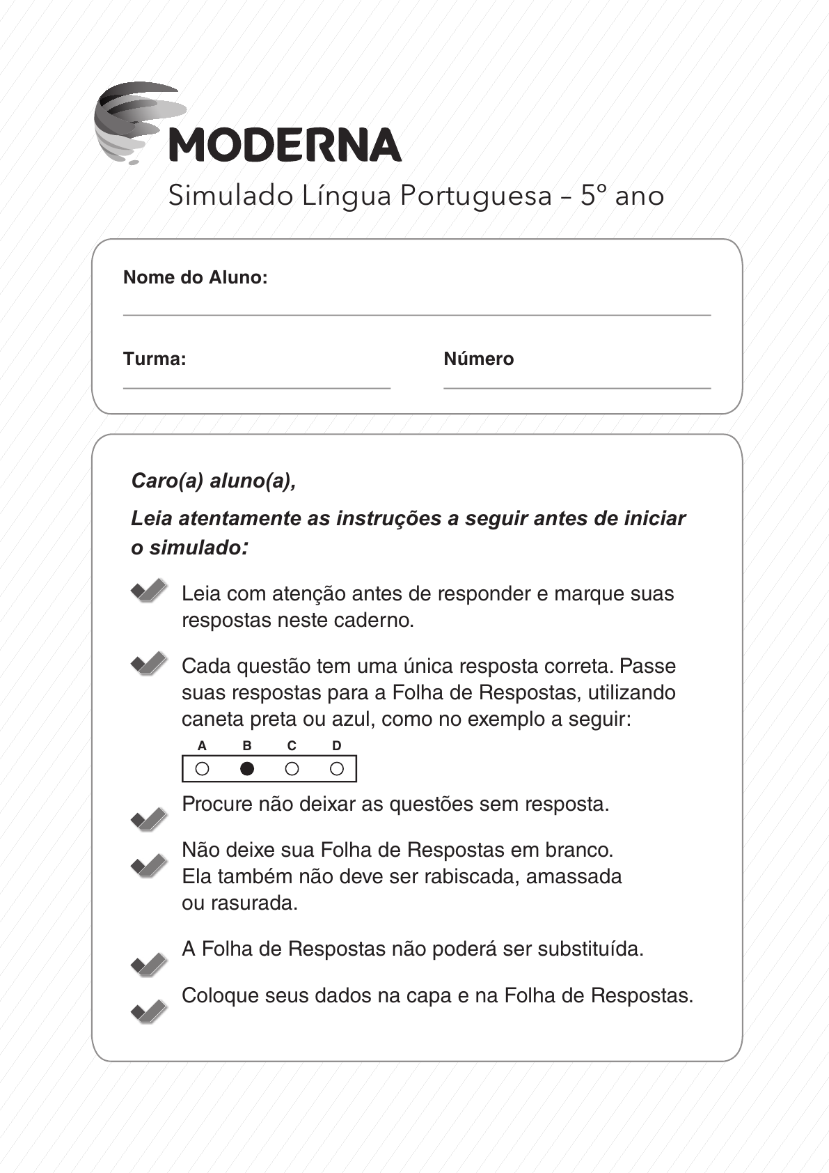 <p>Caro(a) aluno(a),</p><p>Leia atentamente as instruções a seguir antes de iniciar</p><p>o simulado:</p><p>Leia com atenção antes de responder e marque suas</p><p>respostas neste caderno.</p><p>Cada questão tem uma única resposta correta. Passe</p><p>suas respostas para a Folha de Respostas, utilizando</p><p>caneta preta ou azul, como no exemplo a seguir:</p><p>A B C D</p><p>Procure não deixar as questões sem resposta.</p><p>Não deixe sua Folha de Respostas em branco.</p><p>Ela também não deve ser rabiscada, amassada</p><p>ou rasurada.</p><p>A Folha de Respostas não poderá ser substituída.</p><p>Coloque seus dados na capa e na Folha de Respostas.</p><p>Turma: Número</p><p>Nome do Aluno:</p><p>Simulado Língua Portuguesa – 5º ano</p><p>3 LÍNGUA PORTUGUESA</p><p>www.moderna.com.br</p><p>QUESTÃO 1–··–··–··–··–··–··–··–··–··–··–··–··–··–··–··–··–··–··–··–··–··–··–··–··–··–··–··–··–··–··–··–</p><p>Os dois ladrões</p><p>Dois ladrões de animais furtaram certa vez um burro e, como não pudessem reparti-lo em dois peda-</p><p>ços, surgiu a briga.</p><p>― O burro é meu! ― alegava um. ― O burro é meu porque o vi primeiro…</p><p>― Sim ― argumentava o outro ―, você o viu primeiro―; mas quem primeiro o segurou fui eu. Logo,</p><p>é meu…</p><p>Não havendo acordo possível, engalfinharam-se, rolaram na poeira aos socos e dentadas. Enquanto</p><p>isso um terceiro ladrão surge, monta no burro e foge a galope. Finda a luta, quando os ladrões se ergue-</p><p>ram, moídos da sova, rasgados, esfolados…</p><p>― Que foi feito do burro?</p><p>Nem sombra! Riram-se risadinha amarela ― e um deles, que sabia latim, disse:</p><p>― Inter duos litigantes tertius gaudet, que quer dizer: quando dois brigam, lucra um terceiro mais</p><p>esperto.</p><p>LOBATO, Monteiro. Fábulas. 20. ed. São Paulo: Brasiliense, 1964. p. 42.</p><p>Uma das características da fábula é</p><p>A organizar-se em torno de uma lenda.</p><p>B possuir caráter de fundo moral.</p><p>C ter propósito exclusivamente narrativo.</p><p>D usar linguagem predominantemente objetiva.</p><p>QUESTÃO 2–··–··–··–··–··–··–··–··–··–··–··–··–··–··–··–··–··–··–··–··–··–··–··–··–··–··–··–··–··–··–··–</p><p>Disponível em: www.saude.gov.br/campanhas/46452-coronavirus. Acesso em: 04 mar. 2020.</p><p>Sobre o texto apresentado, é correto afirmar que</p><p>A foi publicado num jornal impresso para atingir rapidamente a toda a população.</p><p>B tem como destinatários os médicos, que lidam com os pacientes infectados pela COVID-19.</p><p>C indica um telefone, que deve ser utilizado por aqueles que apresentarem os sintomas.</p><p>D faz parte de uma campanha governamental para todo o país, visando combater uma doença.</p><p>4 LÍNGUA PORTUGUESA</p><p>www.moderna.com.br</p><p>QUESTÃO 3–··–··–··–··–··–··–··–··–··–··–··–··–··–··–··–··–··–··–··–··–··–··–··–··–··–··–··–··–··–··–··–</p><p>O caracol e a pitanga</p><p>(1) Há dois dias o caracol galgava lentamente o tronco da pitangueira, subindo e parando, parando e</p><p>subindo. Quarenta e oito horas de esforço tranquilo, de caminhar quase filosófico.</p><p>(2) De repente, enquanto fazia mais um movimento para avançar, desceu pelo tronco, apressadamente, no</p><p>seu passo fustigado e ágil, uma formiga-maluca, dessas que vão e vêm mais rápidas do que coelho de desenho</p><p>animado.</p><p>(3) Parou um instantinho, olhou zombeteira o caracol e disse: “Volta, volta, velho! Que é que você vai</p><p>fazer lá em cima? Não é tempo de pitanga”.</p><p>(4) “Vou indo, vou indo” ― respondeu calmamente o caracol. ― “Quando eu chegar lá em cima vai</p><p>ser tempo de pitanga.”</p><p>FERNANDES, Millôr. O caracol e a pitanga. In: Fábulas fabulosas. Rio de Janeiro: Nórdica, s/d. p. 67 (fragmento).</p><p>O trecho que corresponde à etapa da narrativa chamada complicação é o de número</p><p>A 1 B 2 C 3 D 4</p><p>QUESTÃO 4–··–··–··–··–··–··–··–··–··–··–··–··–··–··–··–··–··–··–··–··–··–··–··–··–··–··–··–··–··–··–··–</p><p>Disponível em: www.saude.gov.br/campanhas/46452-coronavirus. Acesso em: 19 mar. 2020.</p><p>Depois de ler atentamente o texto anterior – as informações escritas e as ilustrações –, assinale a afirmação</p><p>correta sobre ele.</p><p>A Quer convencer as pessoas que o lerem a comprar produtos específicos, como sabão e álcool gel.</p><p>B Seu objetivo é levar as pessoas a aprender como fazer algo considerado importante.</p><p>C Usa verbos no modo imperativo – lave, cubra, entre outros –, indicando ações que acontecem no presente.</p><p>D Pode-se perceber que quem divulga o texto é o Ministério da Saúde, e que se dirige a médicos e enfermeiros.</p><p>5 LÍNGUA PORTUGUESA</p><p>www.moderna.com.br</p><p>QUESTÃO 5–··–··–··–··–··–··–··–··–··–··–··–··–··–··–··–··–··–··–··–··–··–··–··–··–··–··–··–··–··–··–··–</p><p>Disponível em: www.saude.gov.br/images/campanhas/hepatite_c/Cartaz-Hepatite-C-64x46.JPG. Acesso em: 21 mar. 2020.</p><p>Observe a chamada da campanha: “Se você fez cirurgia antes de 1993, precisa fazer o teste para hepatite C”.</p><p>Dessa chamada infere-se que essa campanha tem como objetivo</p><p>A alertar o leitor para se prevenir contra a hepatite C.</p><p>B chamar atenção para um serviço prestado pelo SUS.</p><p>C criticar pessoas que não cuidam da saúde.</p><p>D esclar