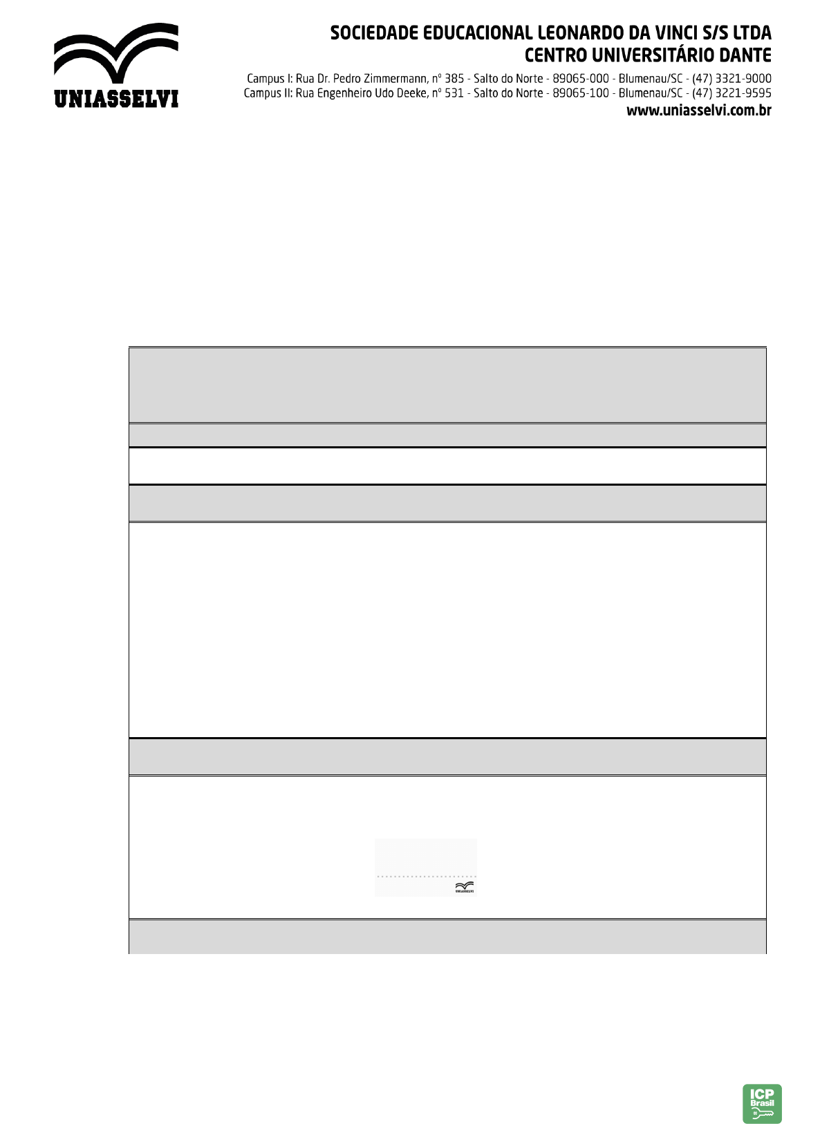 <p>ANEXO 01</p><p>MODELO DE IDENTIFICAÇÃO PROJETO DE</p><p>PESQUISA – Artigo 170 e 171 / SC</p><p>MODELO DE PROJETOS DE PESQUISA – IC</p><p>Artigo 170 e 171 / SC</p><p>1. TÍTULO DO PROJETO</p><p>2. PARTICIPANTES</p><p>1.1.1.1 ORIENTADOR</p><p>Nome:...................................................................CPF:.............................................</p><p>Titulação.....................................................................................................................</p><p>Endereço residencial:...............................................................................................</p><p>CEP:....................................Cidade:........................................:..........Fone:..............</p><p>1.1.1.2 BOLSISTA</p><p>Nome:..................................................................................................Fone:..............</p><p>Curso:.......................................................Semestre:.................................................</p><p>Carga horária disponível:..........................................................................................</p><p>Média geral:...............................................................................................................</p><p>3. DECLARAÇÃO DO ORIENTADOR</p><p>Declaro que me comprometo a orientar o acadêmico de acordo com o plano de trabalho</p><p>explícito na proposta de pesquisa e coordenar da melhor forma as atividades da pesquisa.</p><p>Local/ Data:..................................................................Assinatura:............................................</p><p>CLARAÇÃO DO ACADÊMICO PESQUISADOR</p><p>Esse documento foi assinado por Bruna Cavilia Scharf . Para validar o documento e suas assinaturas acesse</p><p>https://assinador.uniasselvi.com.br/validate/Z5J3Y-LFMSX-V5FNX-VACSG</p><p>Assinado eletronicamente por:</p><p>Bruna Cavilia Scharf</p><p>CPF: ***.111.219-**</p><p>Data: 30/06/2022 20:03:01 -03:00</p><p>Declaro que não recebo qualquer tipo de apoio de órgãos financiadores de pesquisa e que</p><p>disponho de tempo para a realização deste projeto, de acordo com o programa de trabalho</p><p>detalhado no mesmo.</p><p>Local/Data:..................................................................Assinatura:..............................................</p><p>5. INTRODUÇÃO (Introduz o assunto, com começo, meio e fim, em fonte Times New</p><p>Roman 12, espaçamento 1,5. Precisa estar amparado pelos autores utilizados na</p><p>pesquisa sendo devidamente referenciado).</p><p>6. OBJETIVOS</p><p>6.1 – OBJETIVO GERAL</p><p>6.2 – OBJETIVOS ESPECÍFICOS</p><p>7. JUSTIFICATIVA (Destaca os motivos pelas quais o projeto é relevante para a área de</p><p>conhecimento, e por quais motivos os avaliadores do projeto precisam aprovar a</p><p>proposta. Sempre existe a necessidade de que o acadêmico e orientador amparem suas</p><p>justificativas em outros autores de destaque, para que assim fique evidente a</p><p>importância da pesquisa que está sendo feita. Utilizar fonte Times New Roman 12,</p><p>espaçamento 1,5).</p><p>8. METODOLOGIA (Descreve a metodologia para alcançar os objetivos propostos no</p><p>projeto submetido, em fonte Times New Roman 12, espaçamento 1,5).</p><p>Esse documento foi assinado por Bruna Cavilia Scharf . Para validar o documento e suas assinaturas acesse</p><p>https://assinador.uniasselvi.com.br/validate/Z5J3Y-LFMSX-V5FNX-VACSG</p><p>MANIFESTO DE</p><p>ASSINATURAS</p><p>Código de validação: Z5J3Y-LFMSX-V5FNX-VACSG</p><p>Esse documento foi assinado pelos seguintes signatários nas datas indicadas (Fuso</p><p>horário de Brasília):</p><p>Bruna Cavilia Scharf (CPF ***.111.219-**) em 30/06/2022 20:03 - Assinado</p><p>eletronicamente</p><p>Endereço IP Geolocalização</p><p>187.85.181.74</p><p>Lat: -26,862672 Long: -49,091827</p><p>Precisão: 1430 (metros)</p><p>Autenticação bruna.sharf@uniasselvi.com.br (Verificado)</p><p>Login</p><p>2dFLXoMah54+9ZMflPsG0yEVfKTqtp5OEsoA1kGiBXs=</p><p>SHA-256</p><p>Para verificar as assinaturas, acesse o link direto de validação deste documento:</p><p>https://assinador.uniasselvi.com.br/validate/Z5J3Y-LFMSX-V5FNX-VACSG</p><p>.</p><p>Ou acesse a consulta de documentos assinados disponível no link abaixo e informe</p><p>o código de validação:</p><p>https://assinador.uniasselvi.com.br/validate</p><p>.</p>