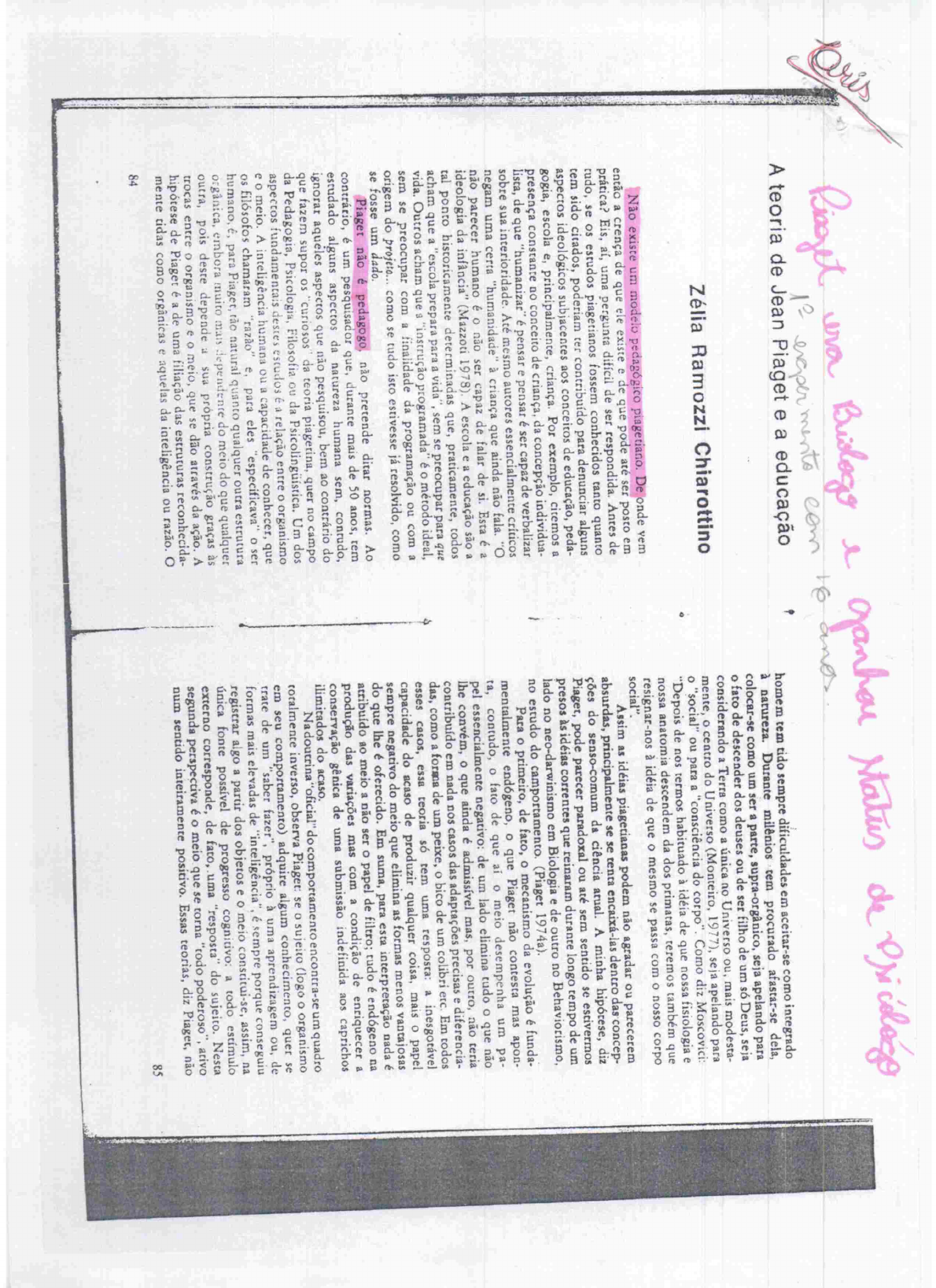 <p>e de era A teoria de Jean Piaget e a educação homem tem tido sempre dificuldades em aceitar-se como integrado à natureza. Durante milênios tem procurado afastar-se dela, colocar-se como um ser a parte, supra-orgânico, seja apelando para fato de descender dos deuses ou de ser filho de um só Deus, seja considerando a Terra como a única no Universo ou, mais modesta- Zélia Ramozzi Chiarottino mente, o centro do Universo (Monteiro, 1977), seja apelando para "social" ou para a "consciência do Como diz Moscovici: "Depois de nos termos habituado à idéia de que nossa fisiologia e nossa anatomia descendem da dos primatas, teremos também que Não existe um modelo pedagógico De onde vem resignar-nos à idéia de que mesmo se passa com nosso corpo então a crença de que ele existe e de que pode até ser posto em social" prática? Eis, aí, uma pergunta difícil de ser respondida. de Assim as idéias piagetianas podem não agradar ou parecerem absurdas, principalmente se se tenta encaixá-las dentro das concep- tudo, se estudos fossem conhecidos tanto quanto tem sido citados, poderiam ter contribuído para denunciar alguns ções do senso-comum da ciência atual. A minha hipótese, diz aspectos ideológicos subjacentes aos conceitos de educação, peda- Piaget, pode parecer paradoxal ou até sem sentido se estivermos gogia, escola e, criança. Por exemplo, citemos a presos idéias correntes que reinaram durante longo tempo de um presença constante no conceito de criança, da concepção individua- lado no neo-darwinismo em Biologia e de outro no Behaviorismo, lista, de que "humanizar" é pensar e pensar é ser capaz de verbalizar no estudo do camportamento. (Piaget 1974a). sobre sua Até mesmo autores essencialmente Para primeiro, de fato, mecanismo da evolução é funda- negam uma certa "humanidade" à criança que ainda não fala. "O mentalmente endógeno, que Piaget não contesta mas apon- não parecer humano é não ser capaz de falar de si. Esta é a ta, contudo, fato de que ai meio desempenha um pa- ideologia da infância" (Mazzoti A escola e a educação são a pel essencialmente negativo: de um lado elimina tudo que não tal ponto historicamente determinadas que, praticamente, todos lhe convém, que ainda é admissível mas, por outro, não teria contribuído em nada nos casos das adaptações precisas e diferencia- acham que a "escola prepara para a vida", sem se preocupar para que vida. Outros acham que 9 "instrução é método ideal, das, como a forma de um peixe, bico de um colibri etc. Em todos esses casos, essa teoria só tem uma resposta: a inesgotável sem se preocupar com a finalidade da programação ou com a origem do como se tudo isto estivesse já resolvido, como capacidade do acaso de produzir qualquer coisa, mais papel se fosse um dado. sempre negativo do meio que elimina as formas menos vantajosas Piaget não é pedagogo não pretende ditar normas. Ao do que lhe é oferecido. Em suma, para esta interpretação nada é contrário, é um pesquisacor que, durante mais de 50 anos, tem atribuído meio a não ser papel de filtro; tudo é endógeno na estudado alguns aspectos da natureza humana sem, produção das variações mas com a condição de enriquecer a ignorar aqueles aspectos que não pesquisou, bem ao contrário do conservação gênica de uma submissão indefinida aos caprichos que fazem supor os da teoria piagerina, quer no campo ilimitados do acaso. adoutrina do comportamento encontra-se um quadro da Pedagogia, Psicologia, Filosofia ou da Um dos totalmente inverso, observa se sujeito (logo organismo aspectos fundamentais estudos é a relação entre organismo em seu adquire algum conhecimento, quer se e o meio. A inteligência humana ou a capacidade de conhecer, que trate de um saber fazer", próprio à uma aprendizagem ou, de os filósofos chamaram "razão" e. para eles "especificava" o ser formas mais elevadas de "inteligência", é sempre porque conseguiu humano, para Piaget, natural quanto qualquer outra estrutura registrar algo a partir dos objetos e meio constitui-se, assim, na orgânica, embora muito do meio do que qualquer única fonte possível de progresso cognitivo: a todo estímulo outra, pois deste depende sua própria construção graças às externo corresponde, de fato, uma "resposta" do sujeito. Nesta trocas entre organismo e meio, que se dão através da ação. A hipótese de Piaget é a de uma filiação das estruturas reconhecida- segunda perspectiva é meio que se torna "rodo num sentido inteiramente positivo. Essas teorias, diz não mente tidas como orgânicas e aquelas da inteligência ou razão. 84 85</p><p>são necessariamente contraditórias, pois neo-darwinismo ocupa- se da hereditariedade genotípica e behaviorismo das reações Por exemplo, esquema de sugar corresponde ao saber sugar essencialmente fenotípicas, portanto, não hereditárias. Se ambas independente do que é sugado. esquema tende a assimilar tivessem razão, isto quereria dizer que meio desempenha um todo objeto, de tal maneira que uma vez construído (no caso de papel negativo no plano genotípico e essencialmente positivo no sugar), a criança tende a sugar tudo que toca. Depois, com a fenotípico. Isso seria até possível se não houvesse relações entre construção dos esquemas de olhar e pegar, tentará pegar e assim por diante. Os novos esquemas resultam sempre dos anteriores, na esses dois planos. A hipótese de Piaget contraria as hipóteses clássicas. Para ele, medida em que uma coordenação destes últimos. A papel do meio, tanto no caso das variações genotípicas como no construção de esquemas se explicaria pelo processo de adaptação, caso de comportamento ou do conhecimento, não deve ser baseado como já foi mencionado, com seus dois pólos complementares: nas ações negativas (pura seleção) ou positivas (esquema S-R) mas, assimilação e acomodação. Incialmente, a assimilação consiste em nas ações que organismo ou sujeito 